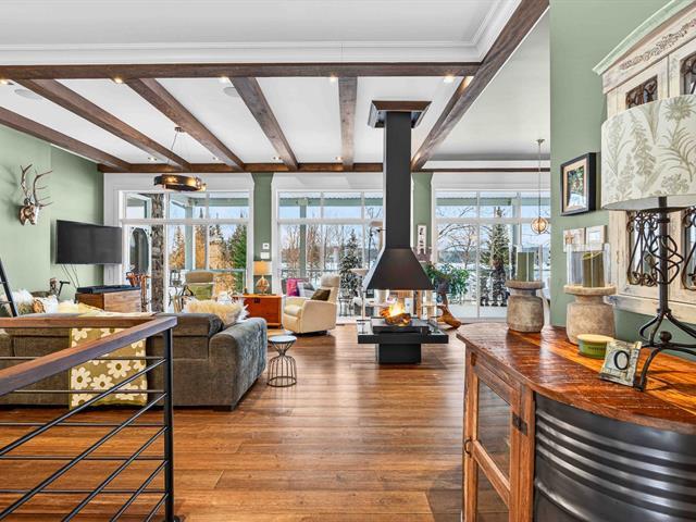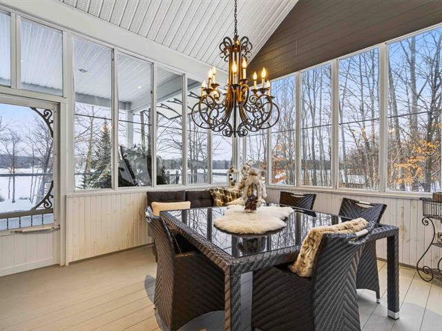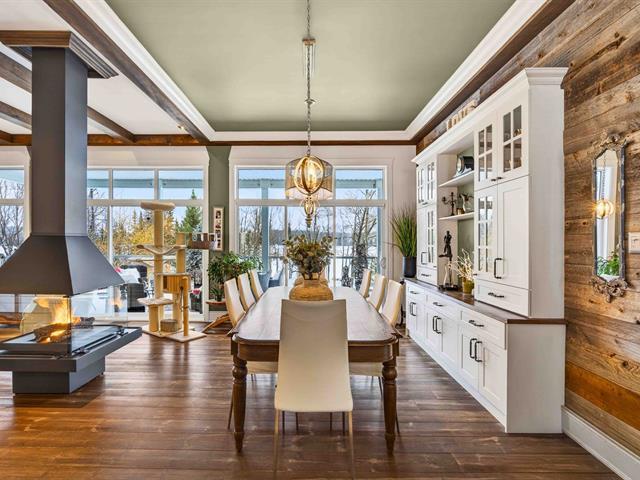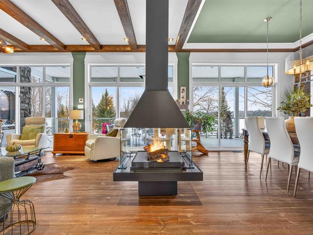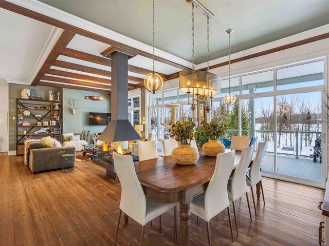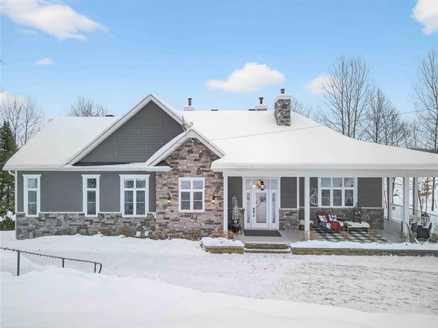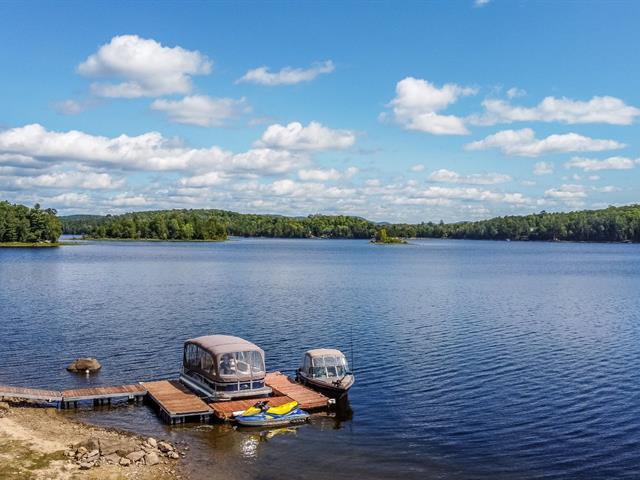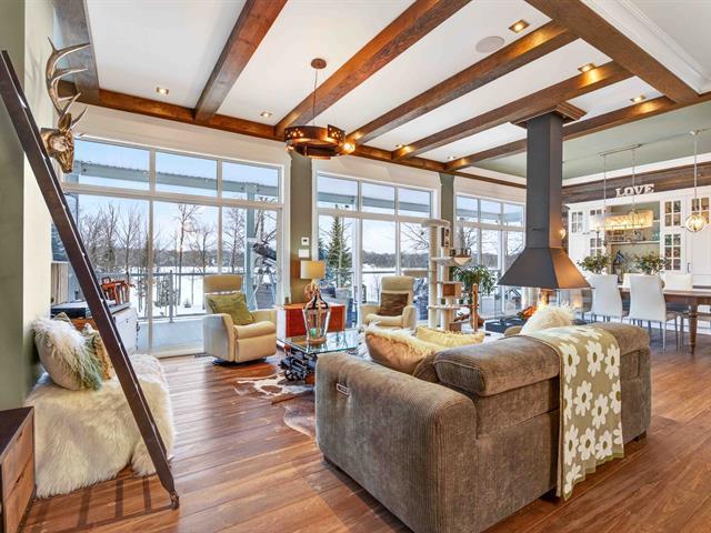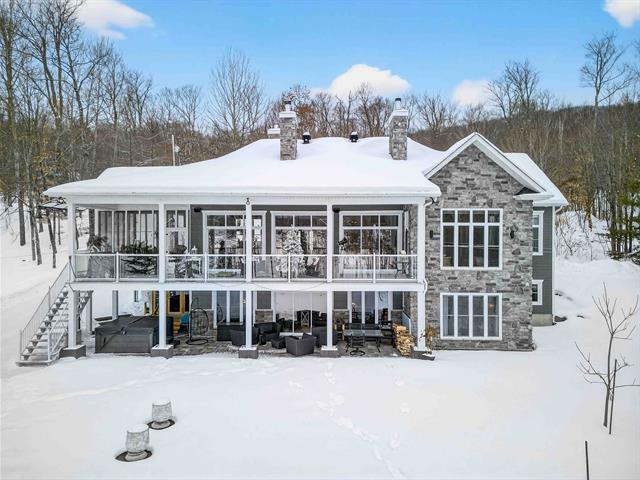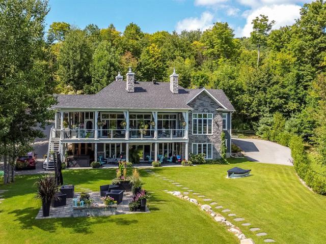 Prestige waterfront property on Lac Cuillèrier, with direct access to Lac du Poisson Blanc and over 100 km of navigable waterways connecting multiple lakes. Impressive 360 ft of waterfront (526 ft including adjacent lot with private boat launch). Expansive terrace and balcony offering breathtaking views. Remarkable bungalow with walk-out garden level. Open-concept, warm and spacious living area featuring 5 bedrooms plus office, laundry room, 2 full bathrooms and a powder room. Propane fireplace, wood stove, integrated generator, oversized double garage with golf simulator. Over 82,000 sq. ft. landscaped lot with veranda, spa and sauna. (46047771)