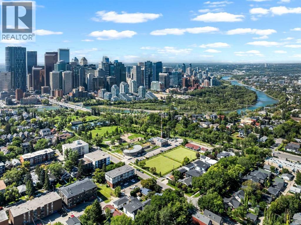 Aerial view of subject property and its proximity to parks, paths, and DT Calgary