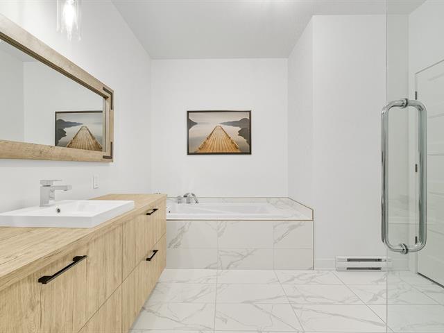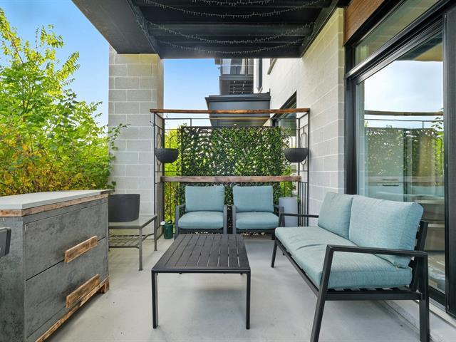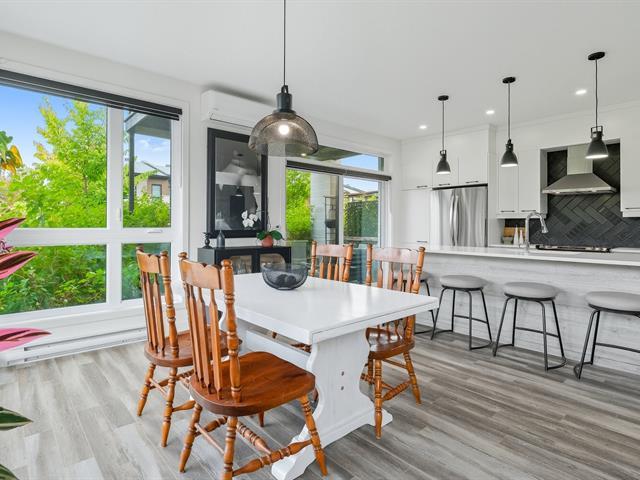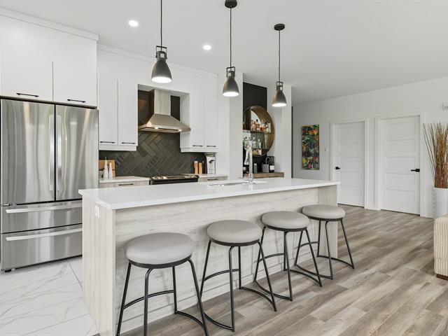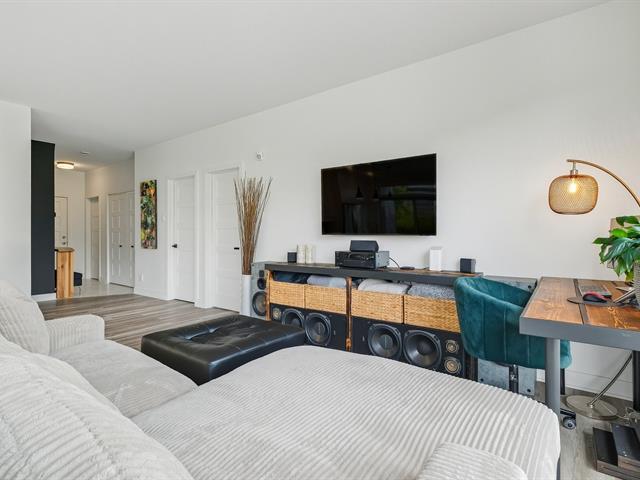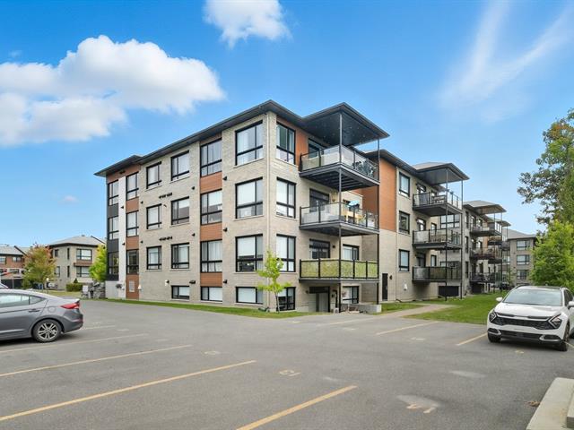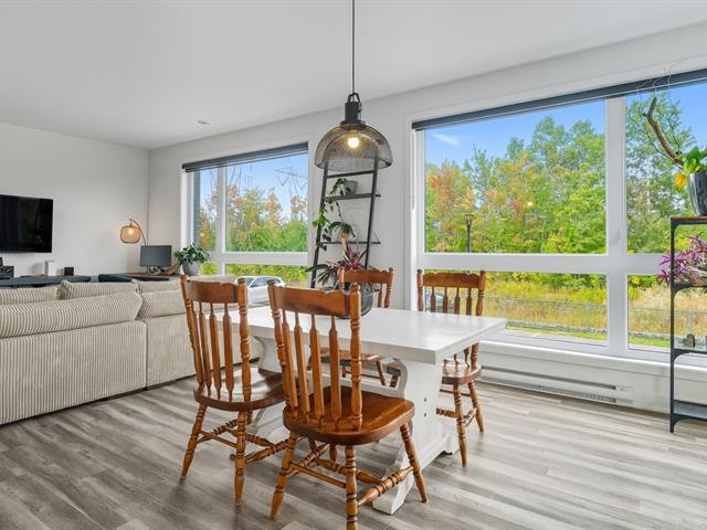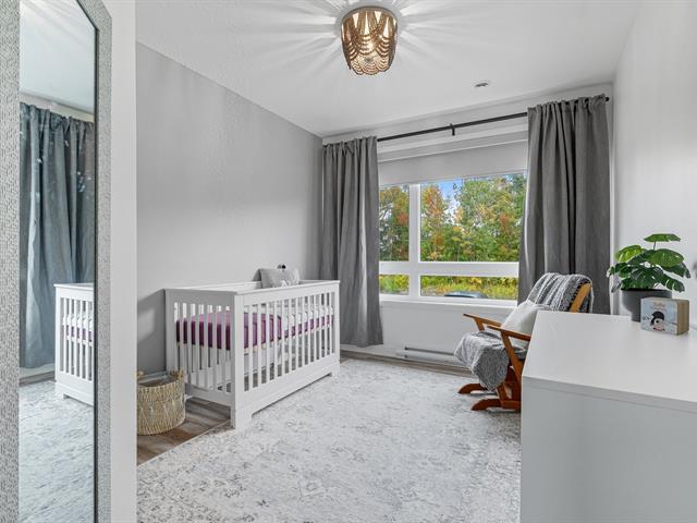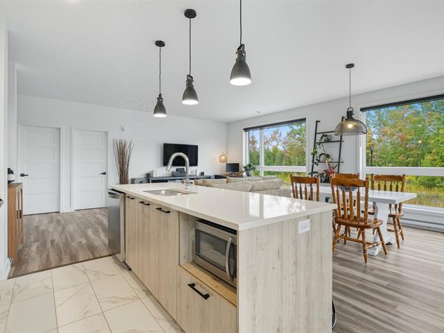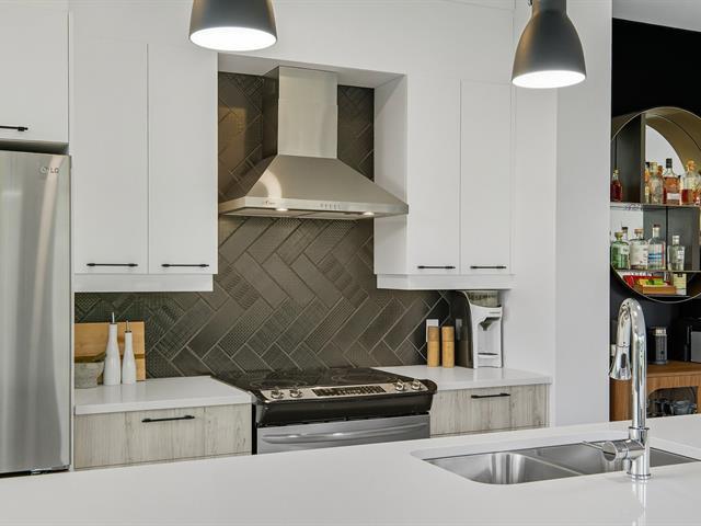 Modern and bright condo in Faubourg Cousineau! Open living area with large central island, full-height cabinets, and contemporary ceramic backsplash. Oversized windows provide beautiful natural light and a view of the greenery, with no side neighbors. Two good-sized bedrooms, bathroom with ceramic shower and separate bathtub, enclosed laundry room, intimate balcony, and parking. All in a strategic location, close to schools, shops, public transportation, and major highways. (50870752)