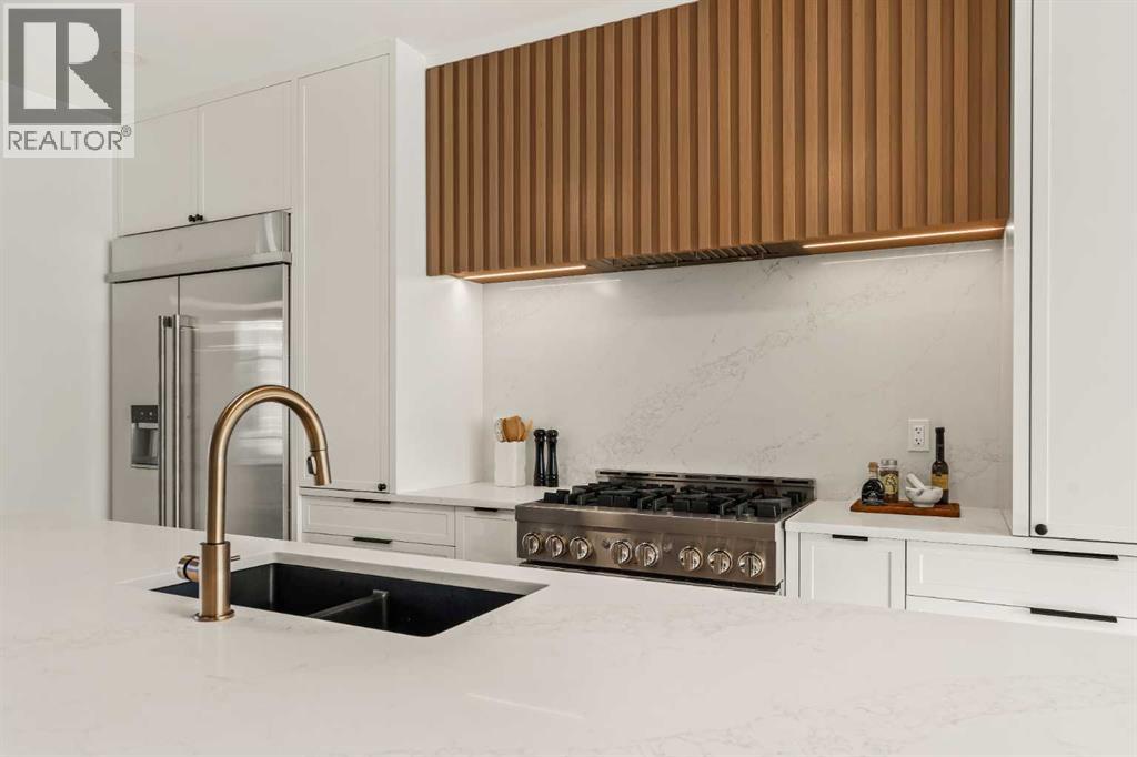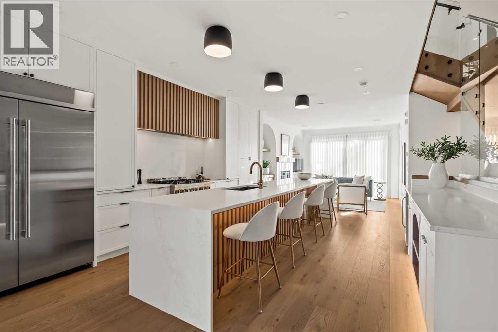 Stunning luxury 3-storey semi-detached residence offering 4 bedrooms, 4.5 bathrooms, a private south-facing backyard, fully air conditioned & ideally located in the heart of highly sought-after Altadore. Showcasing exceptional curb appeal with a gorgeous front elevation, this modern home is filled with natural light from expansive windows & features, thoughtful design & high-end upgrades throughout.The inviting front entry is both stylish & functional, complete with a built-in bench, coat hooks, & smart shoe storage. A front dining room sets the stage for elegant entertaining, while the heart of the home is the extensively upgraded central kitchen, anchored by a large waterfall island. Highlights include full-height cabinetry, deep lower drawers, soft-close hardware, a built-in pantry, & custom hood fan. Premium JennAir stainless steel appliances include a French-door refrigerator, gas range, built-in microwave, garburator & dishwasher. Across from the island, additional built-in cabinetry & counter space feature a beverage cooler.The rear living room is warm & refined, centred around a gas fireplace with recessed built-ins & custom millwork. Ten-foot-wide sliding patio doors open onto a south-facing exposed aggregate deck, seamlessly blending indoor & outdoor living. A spacious rear mudroom offers a closet, bench, & coat hooks, along with a private powder room featuring a vessel sink & sleek linear mirror.The second level includes the primary retreat featuring a generous bedroom & a spa-inspired 5-piece ensuite with a freestanding soaker tub surrounded by floor-to-ceiling tile, heated floors, a custom walk-in glass steam shower with rainfall shower head & built-in bench, dual vanity, & a walk-in closet with custom organizers, drawers, and a full-height mirror. Two additional bedrooms, complemented by a beautiful 4-piece bathroom & a thoughtfully designed laundry room with abundant cabinetry, counter space, & sink.The third level offers incredible flexibility wi th a bright loft-style bonus room featuring a built-in media centre & wet bar with beverage cooler, a separate home office, a full four-piece bathroom, & access to a private south-facing balcony. This level can also easily function as a studio-style 5th bedroom.The fully developed lower level is equally impressive, featuring a family room with wet bar & custom cabinetry, a 10-foot-wide glass-enclosed home gym with rubber flooring, a 4th bedroom, & a 3-piece bathroom. This level is roughed-in for in-floor heating. Built-in speakers are installed throughout the home & centrally wired to the mechanical room, & the property is also roughed-in for a central vacuum system.Outside, the backyard has been upgraded with turf for low-maintenance living, while the deck offers the perfect space for outdoor furniture. Altadore remains one of Calgary’s most desirable inner-city communities, offering quick access to Glenmore Athletic Park, Marda Loop, River Park off-leash, Sandy Beach, schools and more! (31533758)