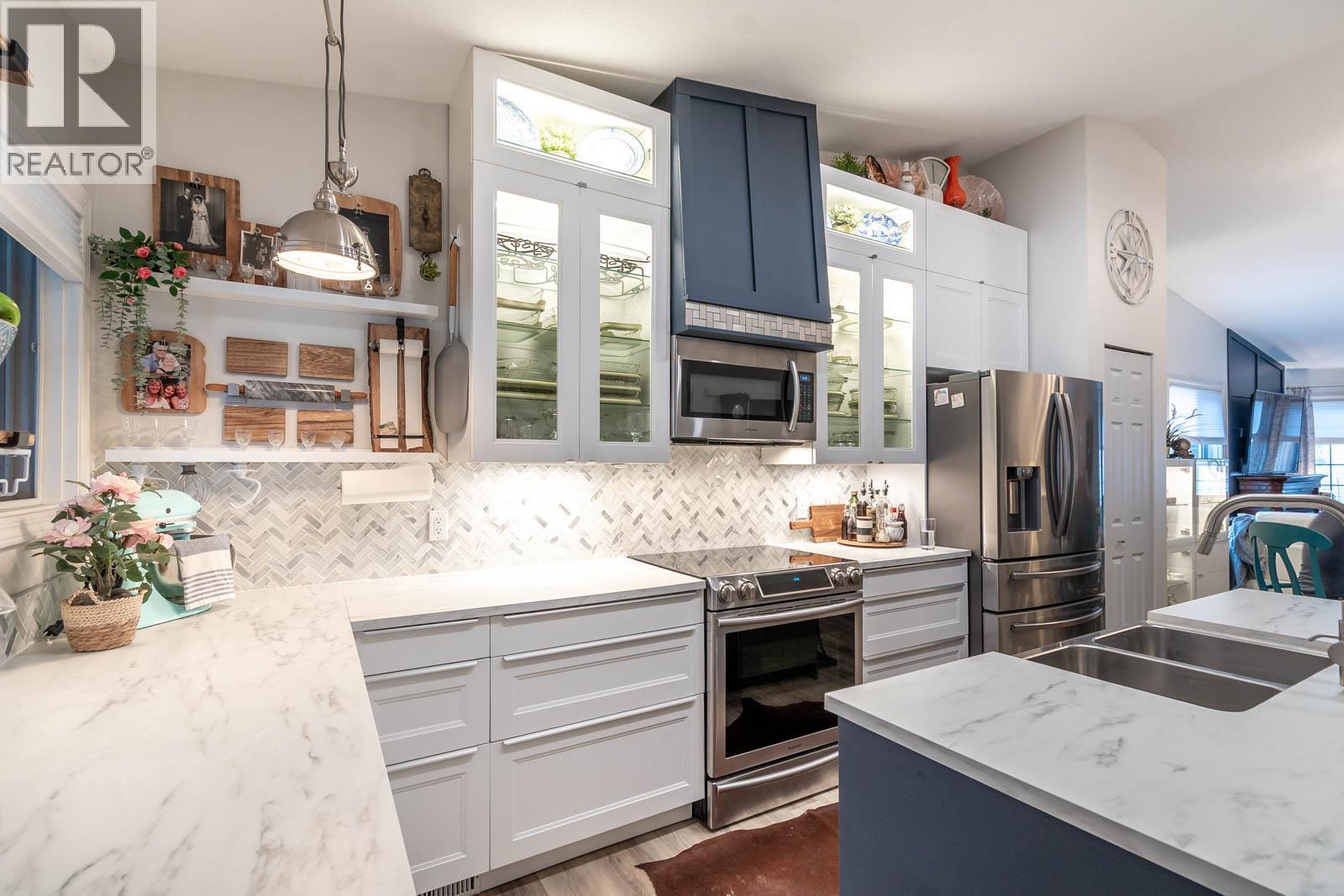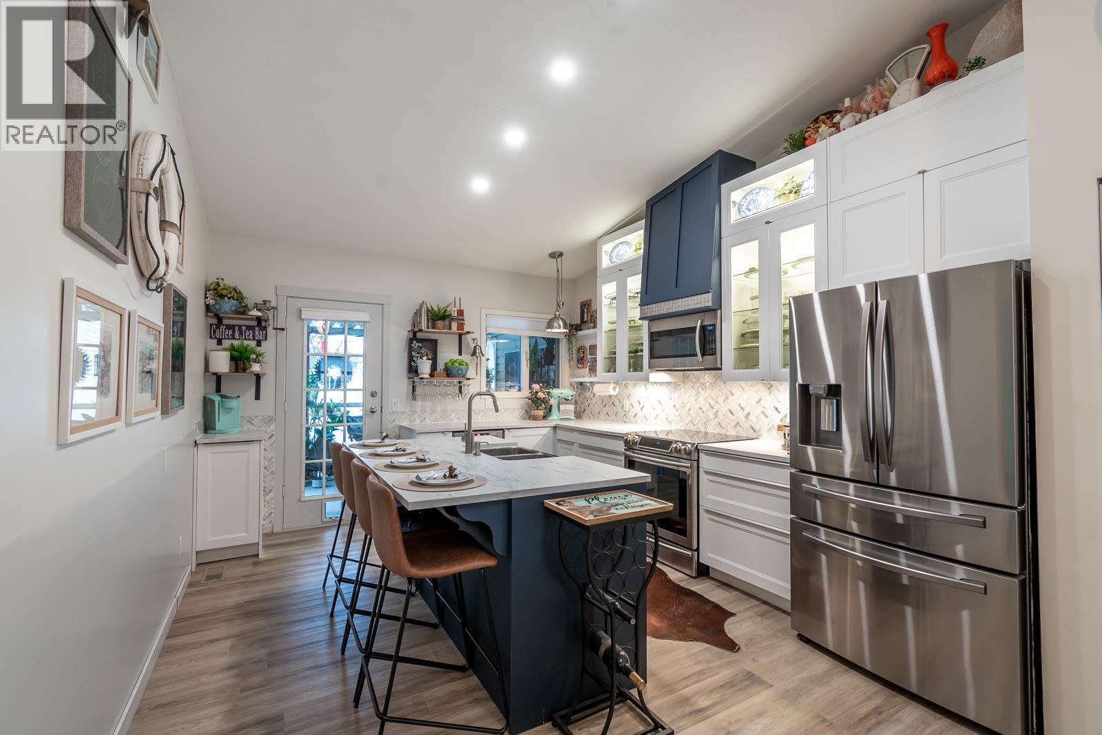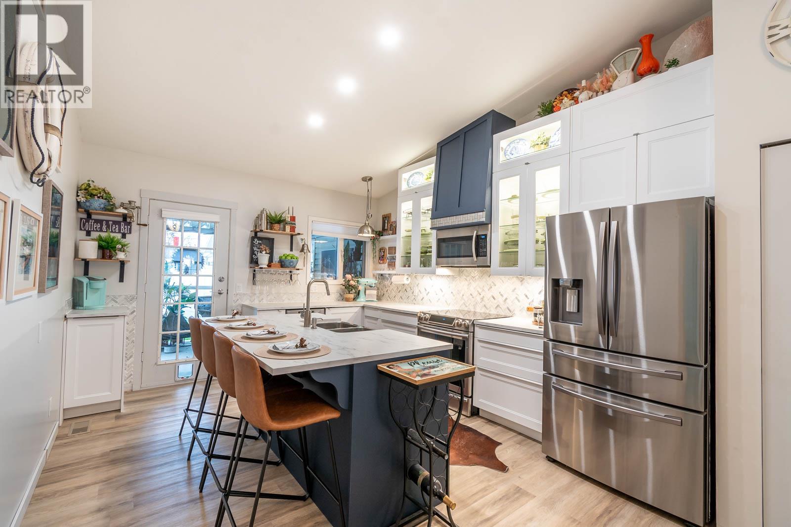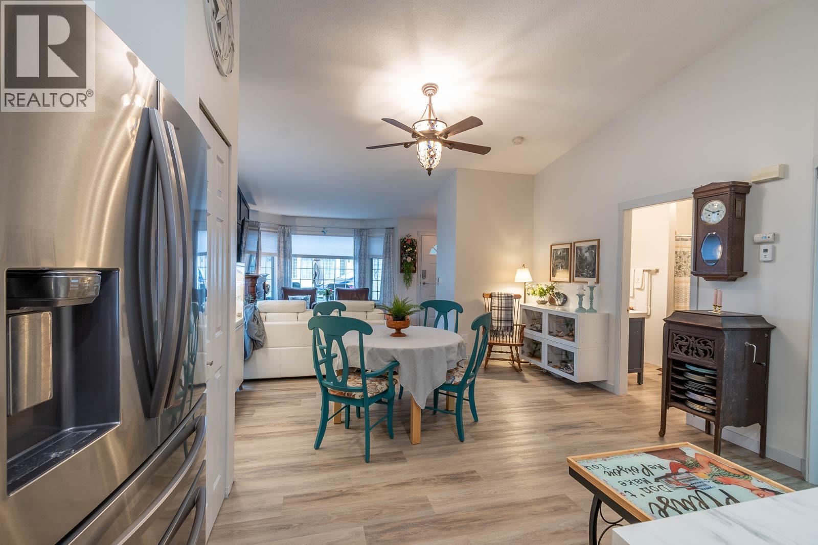 Beautifully maintained level entry 55+ townhouse located in the highly sought after Vernon Creek Villas, offering comfortable living in a prime, convenient location. Enjoy the ease of being within walking distance to transit and Vernon’s vibrant downtown core with its shops, services, and amenities. Step inside to a bright and spacious open concept layout highlighted by vaulted ceilings and abundant natural light. The updated kitchen is both functional and stylish, featuring soft close cabinetry with integrated lighting, SS appliances, built in wine cooler, and a large island. The primary bedroom offers a generous retreat with dual his and her closets and a well appointed 3 piece ensuite. A full 4 piece main bathroom includes in suite laundry for everyday convenience. Additional features include keyless entry from the garage, private backyard, covered patio ideal for relaxing or hosting guests, and convenient guest parking nearby. Numerous updates include new windows installed throughout, improving both comfort and energy efficiency. Residents enjoy low maintenance living with strata fees that include maintenance, sewer, garbage/recycling, and water. An extra parking stall is available for just $100 annually. Pet friendly with restrictions allowing either one dog or one cat not exceeding 16 inches in height. This home offers a wonderful combination of comfort, location, and lifestyle in one of Vernon’s most desirable adult oriented communities. (39626391)