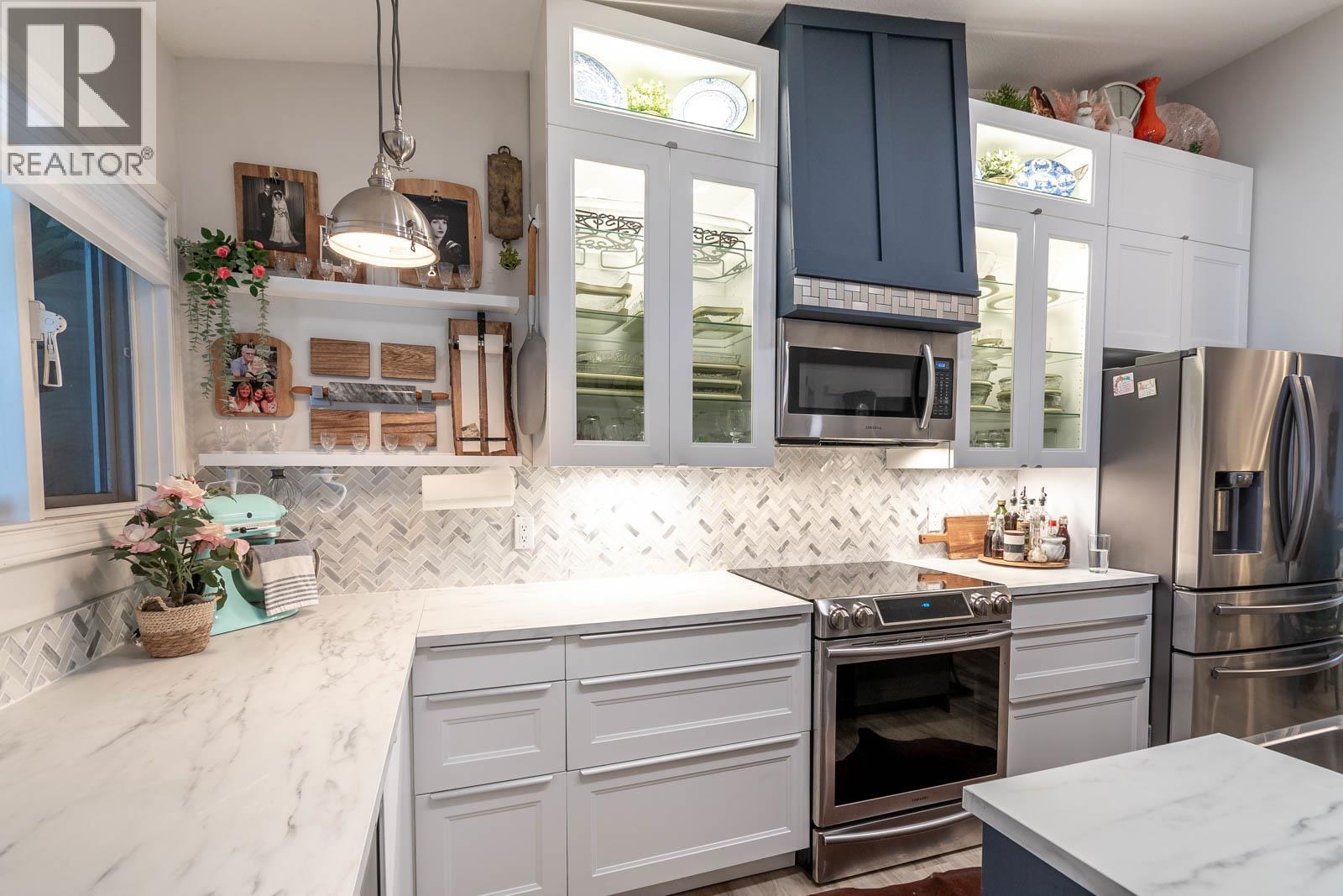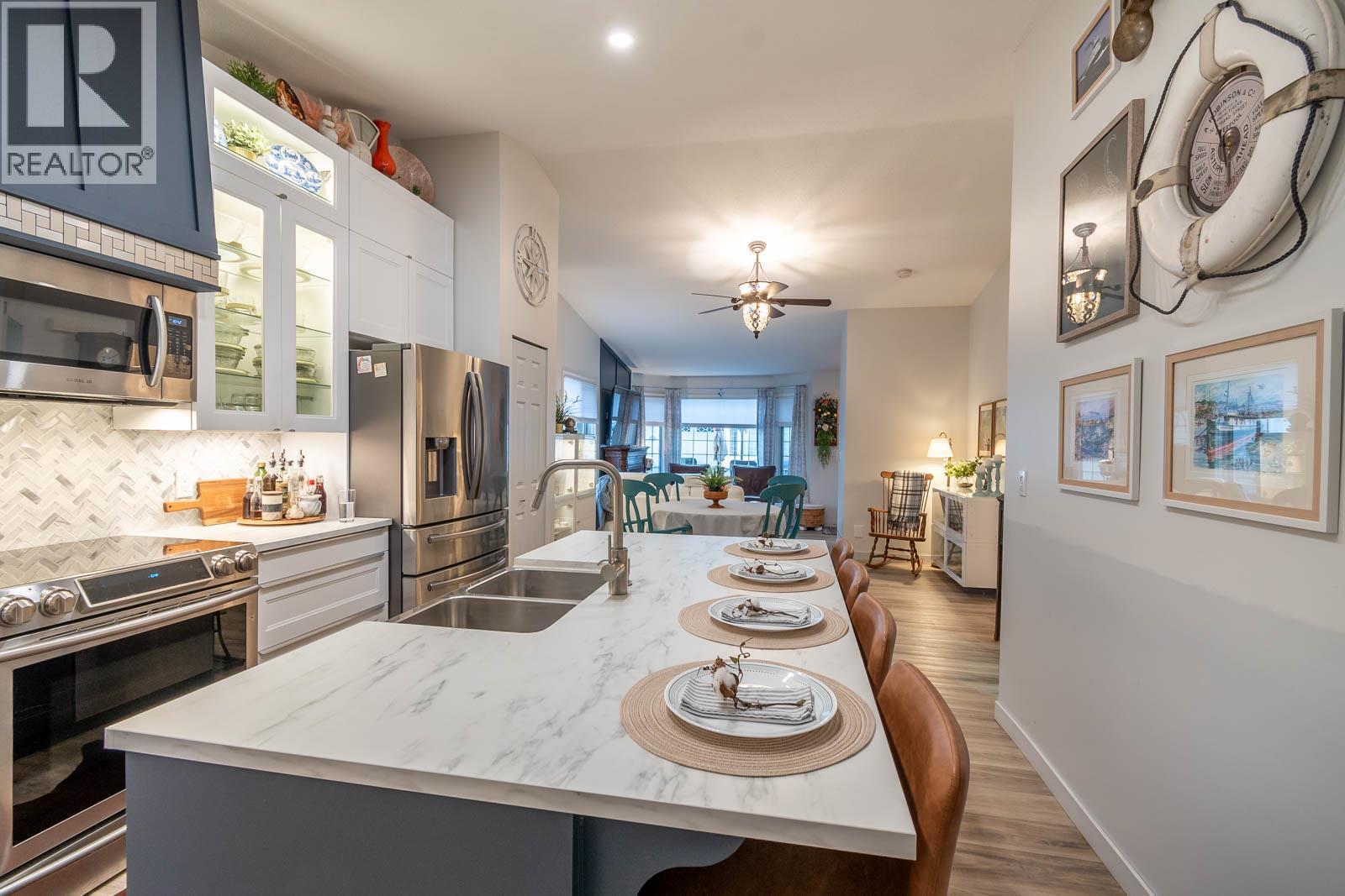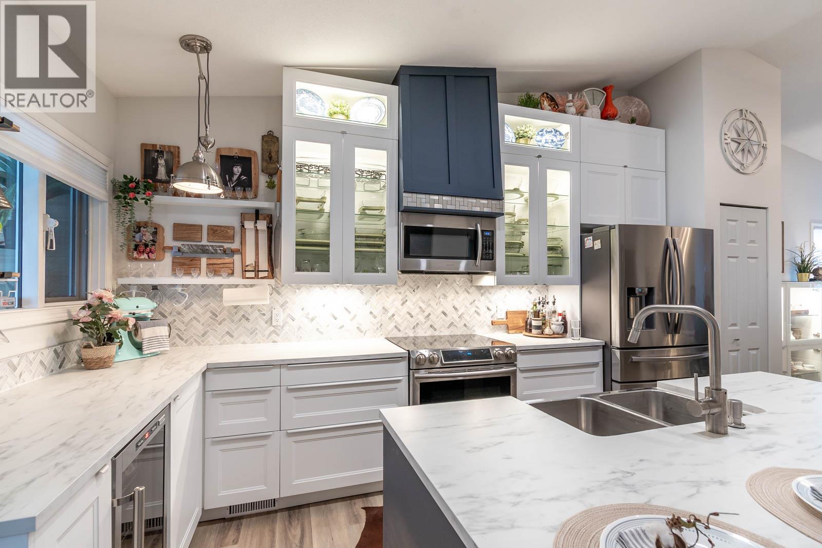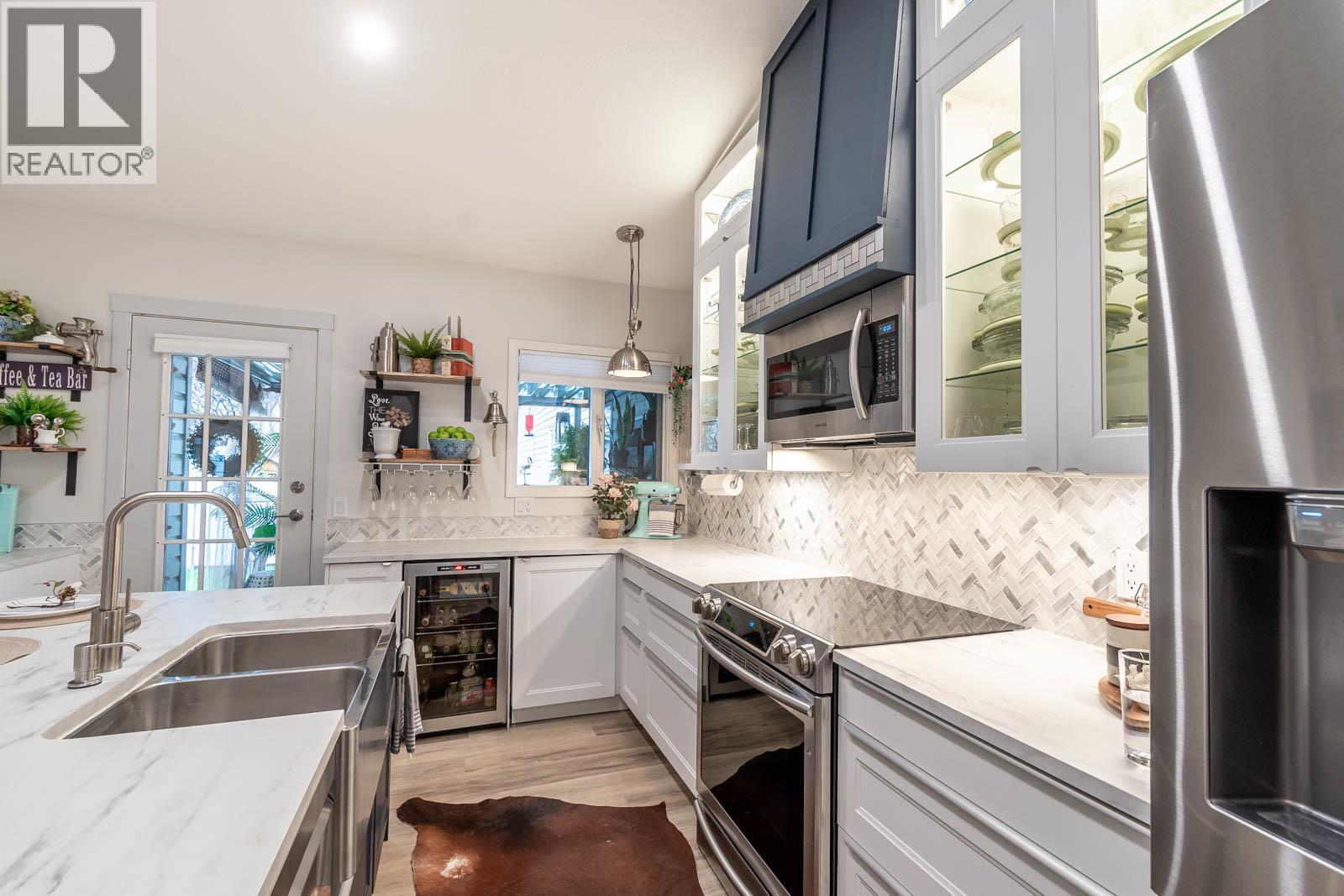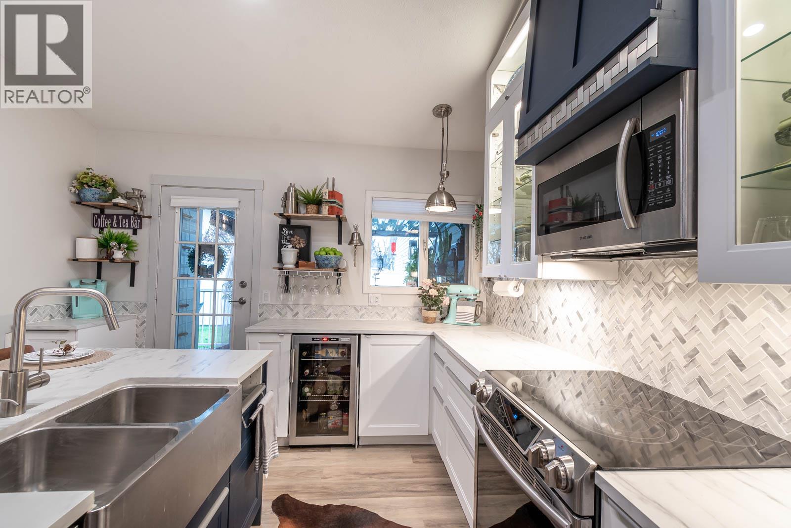 Beautifully maintained level entry 55+ townhouse located in the highly sought after Vernon Creek Villas, offering comfortable living in a prime, convenient location. Enjoy the ease of being within walking distance to transit and Vernon’s vibrant downtown core with its shops, services, and amenities. Step inside to a bright and spacious open concept layout highlighted by vaulted ceilings and abundant natural light. The updated kitchen is both functional and stylish, featuring soft close cabinetry with integrated lighting, SS appliances, built in wine cooler, and a large island. The primary bedroom offers a generous retreat with dual his and her closets and a well appointed 3 piece ensuite. A full 4 piece main bathroom includes in suite laundry for everyday convenience. Additional features include keyless entry from the garage, private backyard, covered patio ideal for relaxing or hosting guests, and convenient guest parking nearby. Numerous updates include new windows installed throughout, improving both comfort and energy efficiency. Residents enjoy low maintenance living with strata fees that include maintenance, sewer, garbage/recycling, and water. An extra parking stall is available for just $100 annually. Pet friendly with restrictions allowing either one dog or one cat not exceeding 16 inches in height. This home offers a wonderful combination of comfort, location, and lifestyle in one of Vernon’s most desirable adult oriented communities. (39626391)