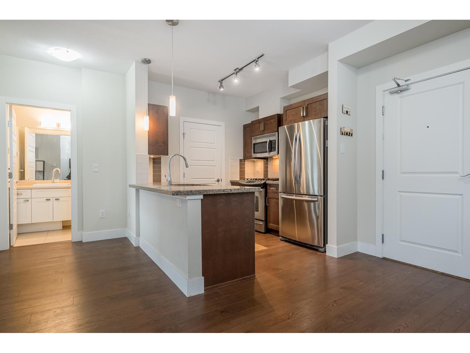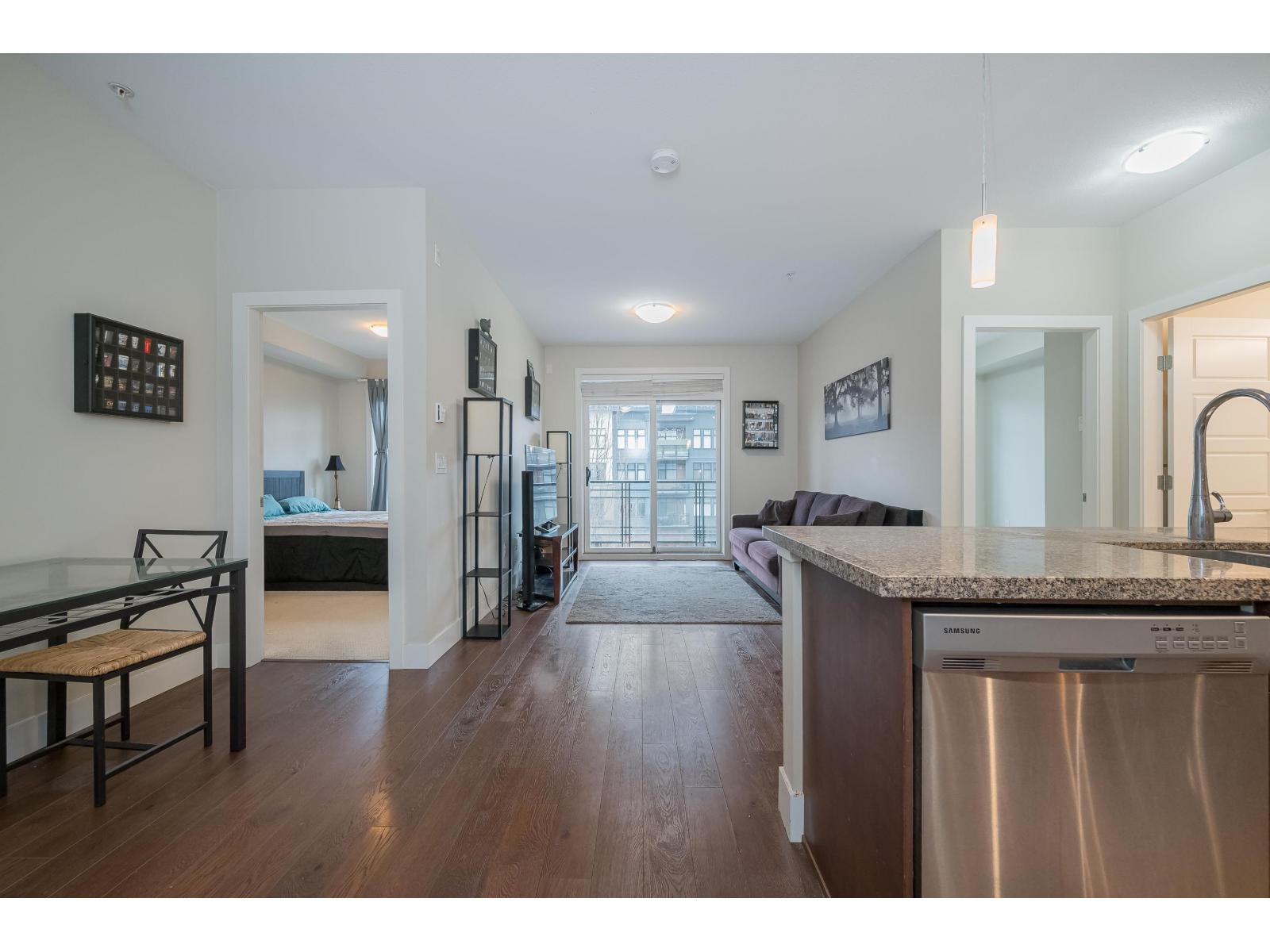 LIKE NEW! Bright & spacious 2-bedroom, 2-bath condo with an ideal split-bedroom layout for privacy-perfect for roommates, guests, or a home office setup. Bedrooms feature closet organizers with built-ins. Primary ensuite offers an oversized walk-in shower & soaker tub in the main bath. Large east-facing windows flood the home with morning light & sliding doors off the living room lead to generous covered deck with gas BBQ hookup (BBQ included)-perfect for year-round use. Well-appointed kitchen showcases granite countertops, stainless steel appliances, a gas range, & pendant lighting the over breakfast bar peninsula, flowing seamlessly into the open-concept living & dining areas. In-suite laundry/storage room. Secure underground parking & bike room. Pet-friendly building with no size restrictions. Incredible location - walk to everything - future SkyTrain, rec centres, nature trails, parks, everyday amenities, transit at your door step -an excellent choice for commuters, investors, or future-focused buyers. (32335278)