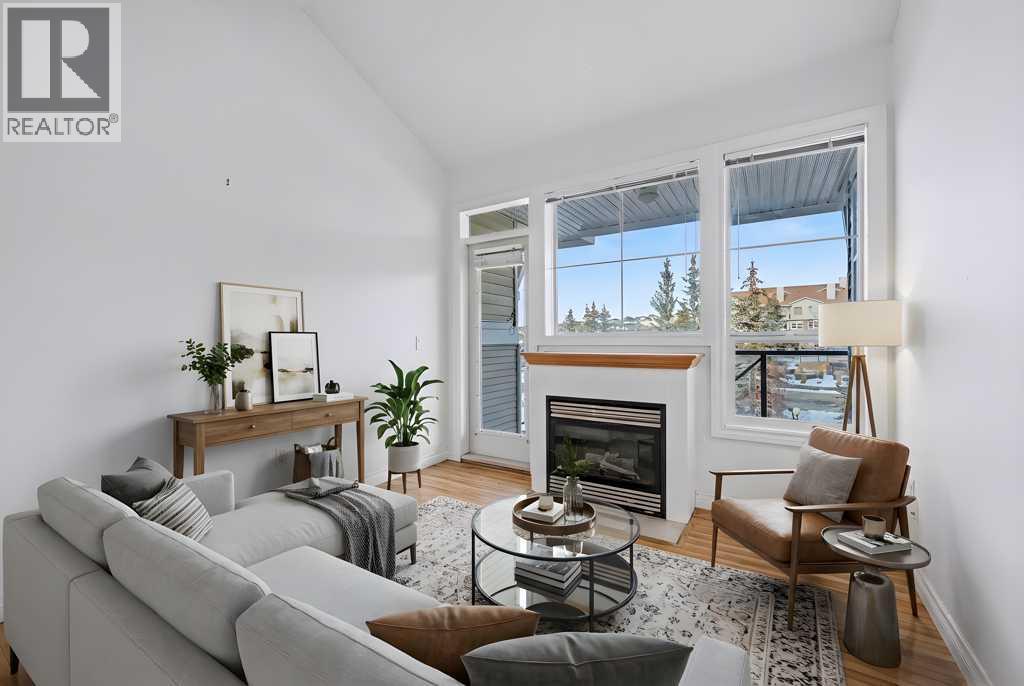 Bright and beautifully maintained top-floor condo in the well-established Stonecroft complex, located in the desirable lake community of Arbour Lake. This spacious 977 sq. ft. open-concept unit offers 2 bedrooms, a den, and two updated bathrooms, with a welcoming living room featuring vaulted ceilings, a cozy fireplace, and large windows that fill the home with natural light, plus a patio door leading to your private deck. The thoughtfully designed kitchen includes stainless steel appliances, upgraded countertops, a water filtration system, pantry, and convenient eating bar, complemented by a generous dining area ideal for hosting family or friends. The primary bedroom features a walk-in closet and updated 3-piece ensuite, while the second bedroom is privately located on the opposite side of the unit, and the den with French doors provides the perfect space for an office or hobby room. Additional highlights include titled underground parking, an assigned storage locker, and in-suite laundry, all within a beautifully maintained complex offering manicured grounds with a fountain, social room with kitchen, woodworking shop, guest suite, and ample visitor parking, just steps from Arbour Lake, Crowfoot shopping, transit and C-Train, YMCA, and easy access to Stoney Trail. (31535732)