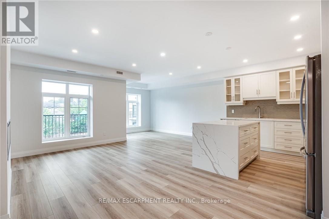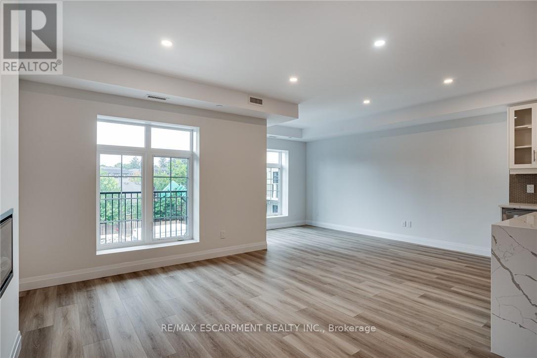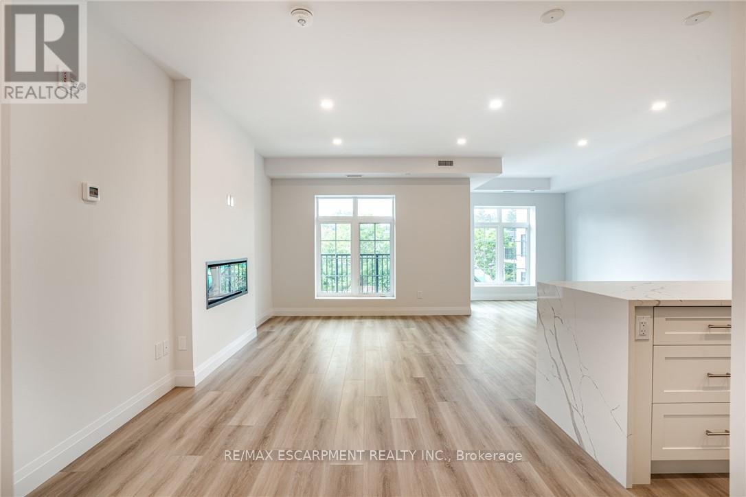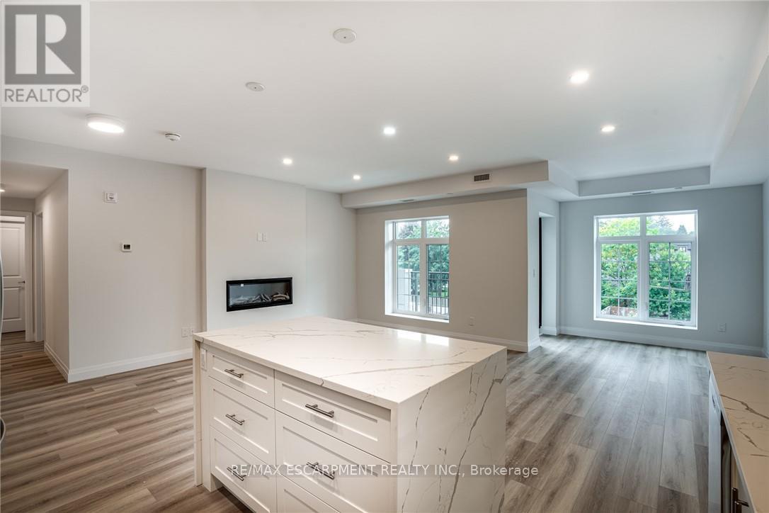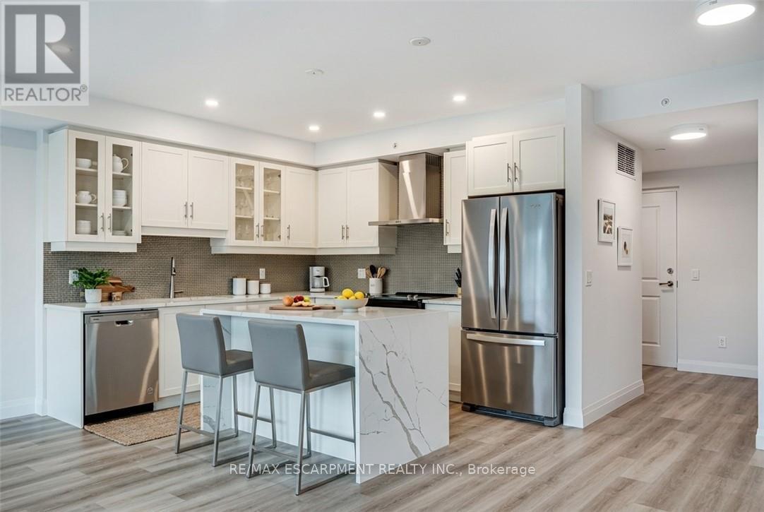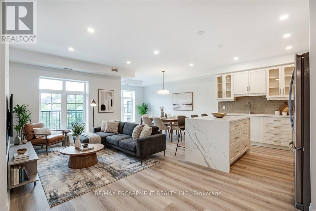 Seize the opportunity to own one of the city's newest luxury low-rise condos in the heart of Ancaster. In this "Sulphur Springs" model, enjoy 2 spacious bedrooms plus a den, 2 bathrooms, 2 parking spots and 2 lockers. The impressive amenities include a gym, media room, party room and "open air" rooftop terrace lounge with built-in BBQs and outdoor kitchens. Nestled among mature trees, it's conveniently located within walking distance to all of the shopping in the Ancaster core while being close to highway access. The open-concept layout combines the living room, dining room, and kitchen, making it ideal for entertaining friends and family. The spacious master bedroom includes a walk-in closet and a 4-piece ensuite, while a separate den/office provides added versatility. Enjoy the convenience of a second full bathroom and a dedicated laundry area. Relax on your private balcony with a morning coffee or an evening glass of wine. Additional highlights include luxury vinyl flooring throughout, elegant quartz countertops, and stylish pendant lighting over the island. Don't miss the opportunity to experience all that this exceptional unit has to offer! (41957454)