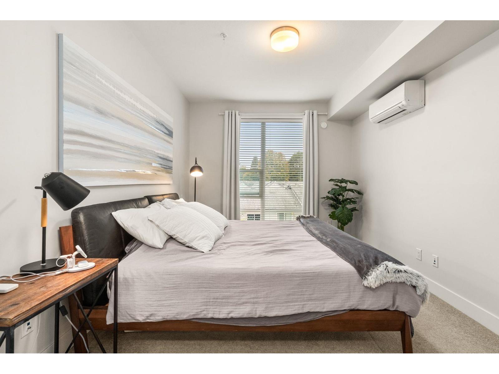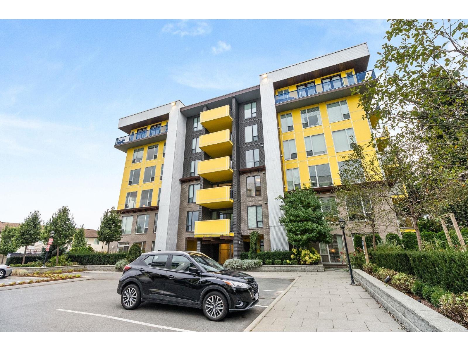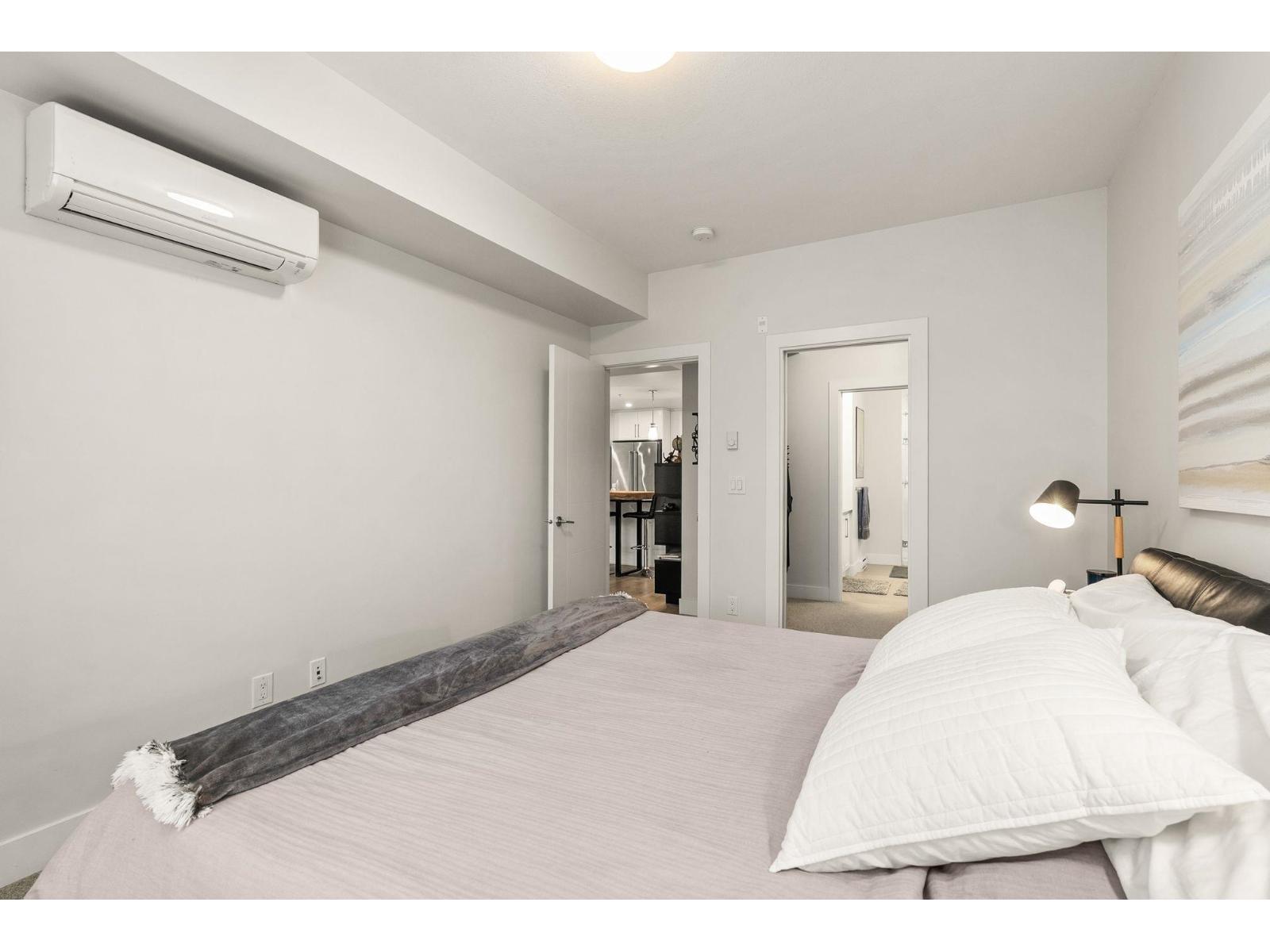 Welcome to Mill District, where modern living meets unbeatable convenience. This bright and stylish 2-bedroom 2-bathroom home is ideally situated in one of Abbotsford's most central locations, just steps away from Mill Lake Park and surrounded by mountain views. Inside enjoy high ceilings, granite countertops, premium KitchenAid appliances with a gas range, and a spacious kitchen complete with large pantry. The home features laminate flooring, a side-by-side washer and dryer and air conditioning for year-round comfort. Both bedrooms include a walk-in closet and private, ensuite bathrooms, with the primary offering a double vanity and glass door, a rain shower. Step outside to a large west-facing patio with an unobstructed view and a gas BBQ hookup perfect for relaxing in the evenings! (32332739)
