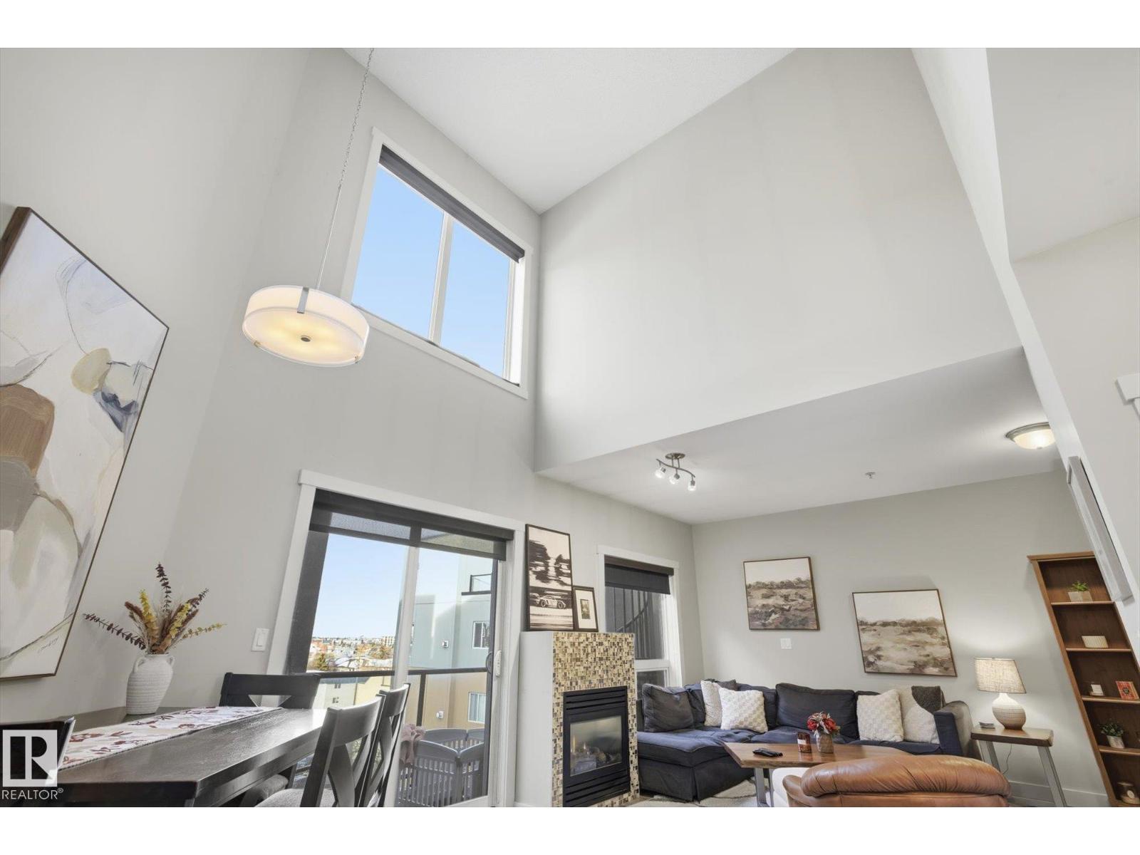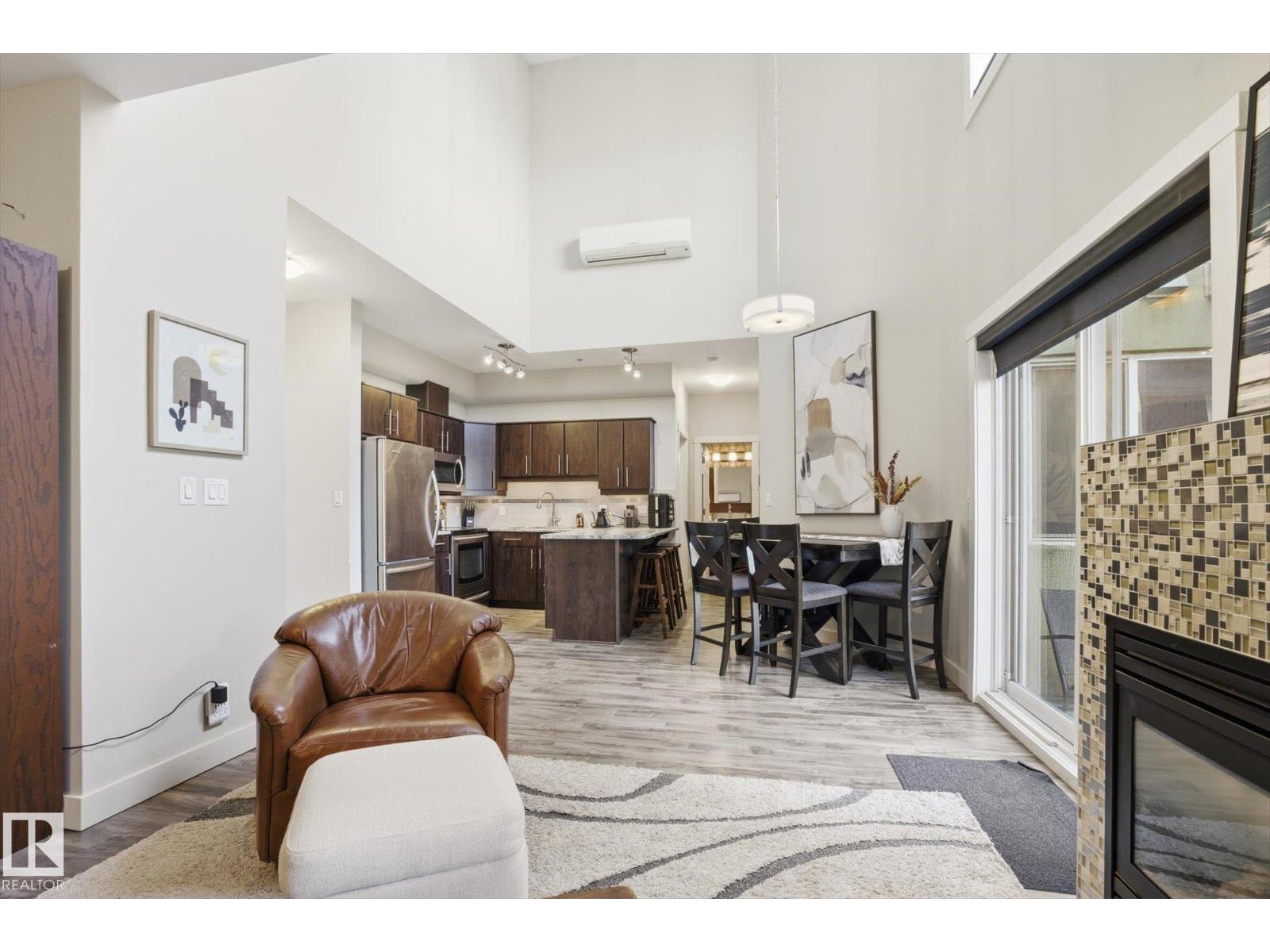 Welcome to this stunning TOP-FLOOR condo featuring a cozy living room with fireplace and balcony doors leading to a rare two-level balcony! The open-concept layout features an expansive living room, kitchen with island, MASSIVE 19 foot ceilings and large windows providing an abundance of natural light. Fully equipped with A/C, IN-SUITE LAUNDRY and underground parking! Conveniently located close to shopping, dining, transit, and everyday amenities. This unit with city views and incredible patio space, is sure to wow you! (33726825)