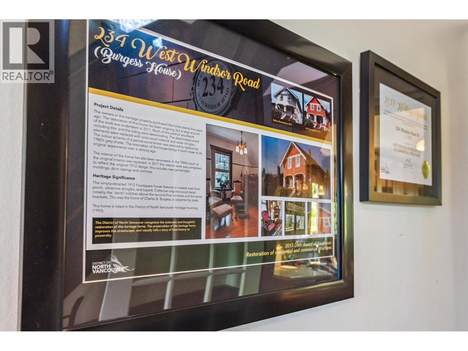 The Historic "Burgess House" - Offered for the first time in 30 years, this cherished 1912 Craftsman home blends timeless character with thoughtful updates. Recognized with a 2017 heritage preservation award, it features 9´ ceilings, stained-glass windows, and intricate millwork. The south-facing living room with gas fireplace connects to a formal dining area, while the spacious kitchen opens to a deck and level backyard. Upstairs offers four bedrooms with mountain and partial city views, and the lower level includes a near-new one-bedroom guest suite. Set on a 50´ x 132´ lot with lane access for future garage or coach house potential (confirm with DNV), and steps to École André-Piolat and Braemar Elementary-this is a rare chance to own a piece of North Vancouver´s history. (32336806)