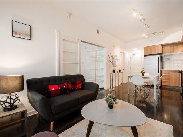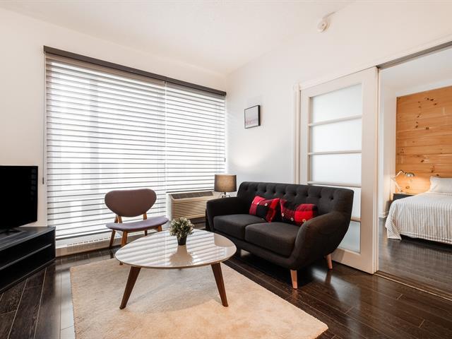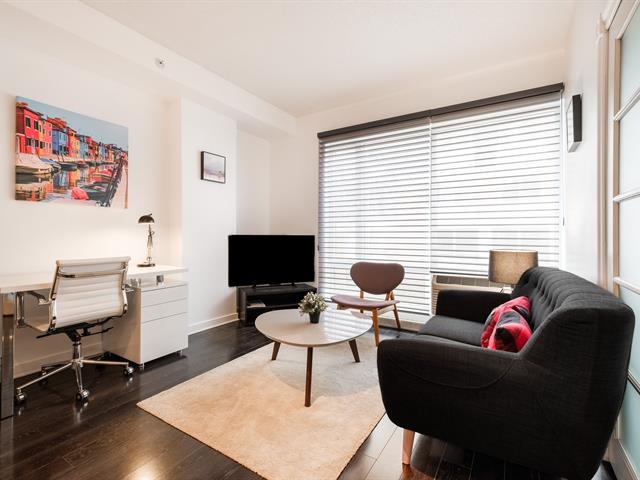 TRUE TURNKEY! This impeccable condo, sold fully furnished and equipped, is ready to welcome you! Thoughtfully laid out to offer a harmonious living space, it features a spacious closed bedroom with walk-in closet, a dedicated office area, abundant natural light, and a private balcony. The building offers elevators, a beautifully designed rooftop terrace, a fitness room, an interior courtyard, and a common lounge. Exceptional location in the heart of the Quartier des Spectacles, providing easy access to all services and activities. Enjoy the cultural and artistic vibrancy just steps from your door. Available immediately! (53364190)