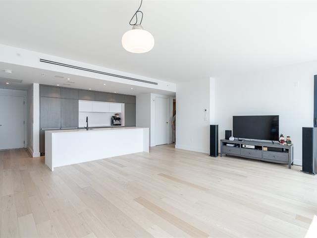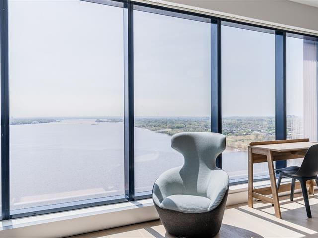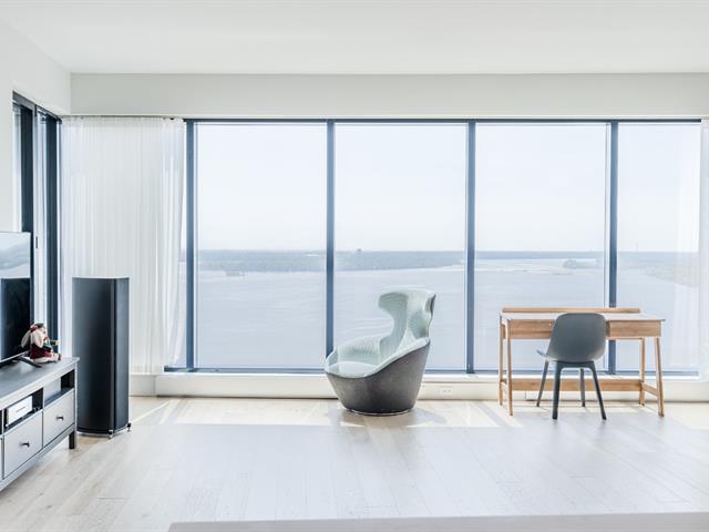 SYMPHONIA POP -- A prestigious new address on Pointe-Sud of Nuns' Island. This luxurious 2-bedroom, 2-bathroom condominium offers refined finishes and an exceptional lifestyle. The south-facing unit enjoys abundant natural light and spectacular, unobstructed views of the river, creating a serene and elegant living environment. The condo features a private balcony, an indoor garage, and a storage locker. Residents benefit from 24-hour security and an impressive array of resort-style amenities, including two swimming pools, a spa and fitness center, fully equipped gym, billiard room, and much more. (47673787)