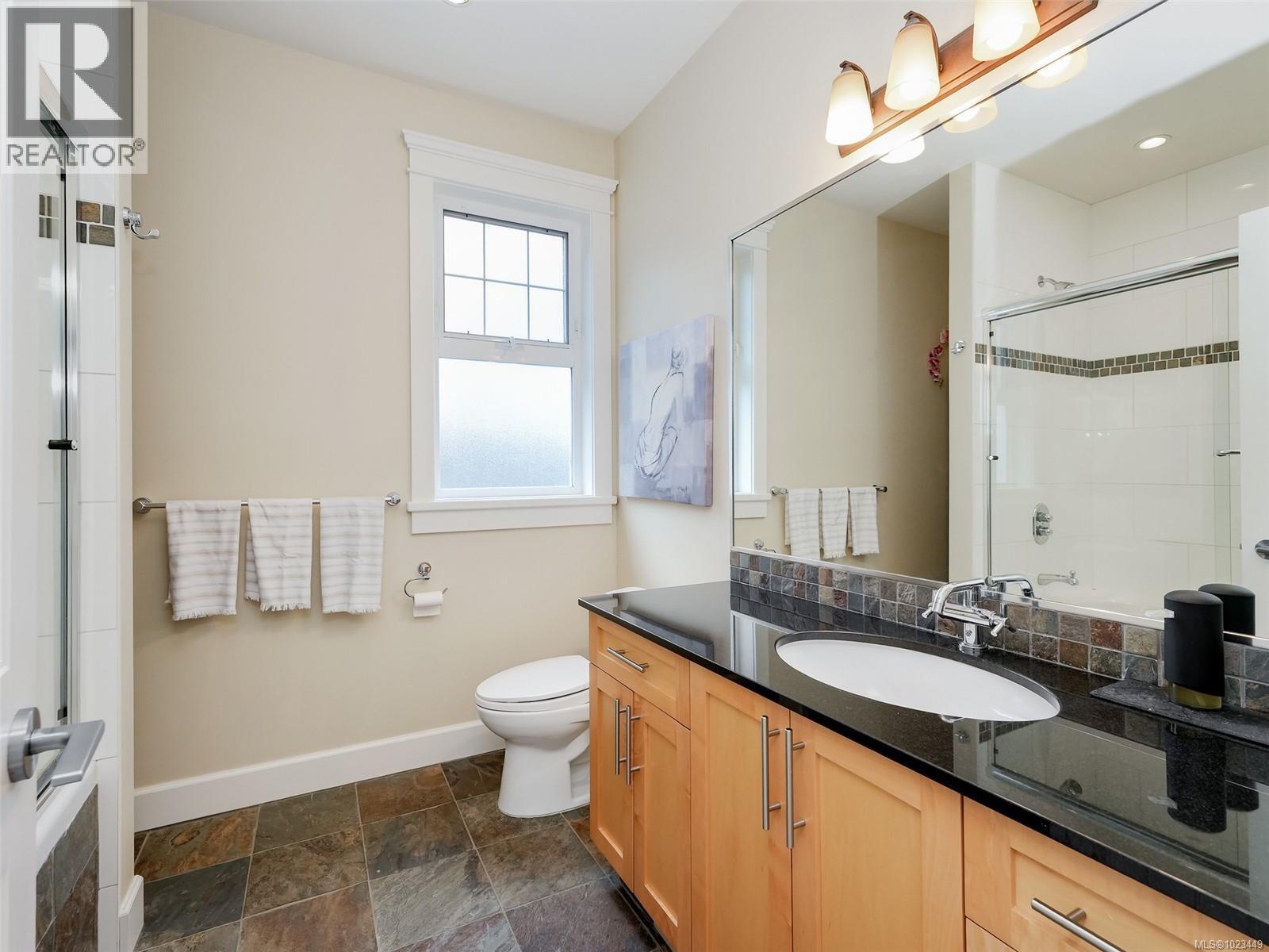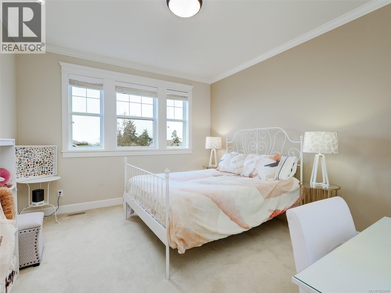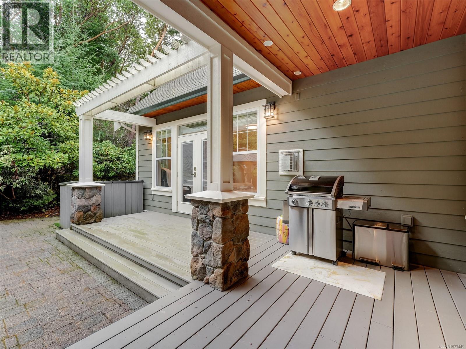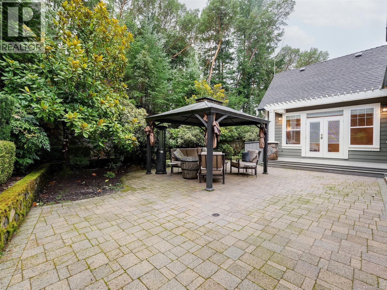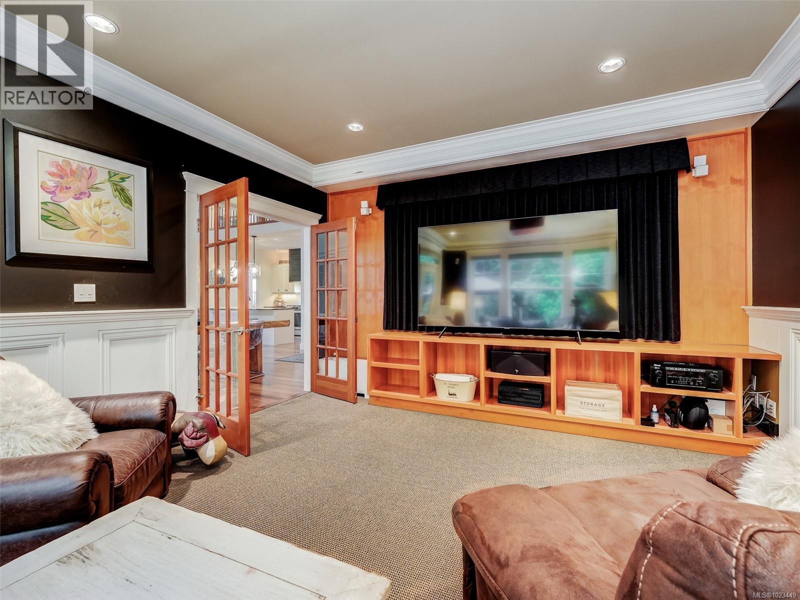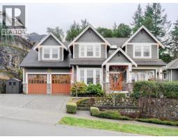 From the moment you walk in, you’ll notice the soaring high vaulted ceilings with skylights, Brazilian cherry hardwood floors throughout, a stunning floor-to-ceiling rock gas fireplace with built-in wall unit, and a large eating area just off the kitchen. There is a private office by the front door and a large den that can also be converted back to a formal dining room with coffered ceilings. The gourmet kitchen features shaker-style white designer cabinets, solid quartz countertops, newer top-end stainless steel appliances with a gas range and statement hood fan, an oversized modern farmhouse sink, and a large peninsula breakfast bar with seating for four overlooking the living area. No need to go to the movies with your own media room, offering recessed lighting, white wood moldings, raised panel wainscoting, custom millwork, and wood French doors. The primary bedroom is on the main floor, with French doors to a sunny private patio area. There's a romantic gas fireplace, his-and-hers walk-in closets, and a spa-like ensuite with dual vanities, in-floor heated tile, a soaker tub, and a separate stand-alone shower with rain head. Upstairs is truly special, featuring wood floors, custom railings, a mezzanine-style design with skylight, two large bedrooms, a huge recreation room that could be converted to additional bedrooms, and two full bathrooms. Step outside to your ultra-private backyard oasis with a raised cedar deck, mature landscaping, barbeque area, and easy-care yard—perfect for entertaining or relaxing after a game of golf or tennis. Over 4,000 sq ft of luxury living with forced-air furnace, heat pump, double car garage, two garden sheds, sprinkler system, large crawl space, and more, all set in the West Coast paradise of Bear Mountain with world-class resort, two golf courses, spa, heated outdoor pool, and amenities just minutes from downtown Victoria. A rare find indeed. Call now. (30281466)