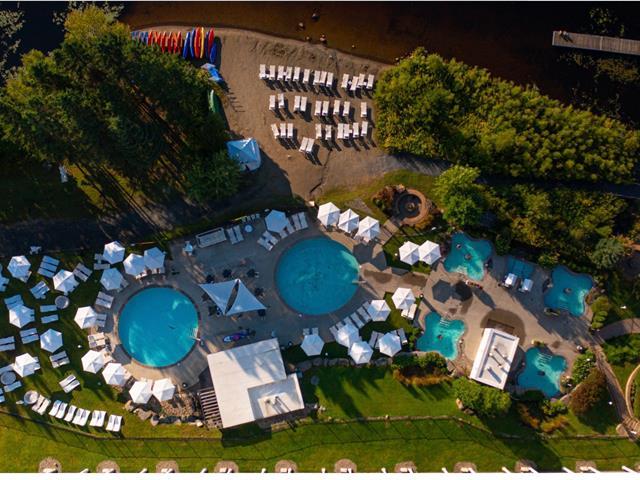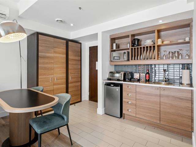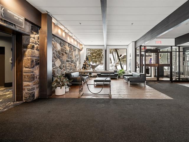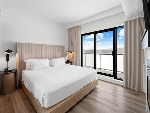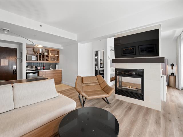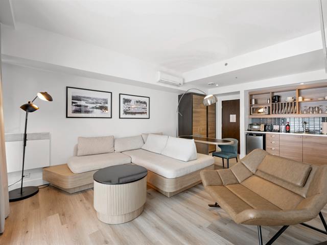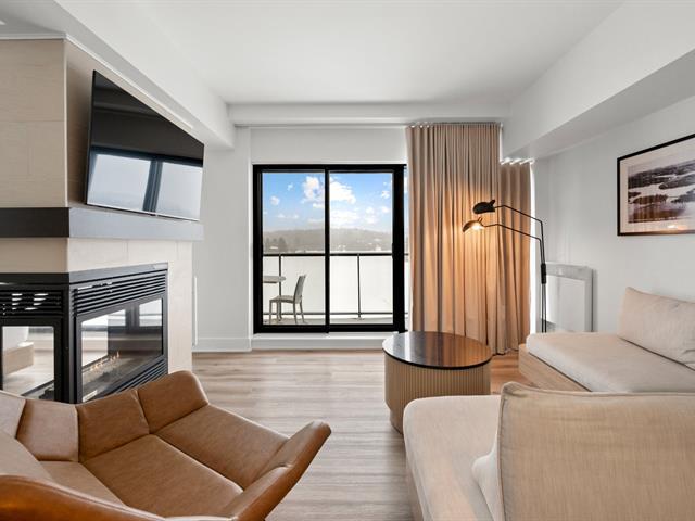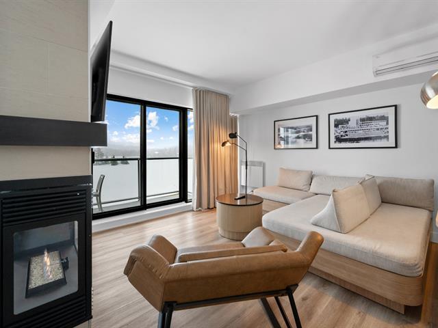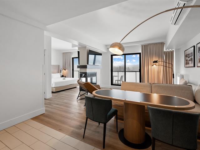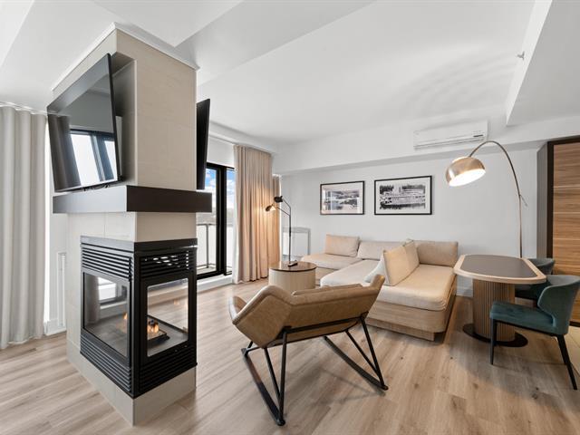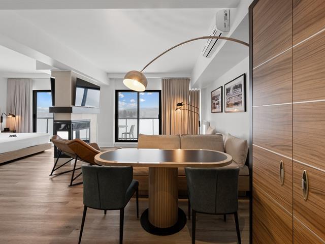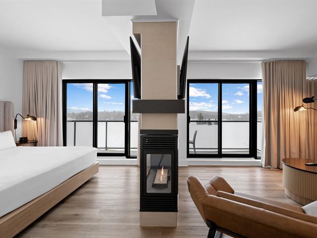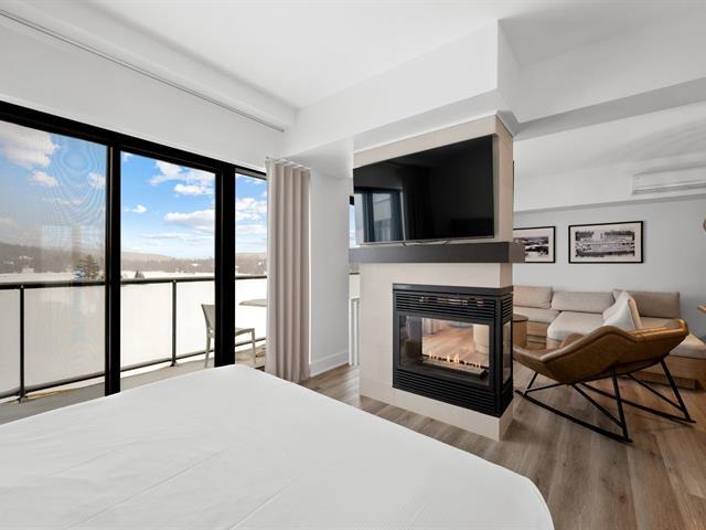 Estérel Resort - Nestled between two magnificent navigable lakes, this elegant open-plan suite offers a bedroom, a double-sided gas fireplace, a spacious bathroom, and a functional kitchenette. The glassed-in balcony allows you to enjoy the magnificent view of the lake all year round. Comfortably accommodating up to four people, this property benefits from all the amenities of the resort complex: swimming pools, spas, gym, restaurants, and more. A perfect place for a relaxing getaway or a well-considered investment in an enchanting location. GST/QST must be added to the asking price (43597011)