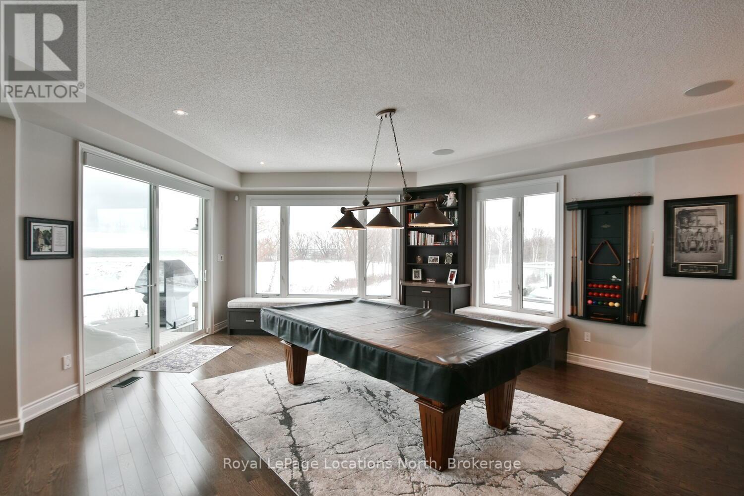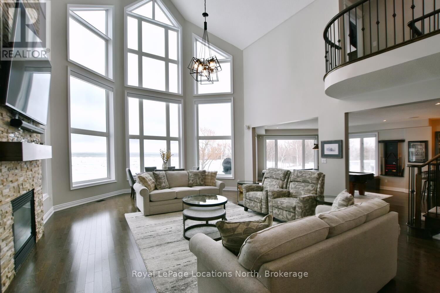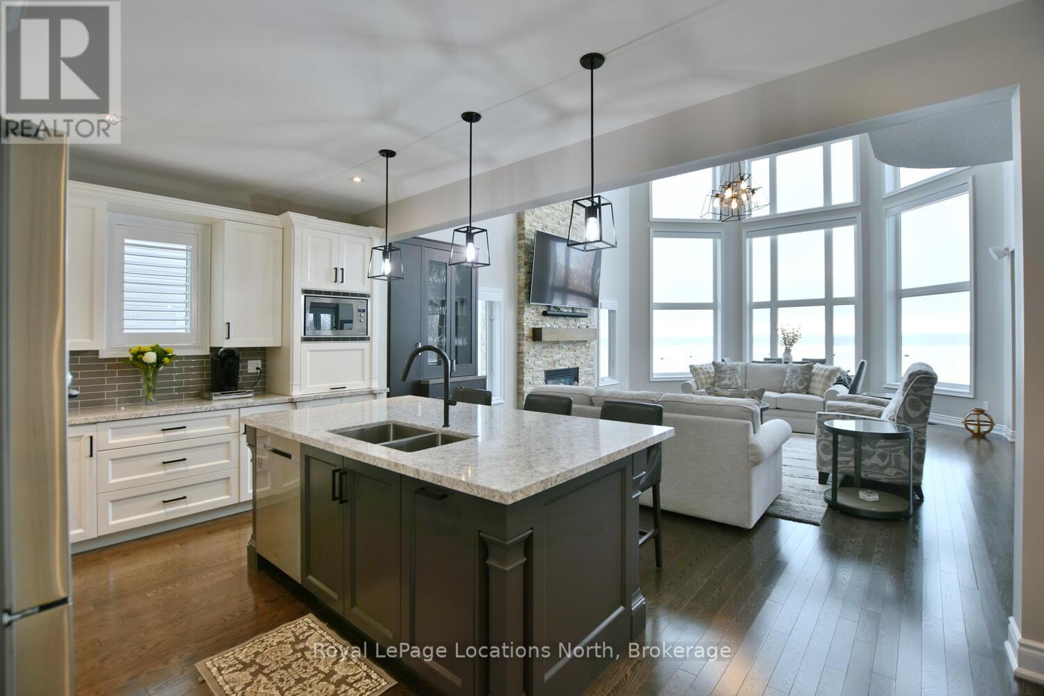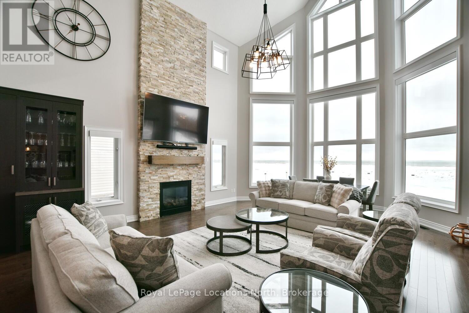 Wake up every day to breathtaking Georgian Bay views in this exceptional waterfront home, where thoughtful design, luxury finishes, & extensive upgrades come together seamlessly! With over $250,000 invested in renovations, this meticulously maintained property offers over 4400 sq ft of refined living space, making it ideal for both everyday living & entertaining. From the moment you step inside, floor-to-ceiling windows frame endless blue-water vistas & fill the home with natural light. The main level features rich built-ins throughout, a stylish den perfect for a home office, & an inviting living area anchored by a dramatic floor-to-ceiling stone gas fireplace. The updated gourmet kitchen is a showstopper with granite countertops, a large center island, stainless steel appliances, & a gas range-perfect for hosting family & friends. The main floor also features a bonus recreation space with a wet bar, pool table area, plus walkout access to the expansive deck & interlock patio overlooking the water. The primary suite is a true retreat, offering panoramic tranquil water views, & an updated spa-inspired ensuite complete with glass walk-in shower, & double vanity. Additional bedrooms are generously sized, providing space & comfort for guests or family. Designed for entertaining, the lower level is fully finished with a gorgeous rec room, bar, built-ins, guest bedroom & bath, as well as a flex space. Car enthusiasts & hobbyists will appreciate the fully finished garage with epoxy floors, custom organization, & a mounted TV-an ideal workspace or hangout. Outdoor living is further enhanced by custom driveway lighting & professionally installed interlock. Additional highlights include main-floor laundry, inside entry from the garage, & access to a private clubhouse with pool, fitness area, & waterfront deck. Located close to beaches, ski hills, & 4-season recreation, this waterfront gem offers luxury, lifestyle, & views that must be seen to be truly appreciated! (41966068)