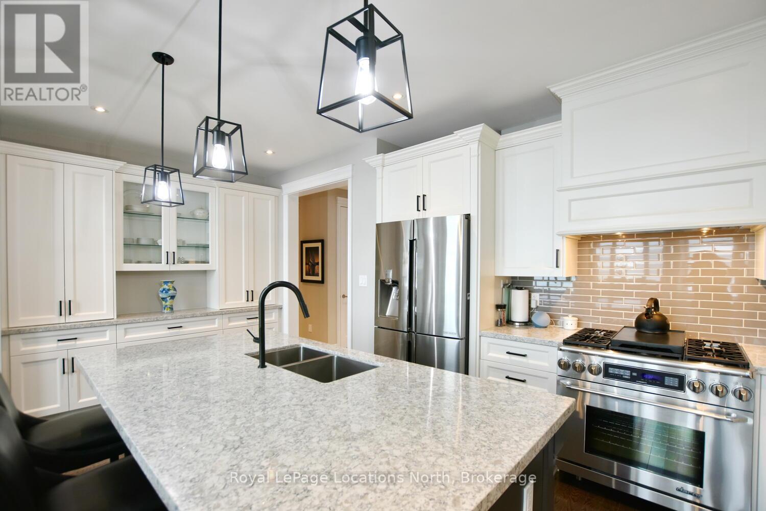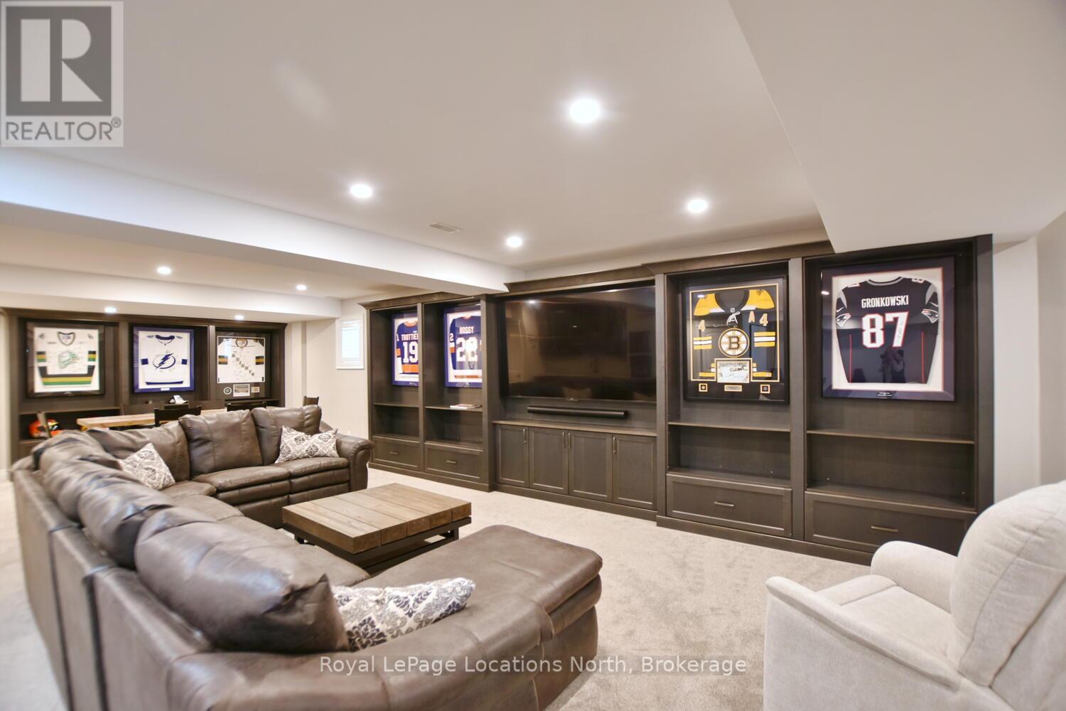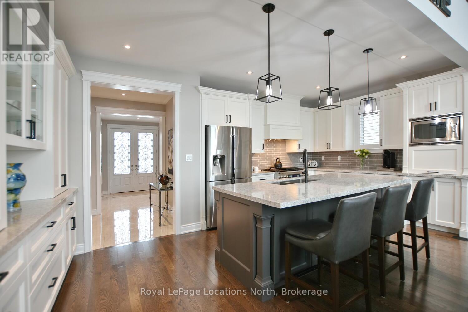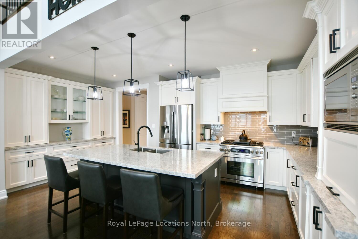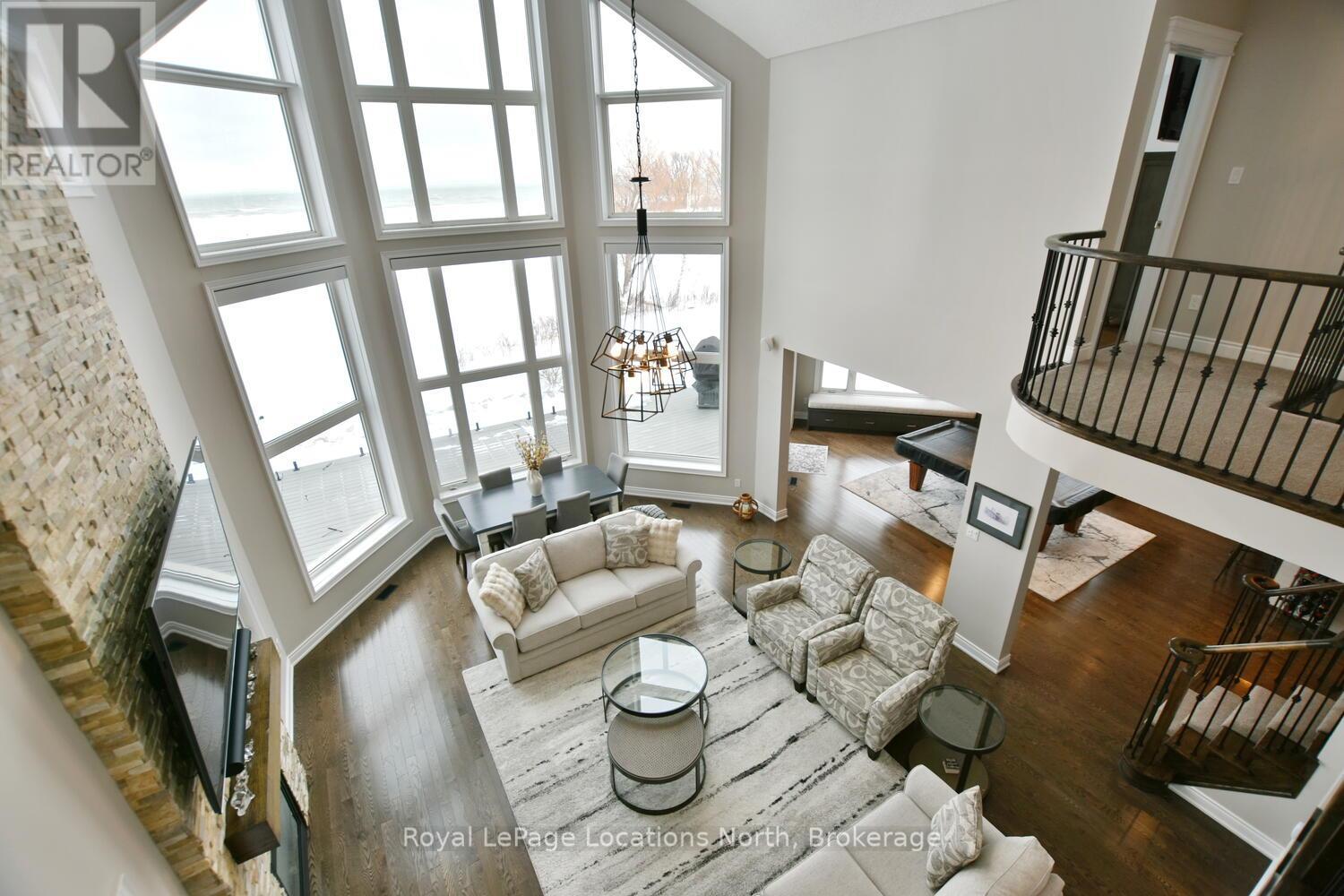 Wake up every day to breathtaking Georgian Bay views in this exceptional waterfront home, where thoughtful design, luxury finishes, & extensive upgrades come together seamlessly! With over $250,000 invested in renovations, this meticulously maintained property offers over 4400 sq ft of refined living space, making it ideal for both everyday living & entertaining. From the moment you step inside, floor-to-ceiling windows frame endless blue-water vistas & fill the home with natural light. The main level features rich built-ins throughout, a stylish den perfect for a home office, & an inviting living area anchored by a dramatic floor-to-ceiling stone gas fireplace. The updated gourmet kitchen is a showstopper with granite countertops, a large center island, stainless steel appliances, & a gas range-perfect for hosting family & friends. The main floor also features a bonus recreation space with a wet bar, pool table area, plus walkout access to the expansive deck & interlock patio overlooking the water. The primary suite is a true retreat, offering panoramic tranquil water views, & an updated spa-inspired ensuite complete with glass walk-in shower, & double vanity. Additional bedrooms are generously sized, providing space & comfort for guests or family. Designed for entertaining, the lower level is fully finished with a gorgeous rec room, bar, built-ins, guest bedroom & bath, as well as a flex space. Car enthusiasts & hobbyists will appreciate the fully finished garage with epoxy floors, custom organization, & a mounted TV-an ideal workspace or hangout. Outdoor living is further enhanced by custom driveway lighting & professionally installed interlock. Additional highlights include main-floor laundry, inside entry from the garage, & access to a private clubhouse with pool, fitness area, & waterfront deck. Located close to beaches, ski hills, & 4-season recreation, this waterfront gem offers luxury, lifestyle, & views that must be seen to be truly appreciated! (41966068)