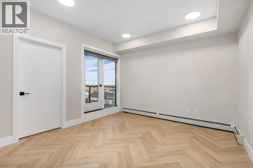 Welcome to the “Azzuro” floorplan by Rohit Homes Calgary, a thoughtfully designed 1-bedroom + den, 1-bathroom residence that blends timeless style with modern functionality. Located on the 4th floor of the highly sought-after Quesnay at Currie Barracks, this south-facing unit enjoys excellent natural light throughout the day and offers the added convenience of being situated near the elevator—ideal for everyday ease and accessibility.Finished in the elegant Neoclassical design palette, the Azzuro delivers a refined aesthetic with warm tones, clean lines, and elevated detailing. This smart layout features 9’ ceilings, quartz countertops with a waterfall edge, a coordinating quartz backsplash, full-height cabinetry, stainless steel appliances, designer lighting, and window coverings. The open-concept kitchen, dining, and living areas flow seamlessly together, creating a welcoming and efficient space for both relaxing and entertaining.The primary bedroom provides a comfortable retreat, while the versatile den is perfect for a home office, study, or additional storage—one of the most sought-after features of this floorplan. The spa-inspired bathroom includes fully tiled walls, polished finishes, and a tub/shower combination for a hotel-like feel. Step out onto your private south-facing balcony to enjoy sunshine and courtyard views.This pet-friendly and AIRBNB-friendly building includes titled heated underground parking and ample visitor parking. Ideally located just minutes from downtown Calgary, Mount Royal University, and the vibrant shops and restaurants of 17th Ave and Marda Loop, this home offers both convenience and lifestyle.The Azzuro is a popular and well-loved floorplan - Don’t miss your opportunity to own in one of Calgary’s most exciting inner-city communities. (31541303)