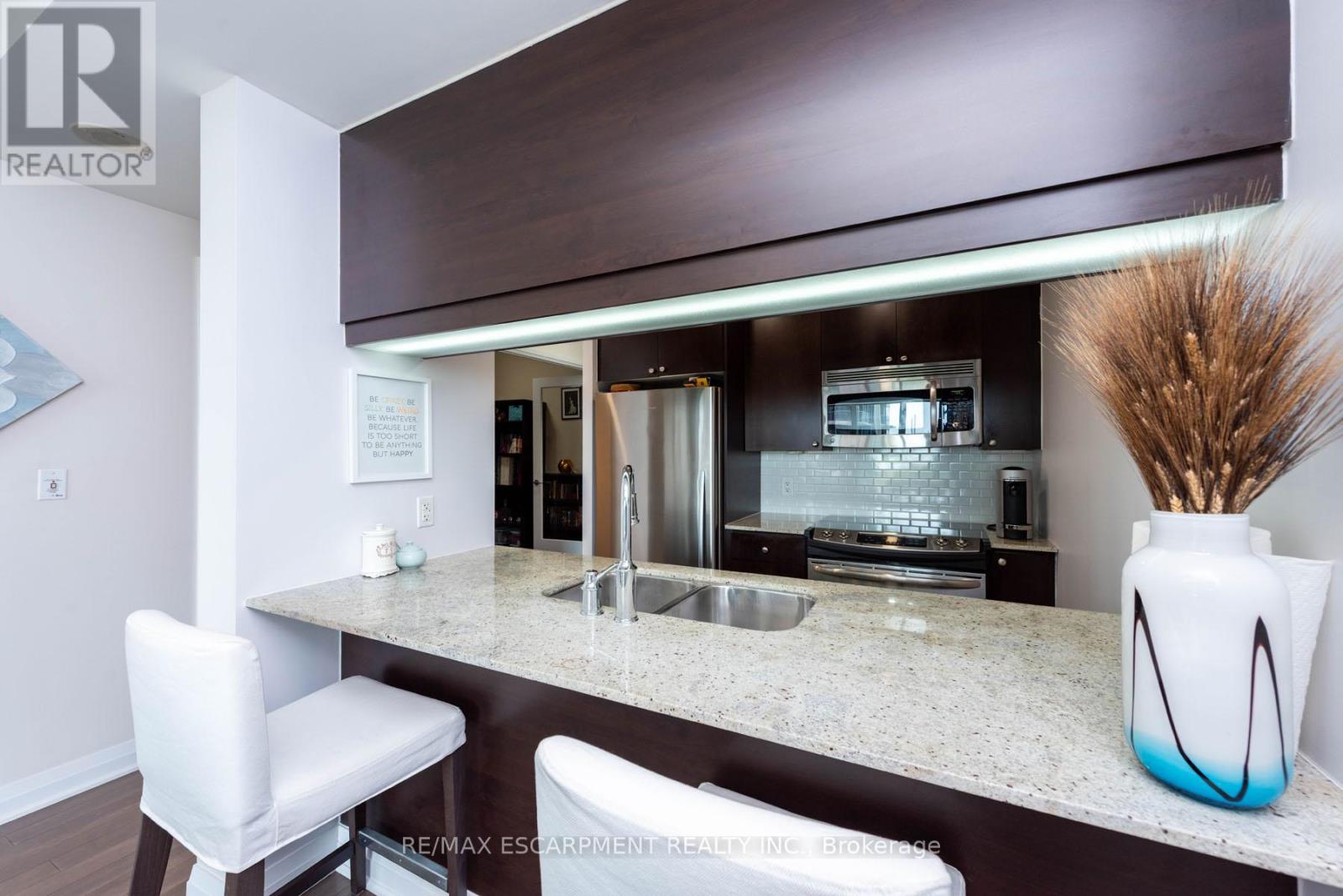 Located at the Stonebrook Condominiums in the heart of Clarkson - an exceptional, move-in ready 1 Bedroom + Den suite with a highly functional layout and modern finishes throughout. This bright, sun-filled residence features 9' ceilings, hardwood flooring, upgraded lighting, and generous storage, creating a warm and inviting living space. The contemporary kitchen is thoughtfully designed with premium stainless steel appliances, granite countertops, a stylish backsplash, and a breakfast bar overlooking the open-concept living and dining area-perfect for everyday living and effortless entertaining. fStep out onto the spacious private balcony and take in the beautiful south-facing views, ideal for morning coffee or unwinding in the evening. The spacious primary bedroom offers large windows, a double-door closet, and ensuite access to a spa-inspired 4-piece bathroom featuring a modern vanity, tiled tub, and separate glass-enclosed shower. The versatile den, enclosed with elegant glass doors, is perfect for a home office, reading nook, or hobby space. Finished in designer tones, this suite reflects true pride of ownership. Enjoy resort-style amenities including a fitness centre, indoor pool, sauna, party room, theatre, games room, guest suite, and 24-hour concierge. *EXTRAS* Bell cable and internet are included in the maintenance fees. Parking and a locker included. Ideally located just steps to shops, restaurants, parks, schools, and Clarkson GO Station, with quick access to major highways. This is the perfect blend of luxury, convenience, and lifestyle in one of Clarkson's most sought-after communities. (41967309)