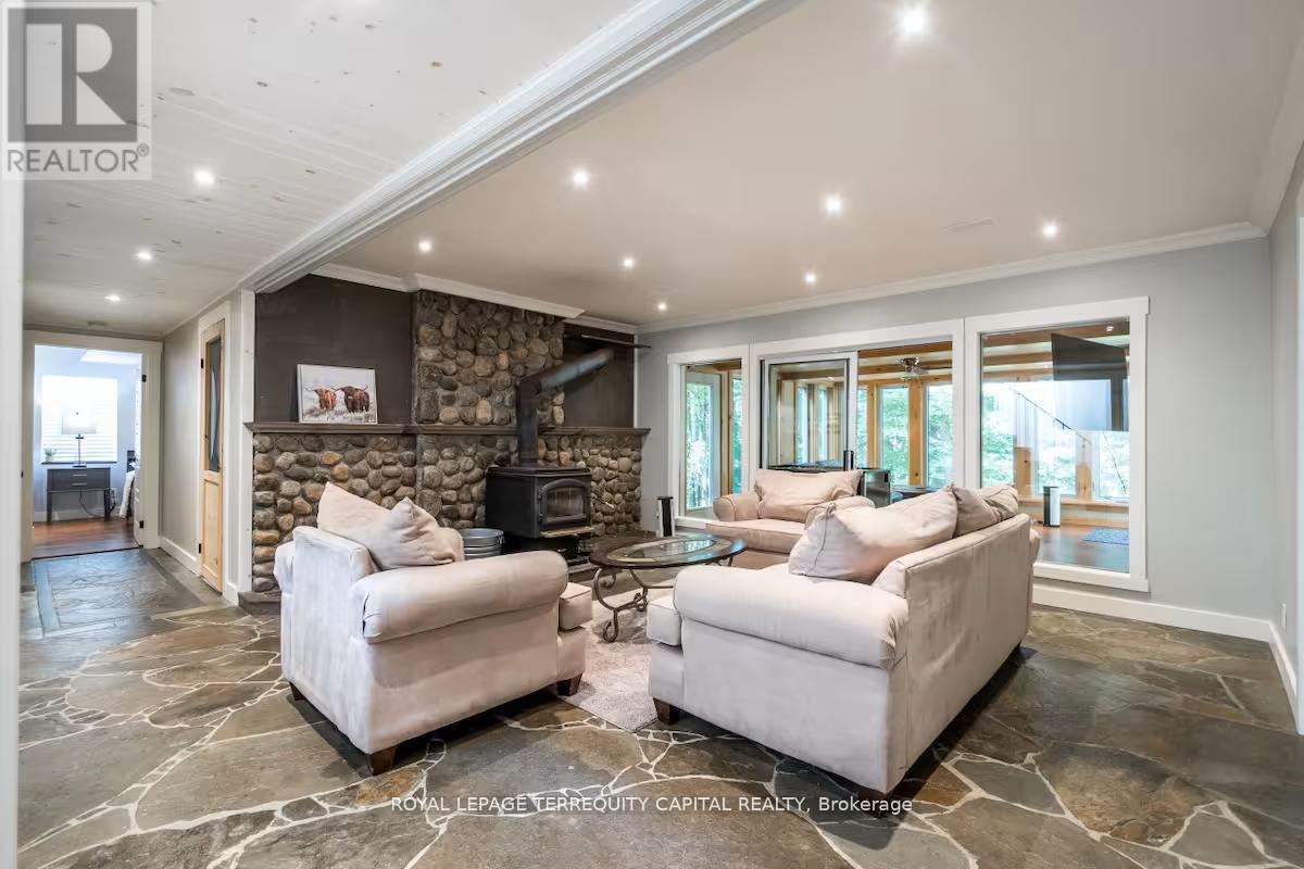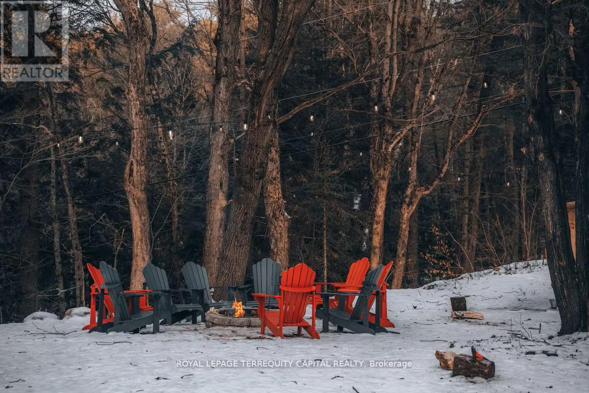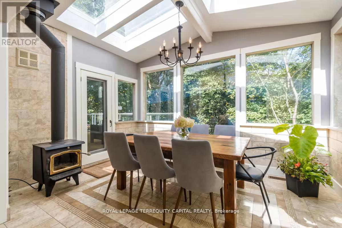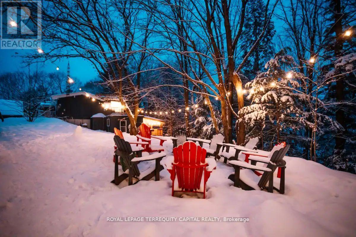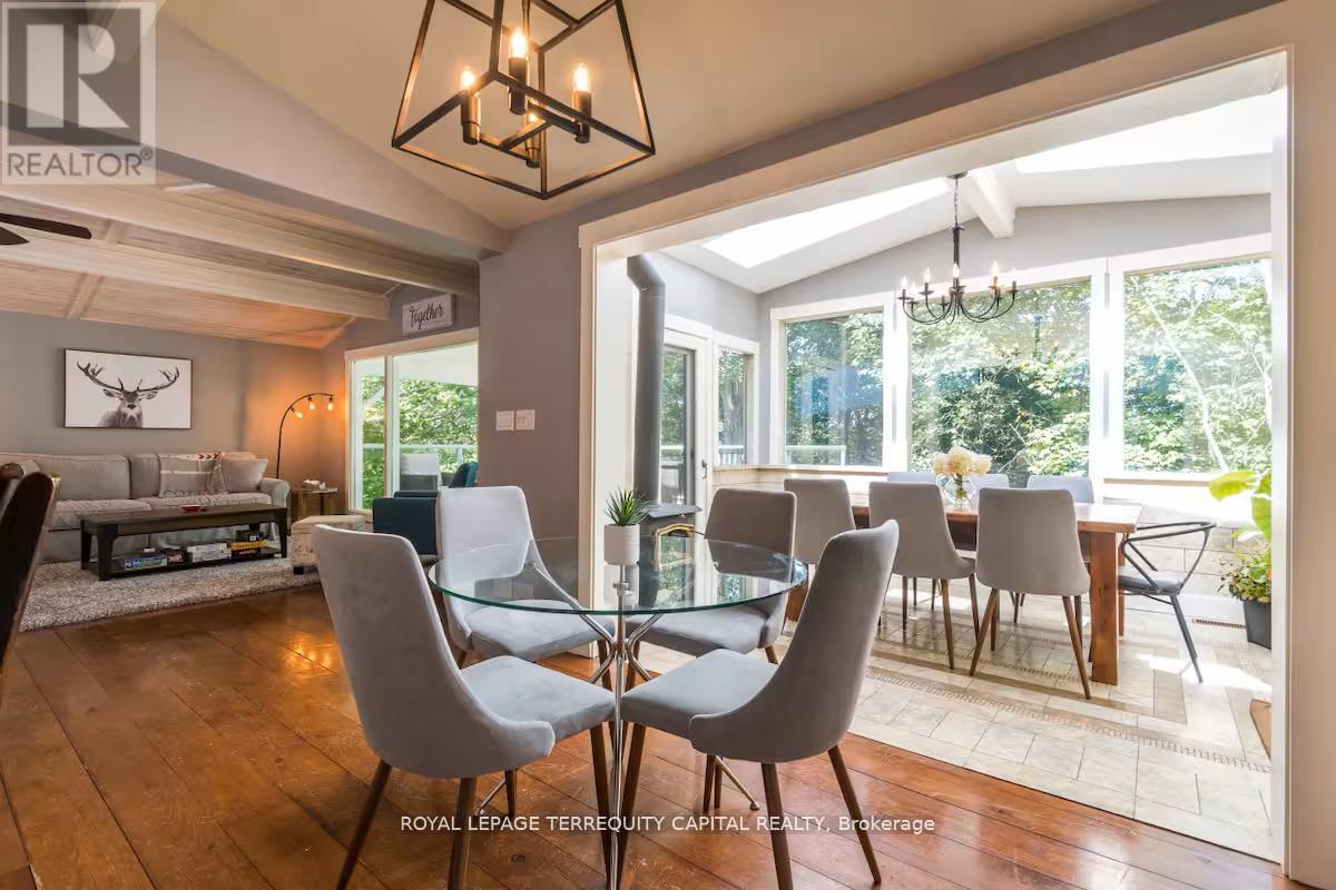 Perfect year-round family retreat in this stunning 4-bedroom, 3-bathroom home designed for comfort and relaxation. The open-concept main floor features a bright living and dining area with stunning views surrounding forest, office, spacious kitchen, and a serene primary suite with ensuite washroom. The finished lower level offers granite stone floors, a large family room, and three additional bedrooms-ideal for entertaining in any season. Enjoy the Muskoka room, expansive deck, and the beauty of nature all around. With a Double-car garage and bonus living space above, there's plenty of room for guests. Enjoy hot tub on lower deck, fire pit and wood burning sauna! 3 season large Sunroom, Bunkie Over the Garage! Don't miss this exceptional all-season getaway! (41967578)