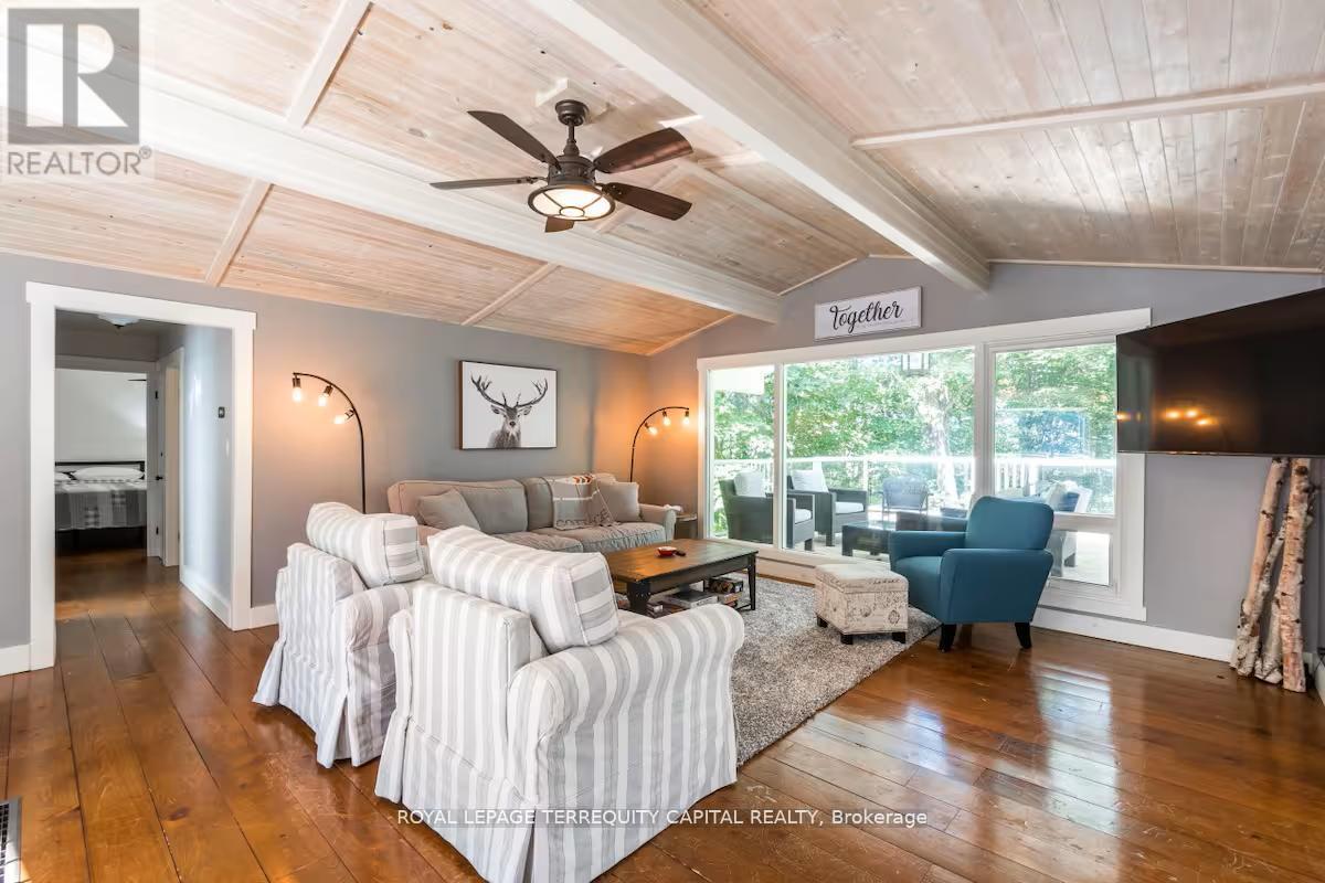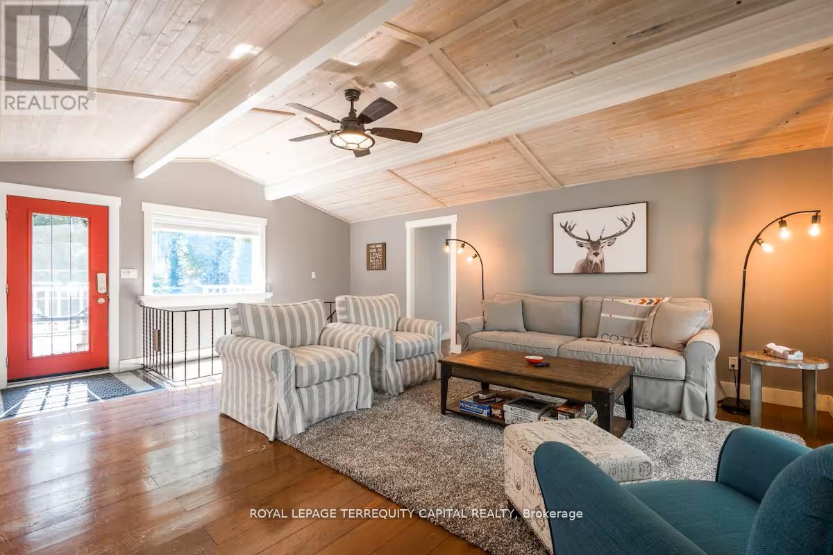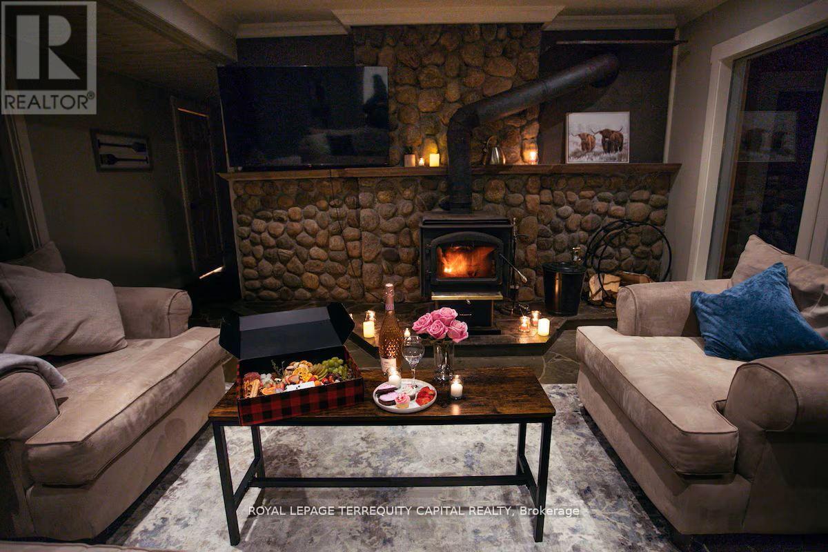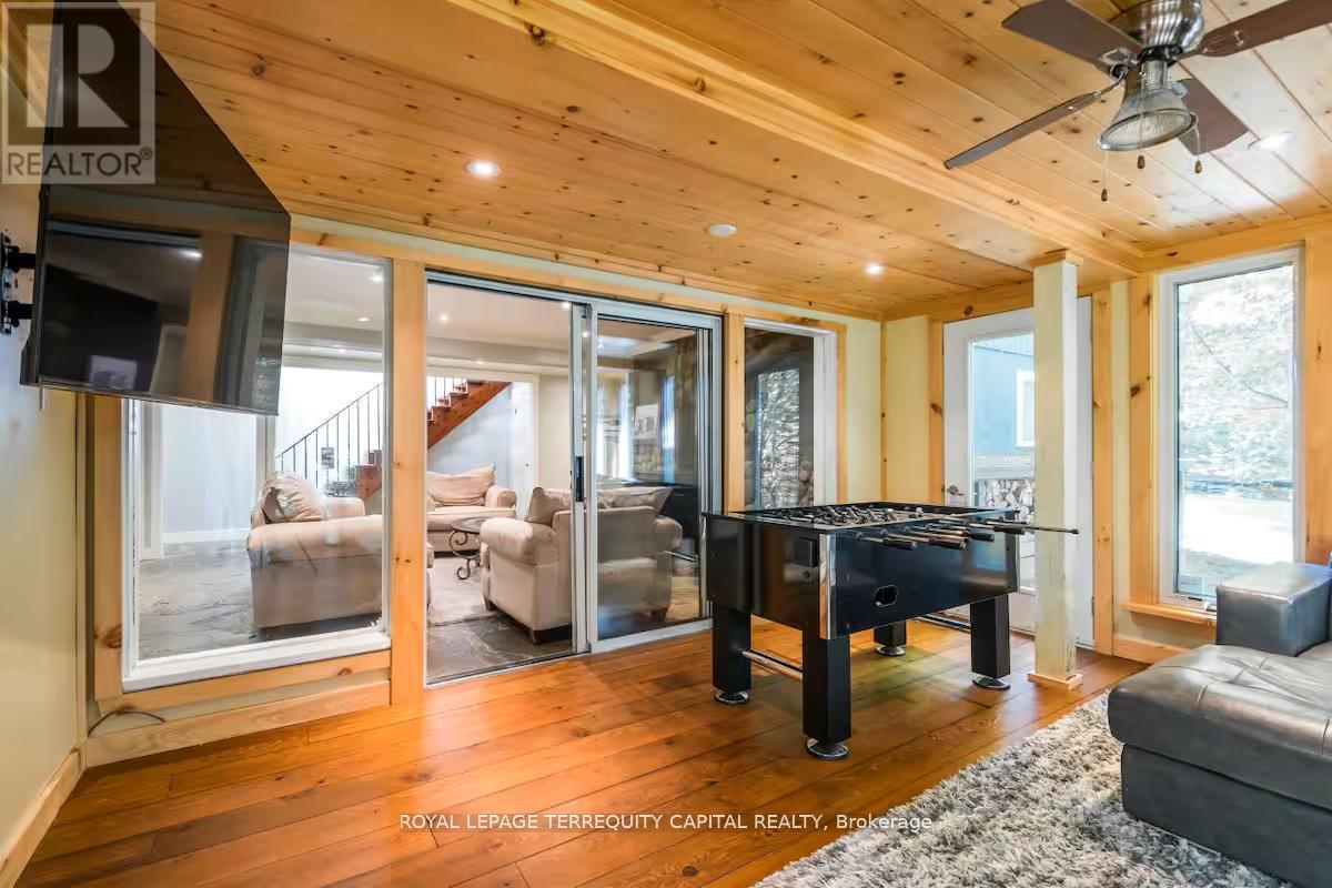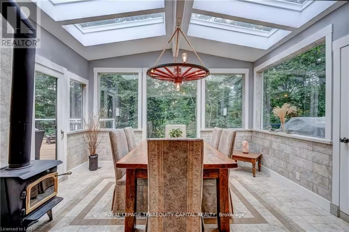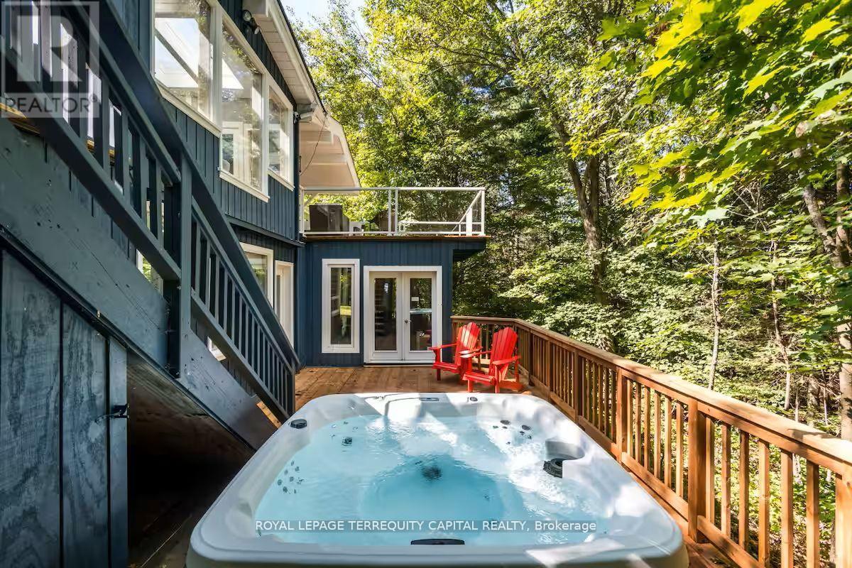Perfect year-round family retreat in this stunning 4-bedroom, 3-bathroom home designed for comfort and relaxation. The open-concept main floor features a bright living and dining area with stunning views surrounding forest, office, spacious kitchen, and a serene primary suite with ensuite washroom. The finished lower level offers granite stone floors, a large family room, and three additional bedrooms-ideal for entertaining in any season. Enjoy the Muskoka room, expansive deck, and the beauty of nature all around. With a Double-car garage and bonus living space above, there's plenty of room for guests. Enjoy hot tub on lower deck, fire pit and wood burning sauna! 3 season large Sunroom, Bunkie Over the Garage! Don't miss this exceptional all-season getaway! (41967578)