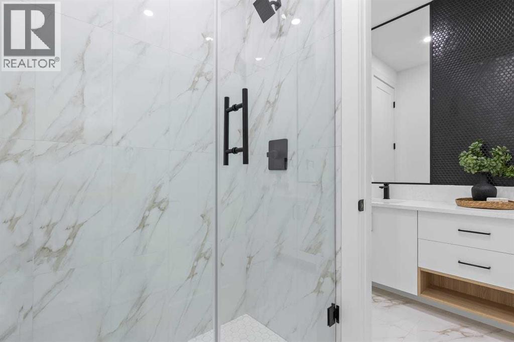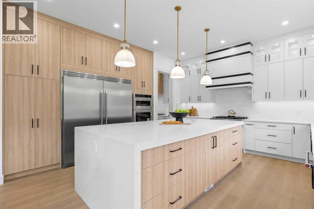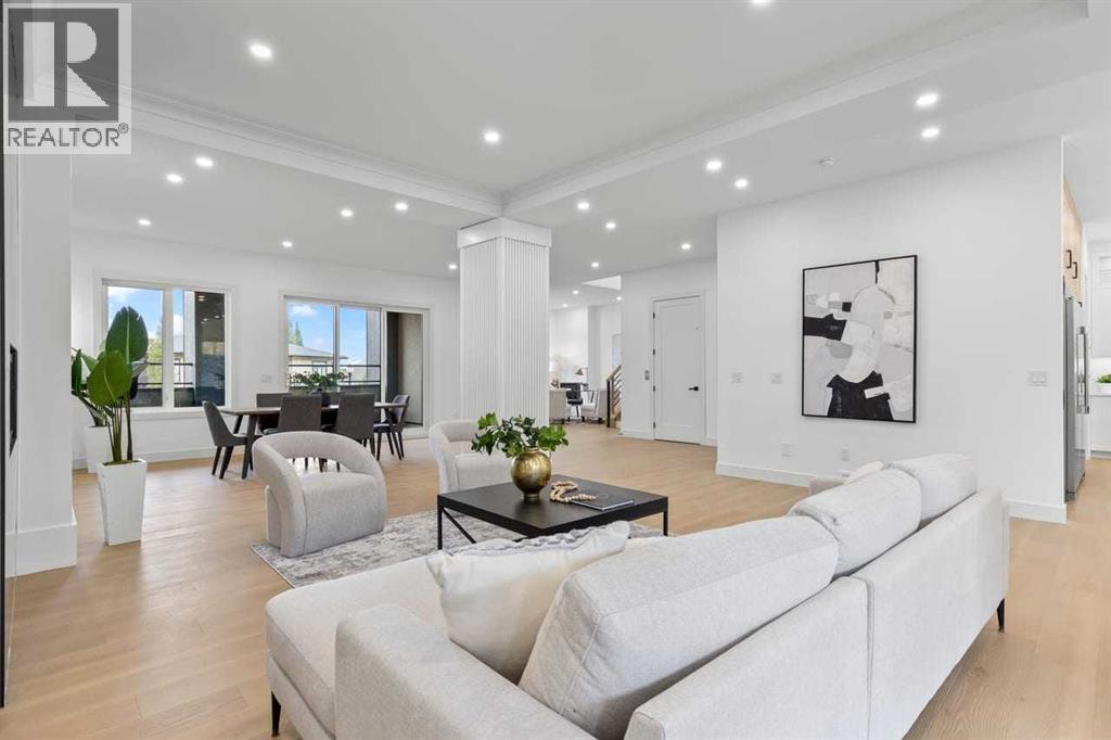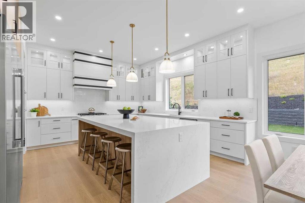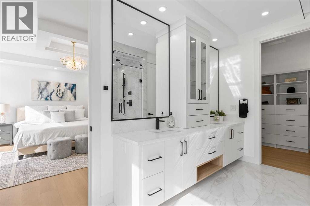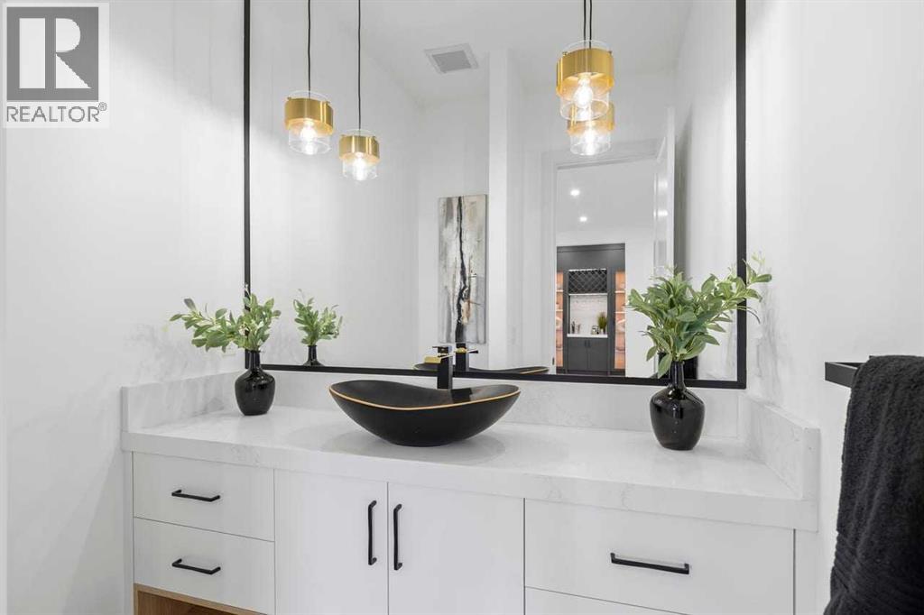 Set within the prestigious community of Patterson Heights – The Point - this exceptional luxury residence offers over 5,000 sq. ft. of elevated living designed for comfort and functionality. From the moment you arrive, the home makes a statement with a grand entryway highlighted by a floor-to-ceiling custom closet. Just off the entrance, a well-appointed mudroom features a walk-in closet and a striking full-height wall unit, providing direct access to the oversized double garage. The garage is fully outfitted with EV charging outlets, a gas heater rough-in, and hot and cold water taps. Completing this level is a full bathroom with quartz countertops and a floor-to-ceiling glass shower. The main living space is defined by 10-foot ceilings and wide vinyl plank flooring, creating a clean, modern flow throughout. The living room offers warmth and style with a custom wall unit and ambient LED lighting, while the dedicated bar area, complete with a bar fridge, is ideal for hosting. A private, light-filled gym with recessed lighting, floating shelving, and generous space for equipment. A striking open-riser staircase and a private elevator connect all 3 levels and lead to the stunning 2nd floor. Here, you’ll find a bright home office overlooking a large window, a sleek powder room, and a refined dining area anchored by a built-in LED-lit wall feature. Glass sliding doors open to a large East facing balcony, while the family room impresses with a coffered ceiling, art-block feature wall, and gas fireplace. Additional sliding doors lead to a fully landscaped backyard complemented by a composite rear deck with a gas line, backing onto peaceful green space, where nature and wildlife create a serene setting. The chef-inspired kitchen anchors the home with a quartz waterfall island, hidden cabinetry, two-tone modern cabinets, and high-end stainless steel appliances. A fully equipped spice kitchen allows for effortless entertaining, while a modern breakfast nook with a statement light fixture completes the space. The upper level is a private sanctuary, beginning with a grand primary suite set behind French doors. Enjoy a private balcony overlooking green space, a juice bar, in-floor heated ensuite, and a spa-style bathroom featuring a freestanding tub and a glass-enclosed steam shower with rainfall head and granite seating. Two additional bedrooms share a Jack & Jill bathroom with quartz countertops, while a fourth bedroom offers its own full bath and walk-in closet. A thoughtfully finished laundry room enhances everyday convenience. A bonus room with downtown views and an additional wall unit completes the upper level, which continues the home’s open feel with 9-foot ceilings throughout. Additional highlights: basement under-slab heating rough-in, a 75-gallon hot water tank, two high-efficiency furnaces, two central A/C units, and extensive built-in cabinetry. Don't miss the opportunity to own this exceptional luxury home. Book your private showing today! (31542716)