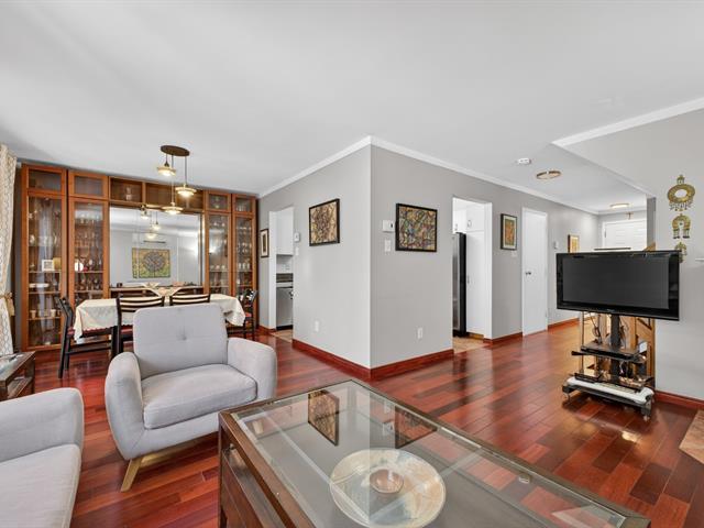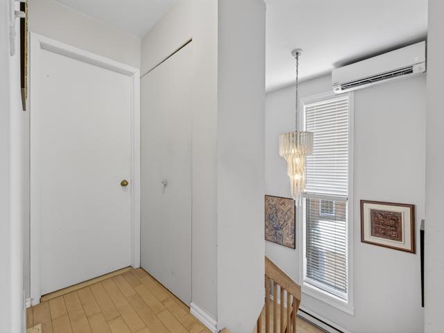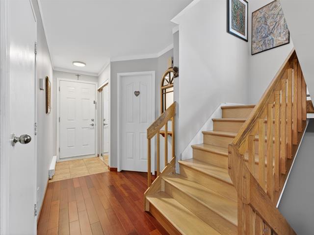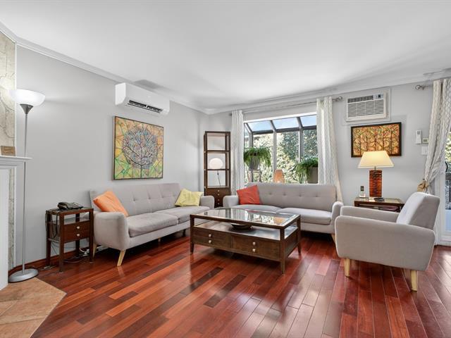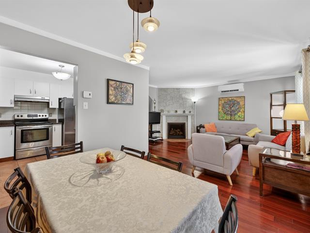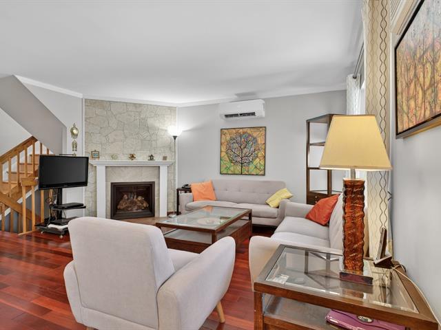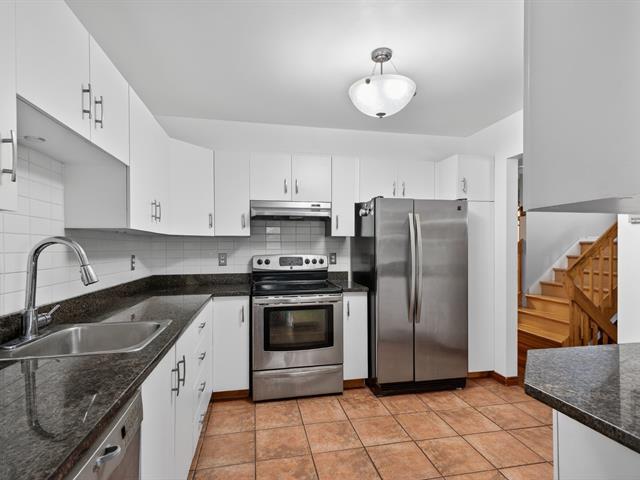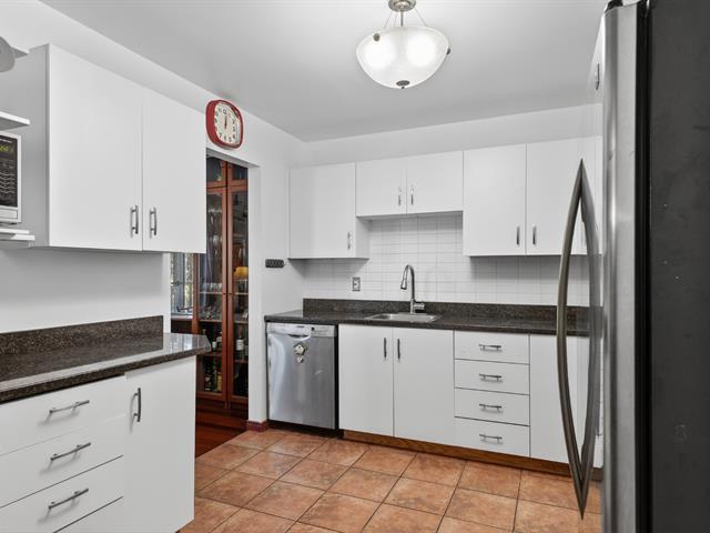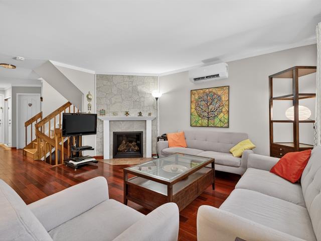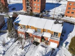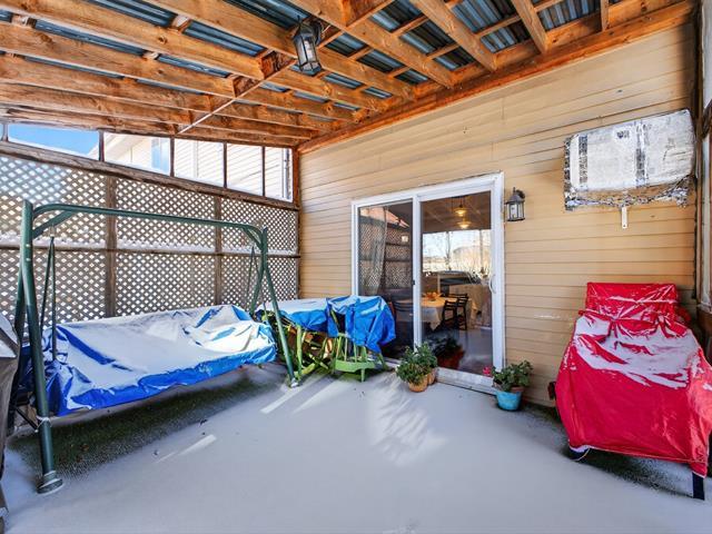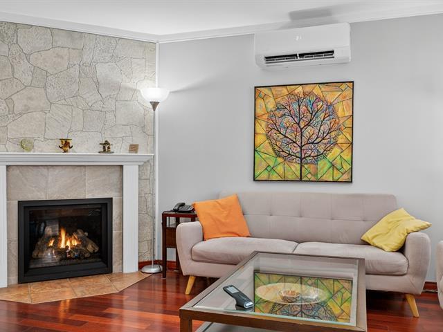 Spacious end unit townhouse walking distance to the REM. Huge pie shaped fenced/hedged lot. 2 1/2 baths, 2 new heat pumps, gas fireplace, solarium window LVR, three season solarium, updated kitchen with granite counters, wood floors levels 1 and 2, tiled garage floor (39222704)