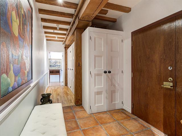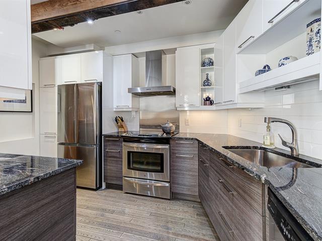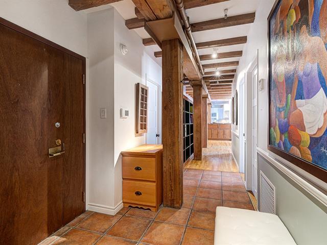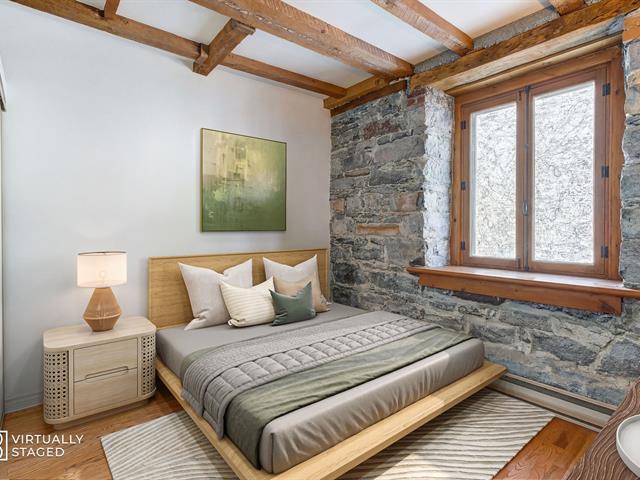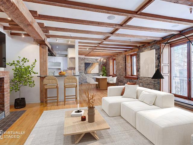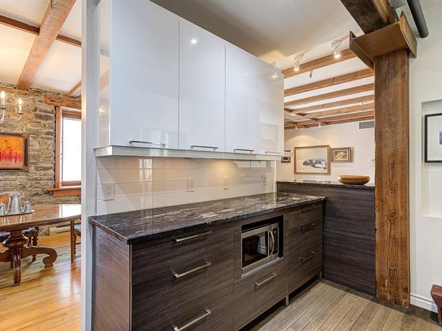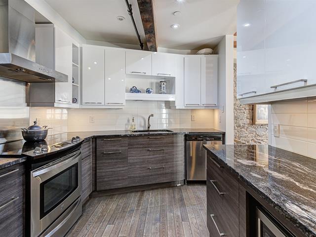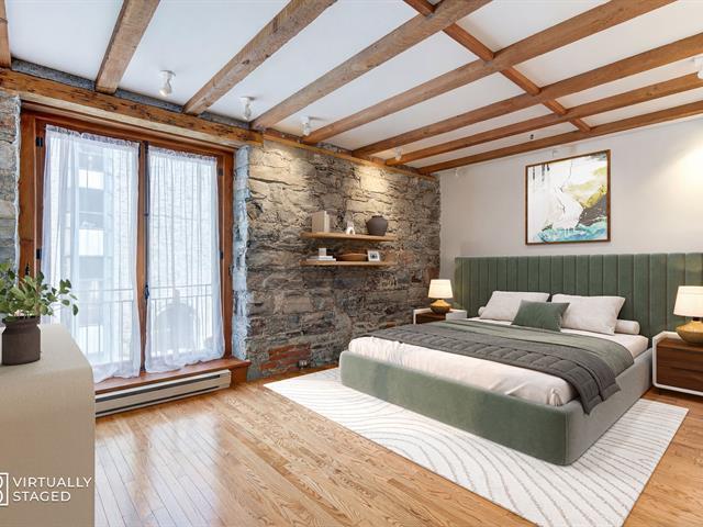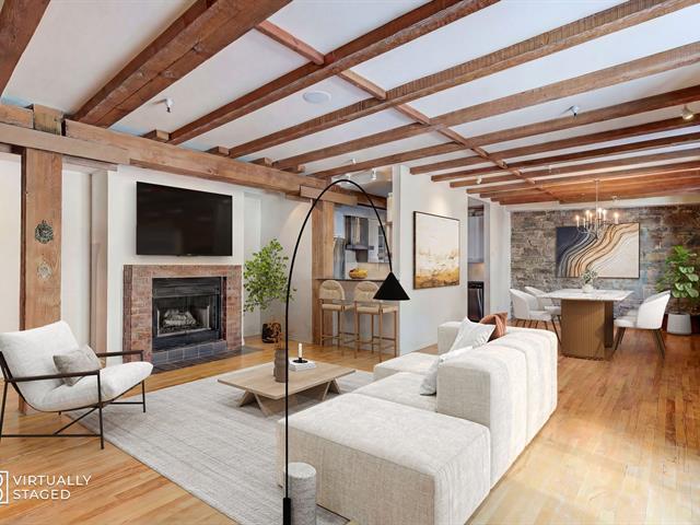 'The Youville' Gardens' Prestigious address, prime location facing the St-Lawrence River and The Old Port of Montreal. Wonderful 3 bedroom condominium bodes original cachet, beamed ceiling, stone walls, French windows and hardwood floors throughout. Open concept LVR/DNR, equipped kitchen, in-unit laundry within bathroom, ensuite bathroom and walk-in closet, 2 additional and spacious bedrooms. Common rooftop terrace, steps to bike path, museum, CentrePhi, restos, cafés, boutiques, hotels, transport & services...Garage & locker. Must see! A unique opportunity ! (41106055)