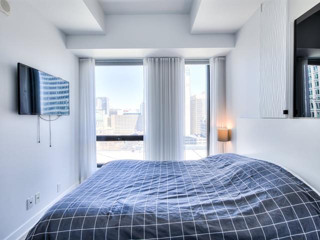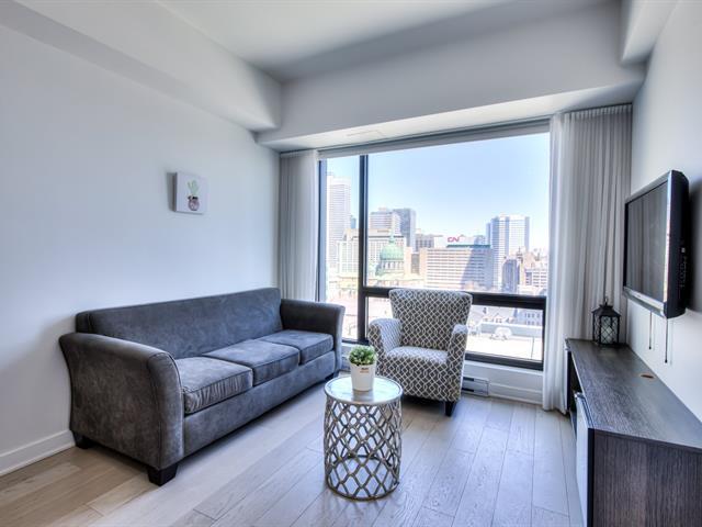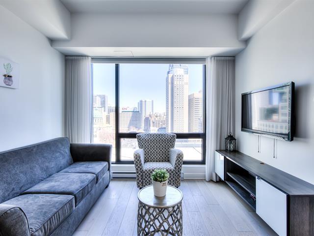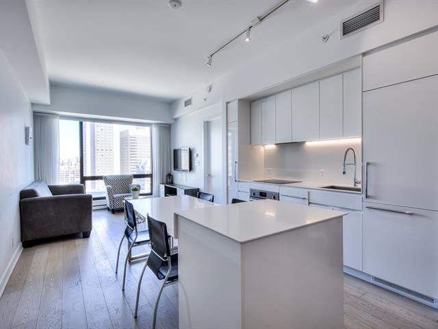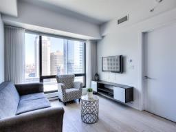Welcome to the Tour des Canadiens Phase 1. This FULLY FURNISHED 17th-floor residence offers sun-filled panoramic city views in the heart of downtown. Enjoy 1 bedroom and 1 den, featuring a bright, open-concept living and dining space. The building provides 24/7 concierge service, pool, sauna, gym, terrace, and BBQ area - perfect for entertaining or relaxing while enjoying the cityscape. Ideally located just steps from the Bell Centre, metro and train access, restaurants, universities, Sainte-Catherine Street, more. A must see! (40172782)