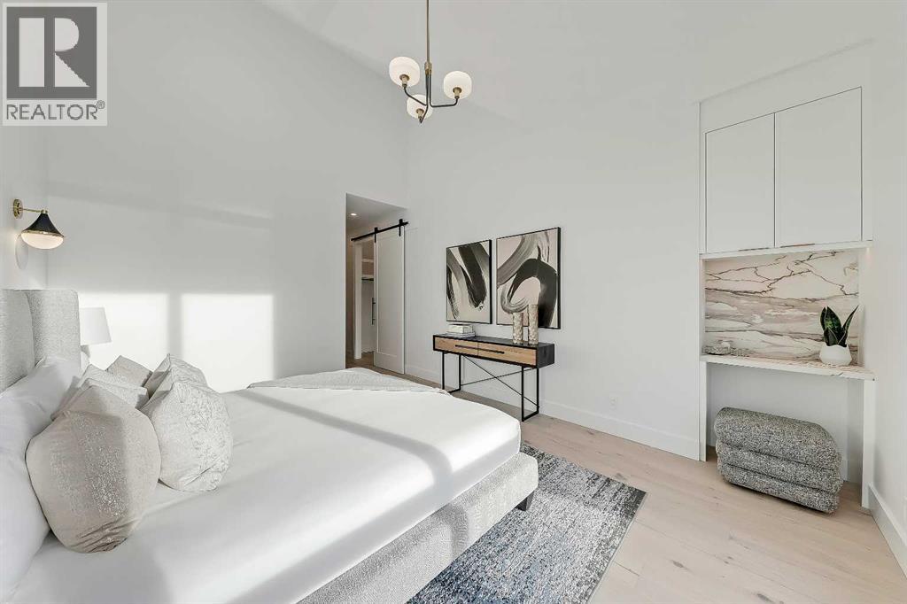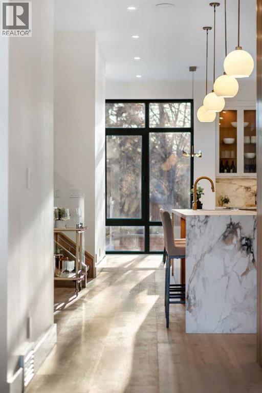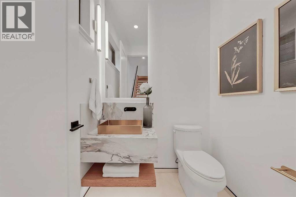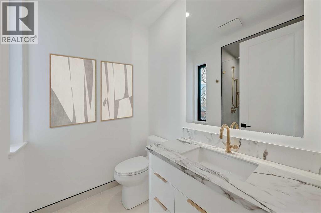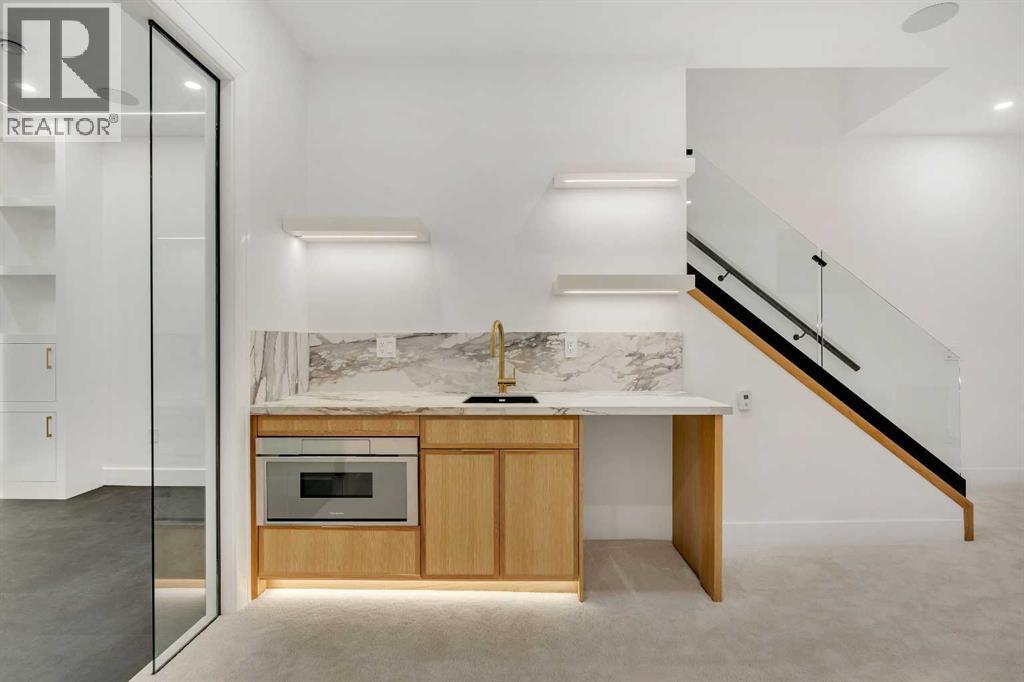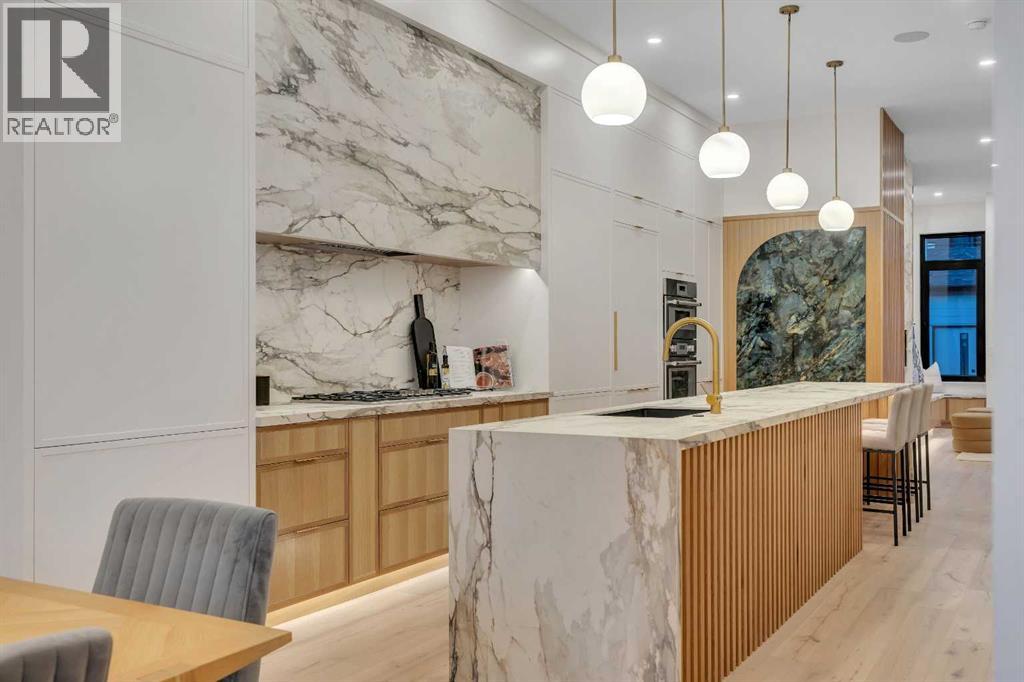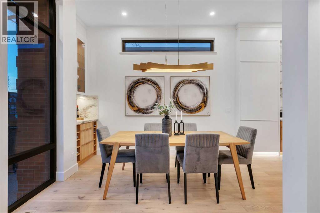 Architectural distinction meets contemporary luxury in this newly built custom home designed by JTA Design and expertly built by Brick Developments. Located in the heart of Inglewood, one of Calgary’s most iconic inner-city communities, the residence features steep-pitched rooflines, timeless brick detailing, and expansive windows that blend modern design with enduring architectural character.Steps from the Bow River pathways and surrounded by Inglewood’s renowned shops, restaurants, music venues, and breweries, the location offers an exceptional inner-city lifestyle.The open-concept main floor is designed for elevated living & entertaining, showcasing high ceilings, wide-plank hardwood flooring, and curated designer finishes. The chef’s kitchen features full-height custom cabinetry, HONED PORCELAIN countertops, backsplash & hood fan, a stunning PORCELAIN feature wall with built in clock, concealed walk-in pantry, waterfall island, and a premium THERMADOR appliance package including gas cooktop, wall oven, integrated refrigerator & dishwasher, and a beverage fridge. The dining area includes a statement chandelier and built-in buffet with wine storage and glass custom cabinetry, while the living room offers a custom media wall, inset gas fireplace, and full-height quartz surround overlooking the private backyard. A mudroom, powder room, and striking full-height GLASS WALL staircase complete the main level.Upstairs, the primary suite features vaulted ceilings, an expansive walk-in closet with custom built-ins, offering refined storage & functionality, and a spa-inspired ensuite with heated floors STEAM SHOWER, dual vanities, and freestanding soaker tub. A spacious laundry room with quartz counter, built-in cabinetry, and sink, along with two additional bedrooms—each offering PRIVATE ENSUITES with HEATED tile floors and walk-in closets nicely round off this level.The fully developed basement features radiant in-floor heating, soaring 10-FT ceilings, and an expan sive recreation area with a built-in media centre. A custom wet bar with sink & microwave drawer, dedicated home gym, fourth bedroom, three-piece bathroom, and a discreet pocket office with built-in workstation complete the level. Outside, the home is professionally landscaped and complemented by a fully finished garage with gas rough-in for a future heater. This is an exceptional opportunity to own a thoughtfully designed architectural home in one of Calgary’s most sought-after inner-city communities. (31548989)