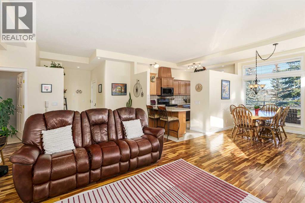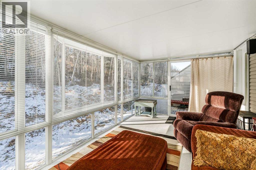 QUIET LOCATION, OVERSIZED DOUBLE ATTACHED GARAGE, COVERED SCREENED DECK! Welcome to exceptional living in Crawford Ranch, one of Cochrane’s quietest and most scenic communities. Downsize in style in one of the town’s most exclusive condo offerings. This rare home gives you everything you love about a single-family property including an oversized heated double car garage (29X25) and an impressive (10x15) three-season sunroom overlooking mature trees and wild life. Step off your private keyed elevator directly into your suite and enjoy an open-concept floor plan with high ceilings, hardwood flooring, and plenty of natural light. The generous primary bedroom offers a walk-in closet, full 4-piece ensuite, and direct access to the sunroom oasis. A flexible second bedroom with a built-in murphy bed is perfect for visiting family or a dedicated office space. The suite also features in-unit laundry, fresh paint within the last two years, and abundant in-suite storage that makes day-to-day living convenient and organized.With incredible pathways along the Bow River just steps from your door, peaceful surroundings, and no rear neighbours, this location is ideal for those seeking tranquility. Additionally, the home includes A/C, a heated garage, and appliances that are all 2020 or newer. This is downsizing done right. Quiet, scenic, and low-maintenance living without compromise.Opportunities like this do not come up often; schedule your private tour today! (31549026)