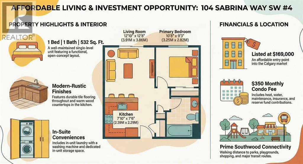 Welcome to Unit 4, 104 Sabrina Way SW, tucked into the quiet, tree-lined community of Southwood. This well-maintained 1-bedroom 1 bath unit offers a comfortable and FUNCTIONAL LAYOUT, perfect for anyone looking for a peaceful place to call home.The unit features DURABLE TILE FLOORING throughout, complemented by warm wood countertops that add character and a touch of rustic charm. The kitchen comes fully equipped with a fridge, stove, and microwave, making everyday living easy and efficient. Enjoy the convenience of IN-SUITE LAUNDRY with your own washing machine, plus IN-UNIT STORAGE to keep things organized and clutter-free. Located in a calm, established neighborhood, with shopping, parks, major routes, and WALKIN DISTANCE TO ANDERSON C-TRAIN, this unit offers a great balance of PRIVACY, simplicity, and accessibility.A cozy, LOW-MAINTAINANCE and LOW CONDO FEE home in a location you’ll love. (31554143)