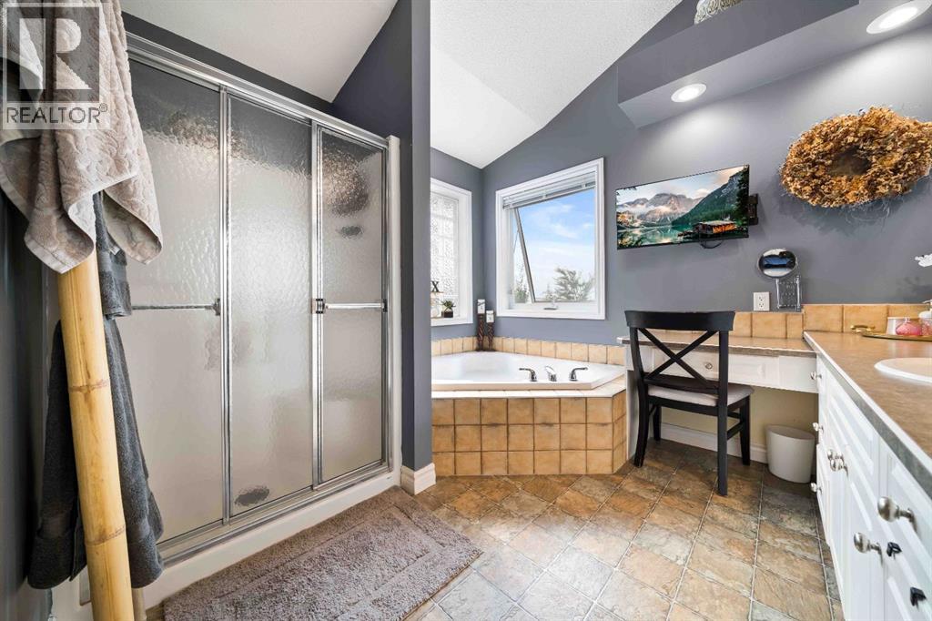 Welcome to 110 Redcliff Way SW, a bright and inviting walkout bungalow just six houses from the edge of the Redcliff Golf & Country Club, and only a one-minute drive to the clubhouse. With vaulted ceilings, skylights, and large windows framing stunning panoramic views of the coulees, this home blends peaceful living with thoughtful functionality. At the front of the home, a flexible room currently used as a butler’s pantry offers extra prep space, cabinets, and a second fridge — but could also serve as a home office, sitting area, or den. Just off the heated and insulated double garage, you'll find a boot room with closet for storing all your outdoor gear. The main living area opens into a bright, open-concept kitchen/dining/living space. Enjoy crisp white cabinetry, newer laminate countertops, stainless steel appliances, a corner pantry, breakfast bar, and island — perfect for family meals and entertaining. A 2pc guest bathroom is conveniently located just off the kitchen. From the spacious dining area, step out onto your deck with a built-in gazebo, ideal for soaking in the expansive prairie skies and coulee views. Watch summer storms roll in or unwind in the hot tub after a long day. The large backyard includes a sprawling grassed area, paved patio, above ground pool and underground sprinklers for easy lawn maintenance. The primary bedroom retreat features a vaulted ceiling, walk-in closet, plus a 4pc ensuite with a jetted tub, shower, oversized vanity, and large mirror. Downstairs, the fully finished basement boasts 9-foot ceilings, a cozy living area with fireplace, double-door bedroom (currently a music room), two additional large bedrooms, a 4-piece bathroom, and a fifth bedroom currently used as a home gym. A separate laundry room and utility/storage space add even more function. This home checks all the boxes for relaxed living just steps from the golf course, with room for guests, hobbies, and hosting — both indoors and out. 110 Redcliff Way SW — Lifestyle , space, and scenery, all in one. (31565796)