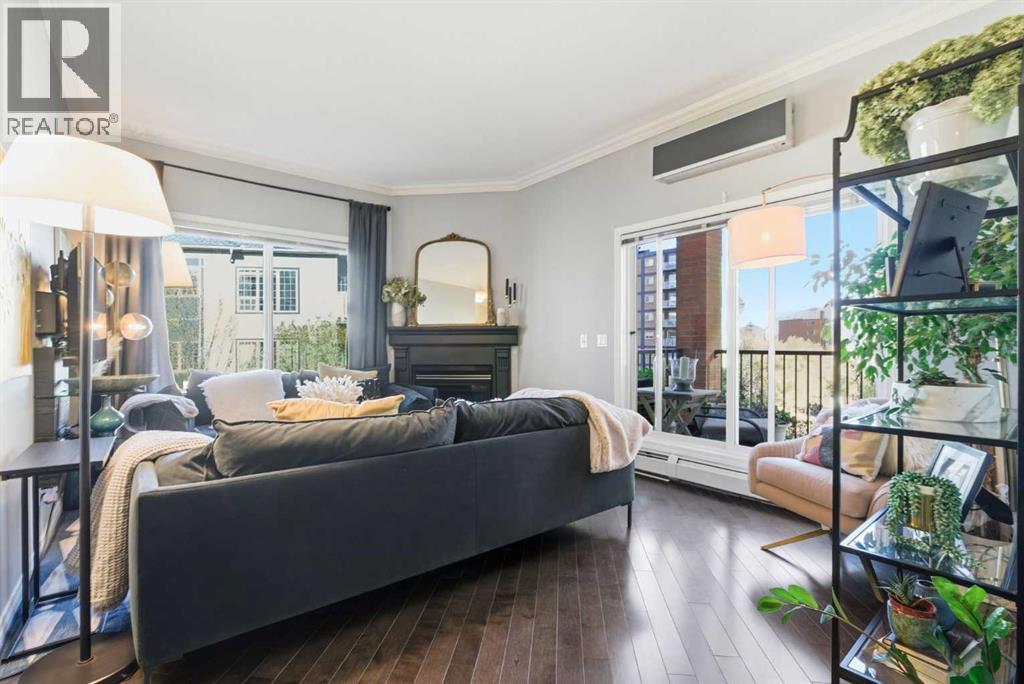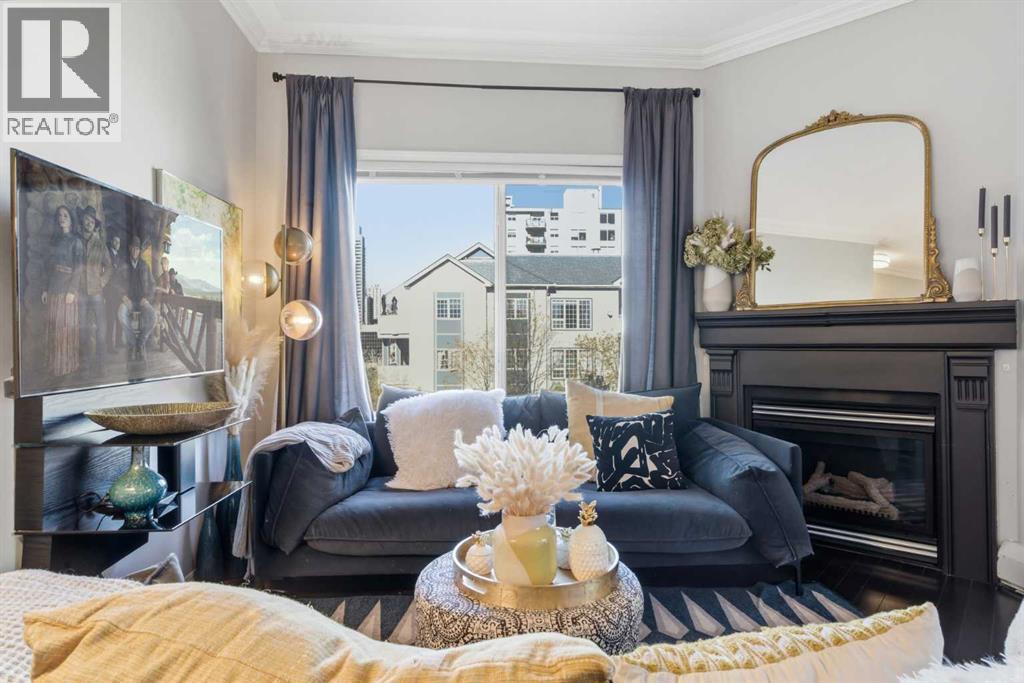 Experience sophisticated urban living in this beautifully upgraded 2-bedroom, 2-bathroom executive condo, ideally located with direct +15 access to GoodLife Fitness, London Drugs, top restaurants, and just steps from the boutiques and nightlife of 17th Avenue. Enjoy a highly walkable lifestyle with easy access to downtown and the Bow River Pathway system. This light-filled, modern residence features designer lighting, expansive windows, and an open-concept layout. The chef-inspired kitchen boasts a sleek peninsula island with eating bar, premium stainless steel appliances, classic subway tile backsplash, and timeless white cabinetry. An elegant dining area flows into the spacious living room, complete with a stylish fireplace and breathtaking panoramic city views. Step onto the covered balcony to enjoy morning coffee or evening sunsets year-round. The primary suite offers a luxurious retreat with a full private ensuite, while the second bedroom and full guest bath provide comfort and flexibility. Additional features include in-suite laundry, secure underground parking, and ample storage.Perfect for professionals or those seeking an upscale urban sanctuary—this home offers the ultimate in downtown luxury living. (31571062)