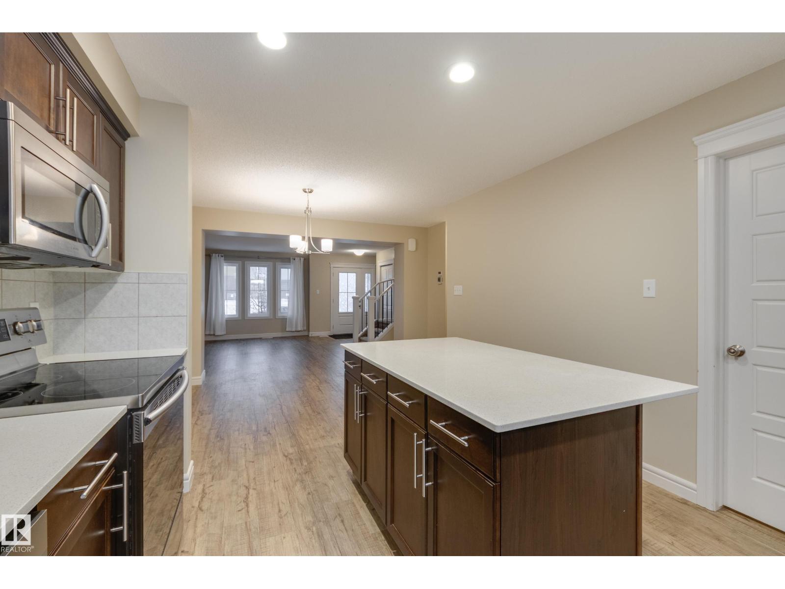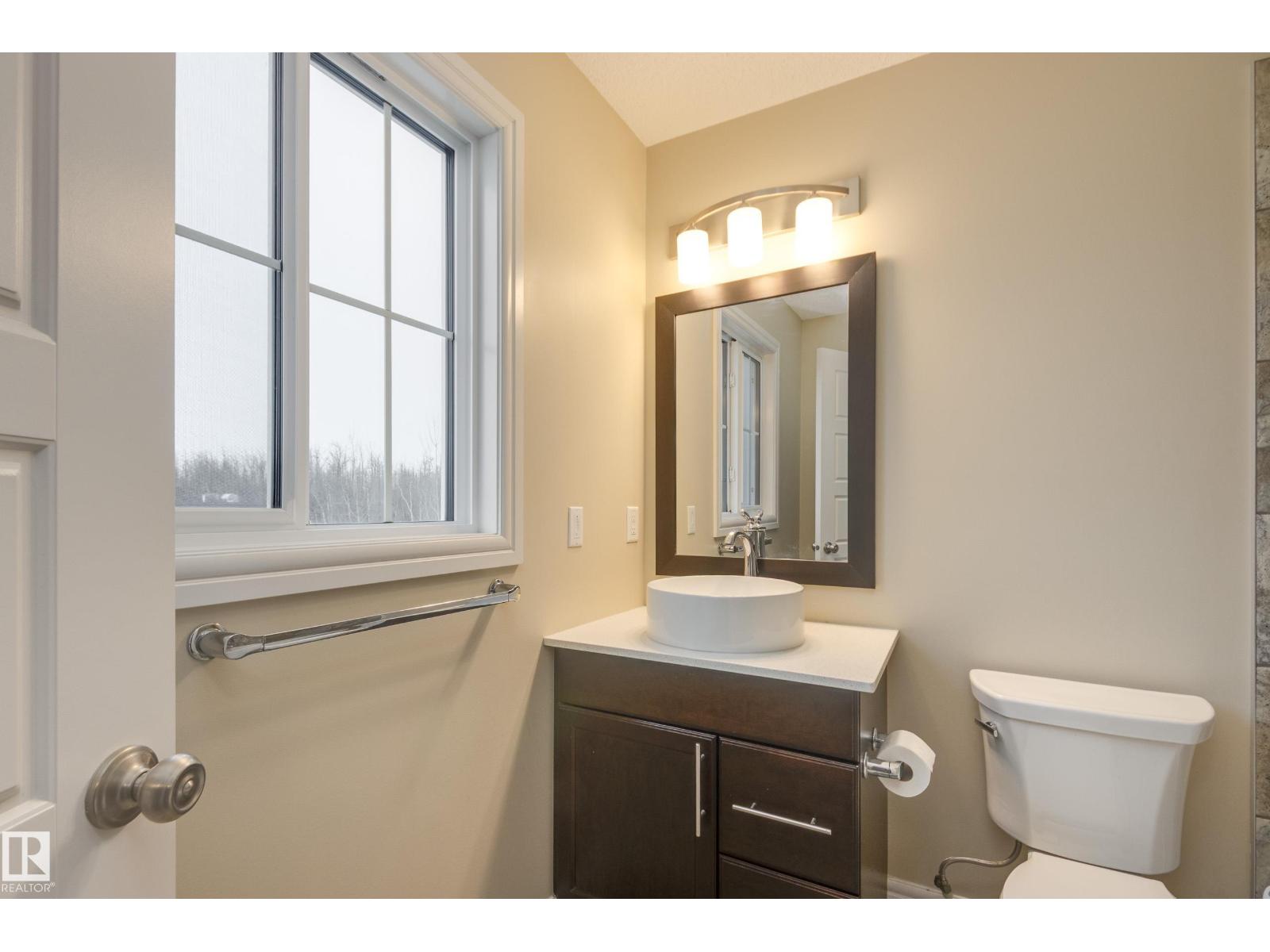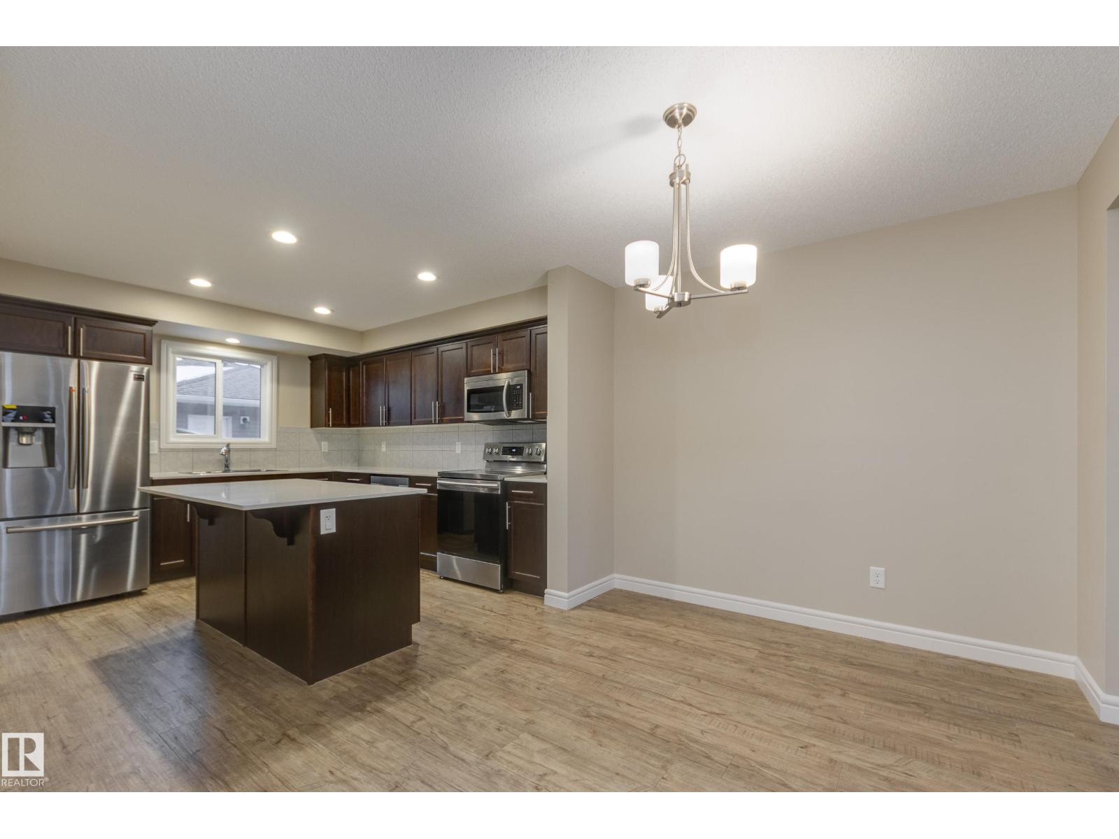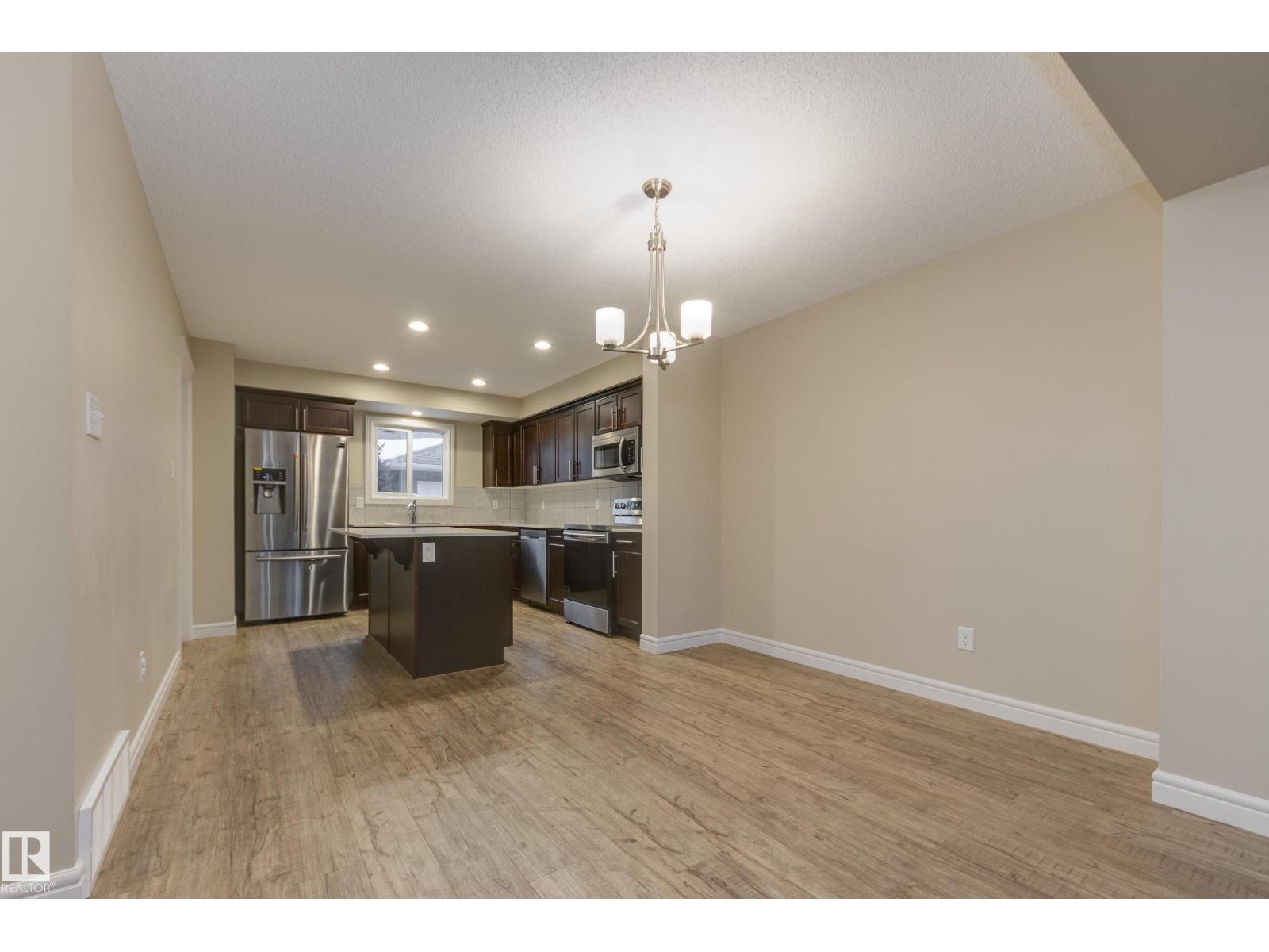 Delightful Desrochers townhome has NO CONDO FEES! Everything you could ask for PLUS a double detached garage. Great location across from the school and park. Spacious front foyer and a very open main floor with living room flowing through to dining and the kitchen at the back has a large island, quartz counter tops and lots of cabinets. Stainless steel appliances are included. Main floor laundry room at the back entrance and the half bath is strategically located at the basement entry. Basement is not developed but potential is there for adding more living space in future! The staircase to the second floor has spindle rails and an open area at the top of the stairs plus two good sized bedrooms share a full bathroom. The primary suite is large with a full ensuite bath and a large walk-in closet. This is a perfect affordable home in an exceptional location. Also includes water treament!! (33770301)