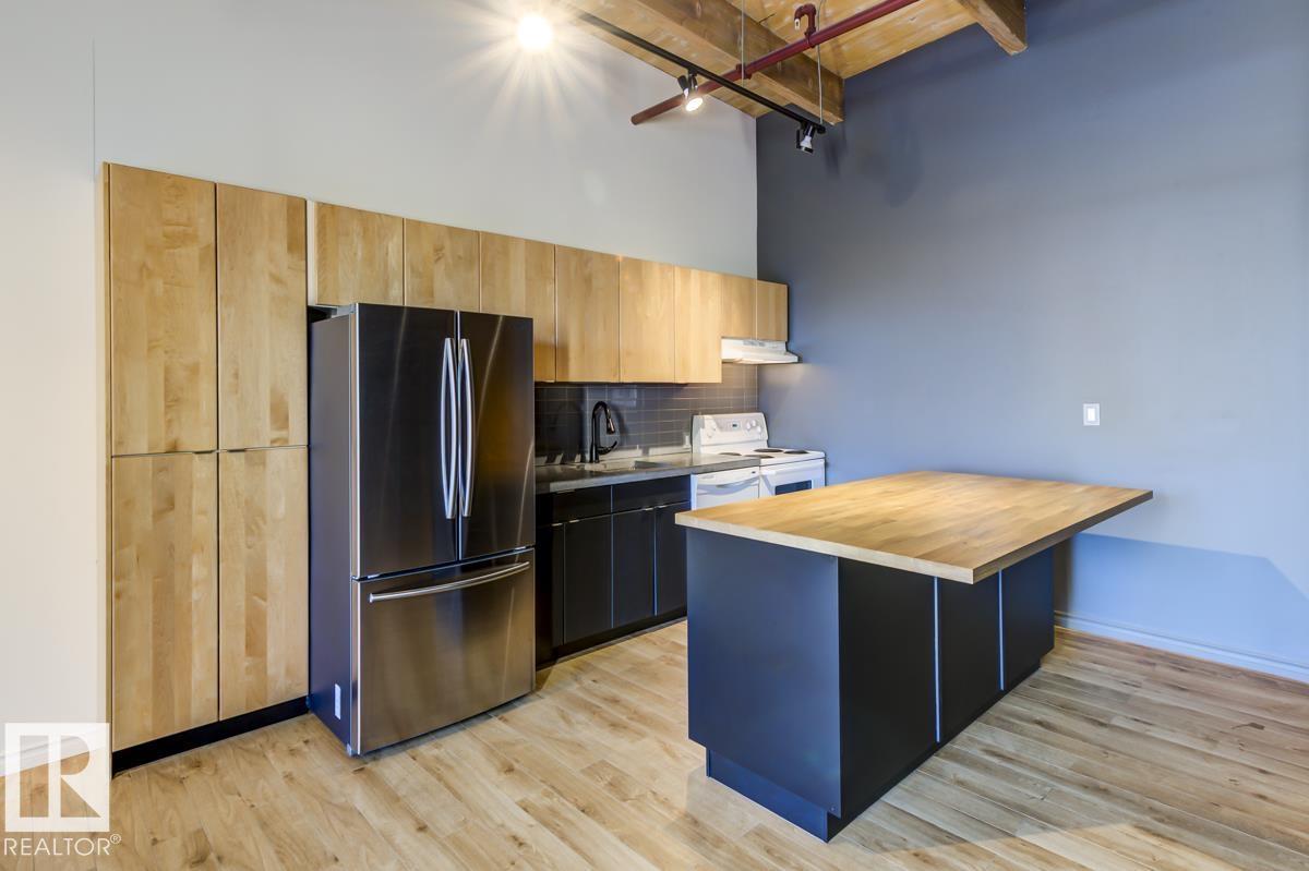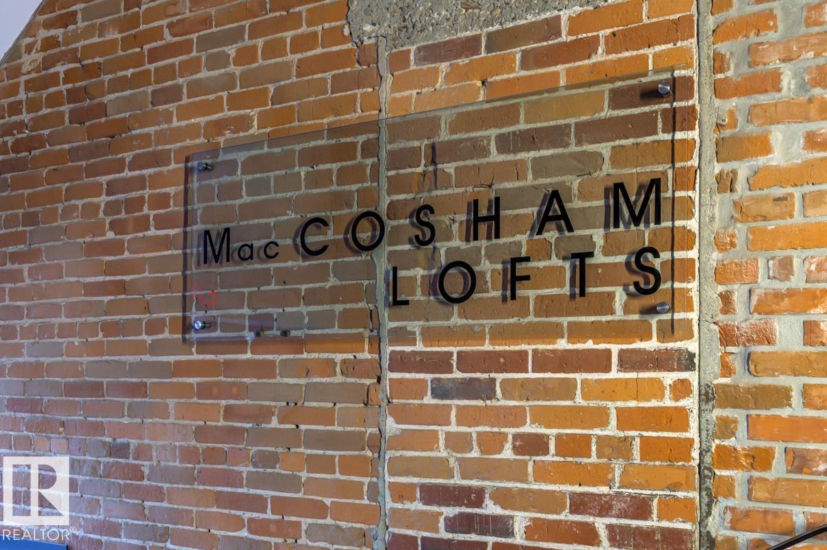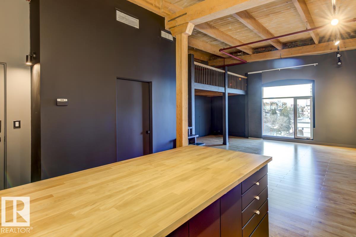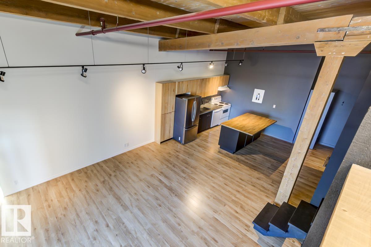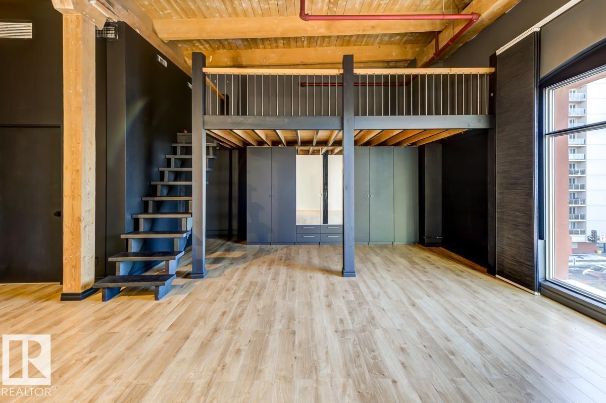 This is a true historic warehouse loft, authentic, architectural, and incredibly rare. Located in one of Edmonton’s most respected warehouse conversions, this top-floor corner-unit loft offers approximately open, flexible living space with soaring 13-foot exposed timber ceilings, original beams and columns, and beautiful west-facing light. The open-concept layout is currently configured as a one-bedroom plus den with a raised loft and massive built-in wardrobe, while still allowing for creative customization. Thoughtful updates include new laminate flooring, concrete countertops, a modern kitchen island, in-suite laundry, air conditioning, and a beautifully renovated bathroom. Underground titled parking and exceptionally low condo fees that include heat and water add tremendous value. Perfectly situated in the Warehouse District, steps from 104 Street, the Ice District, Brewery District, and post-secondary institutions, this is authentic urban loft living. (33772711)