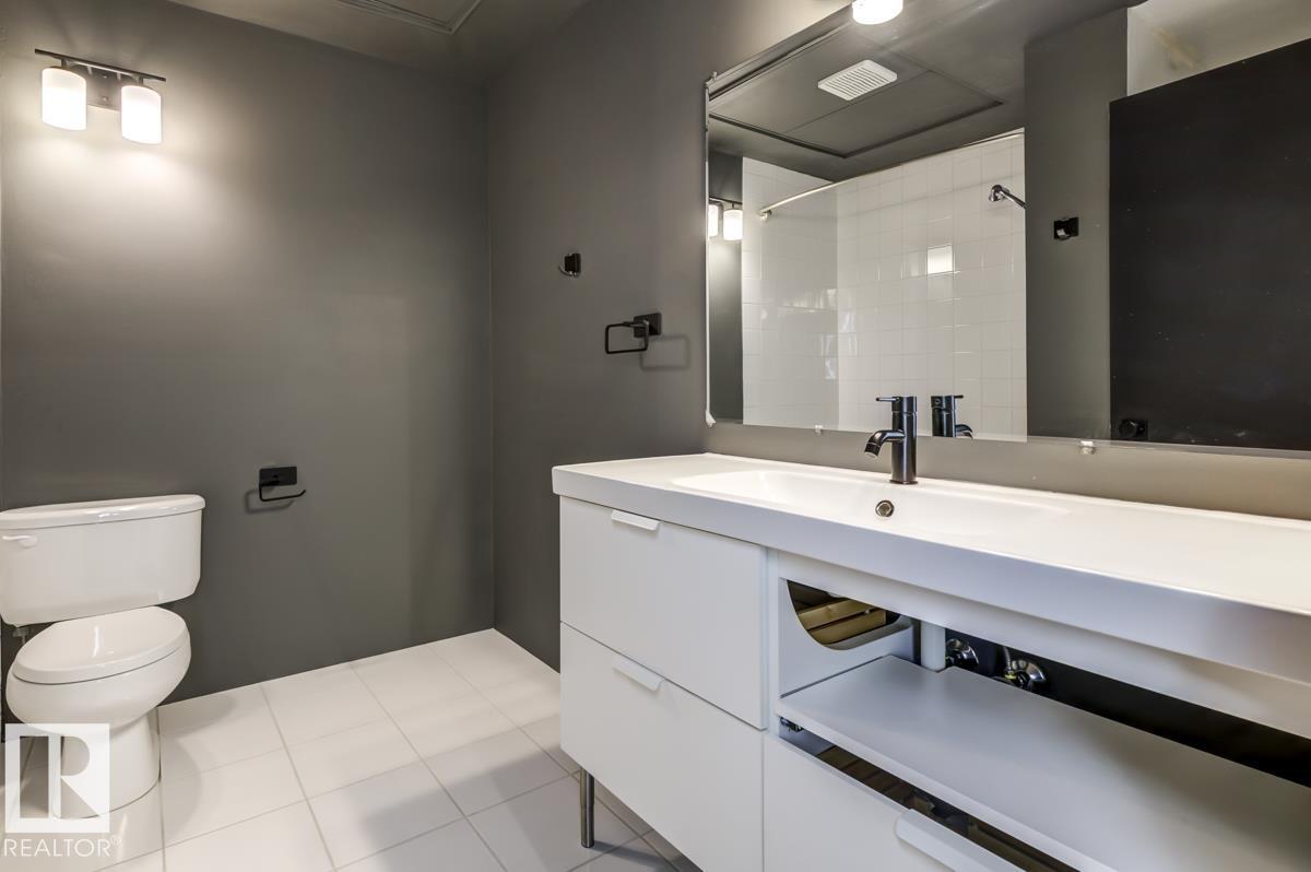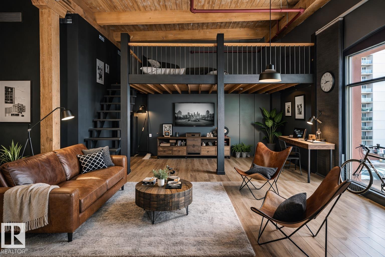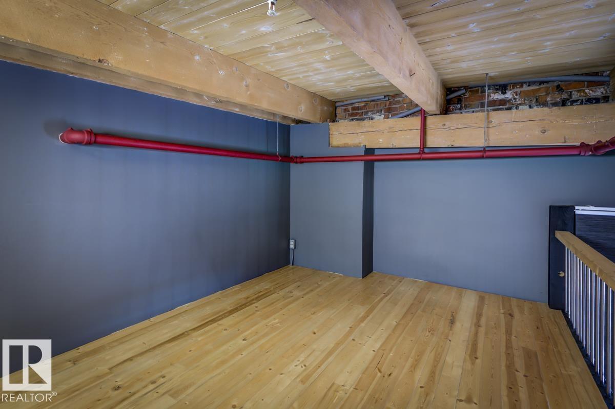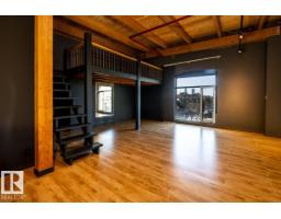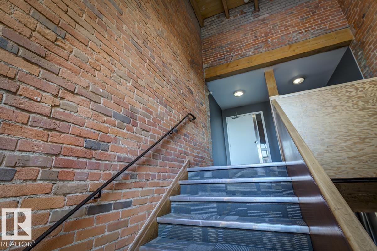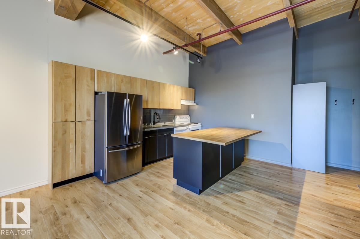 This is a true historic warehouse loft, authentic, architectural, and incredibly rare. Located in one of Edmonton’s most respected warehouse conversions, this top-floor corner-unit loft offers approximately open, flexible living space with soaring 13-foot exposed timber ceilings, original beams and columns, and beautiful west-facing light. The open-concept layout is currently configured as a one-bedroom plus den with a raised loft and massive built-in wardrobe, while still allowing for creative customization. Thoughtful updates include new laminate flooring, concrete countertops, a modern kitchen island, in-suite laundry, air conditioning, and a beautifully renovated bathroom. Underground titled parking and exceptionally low condo fees that include heat and water add tremendous value. Perfectly situated in the Warehouse District, steps from 104 Street, the Ice District, Brewery District, and post-secondary institutions, this is authentic urban loft living. (33772711)