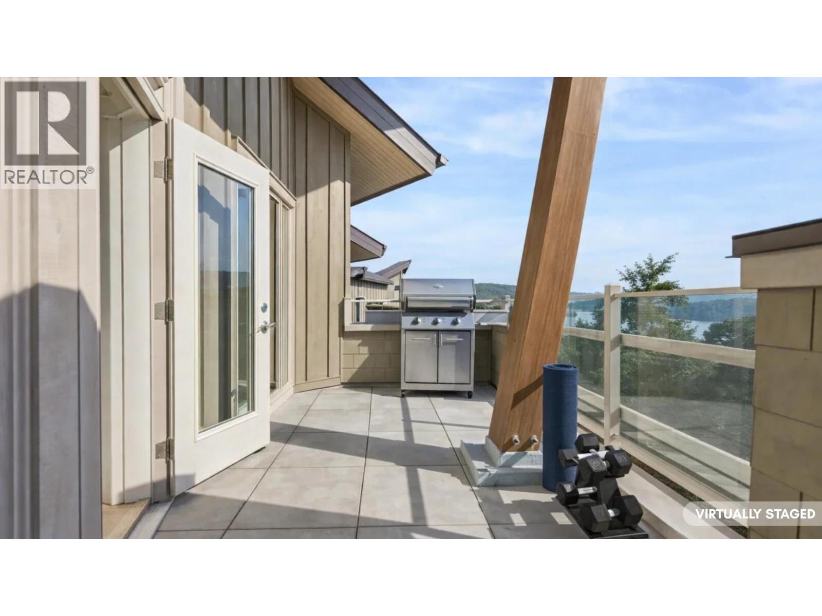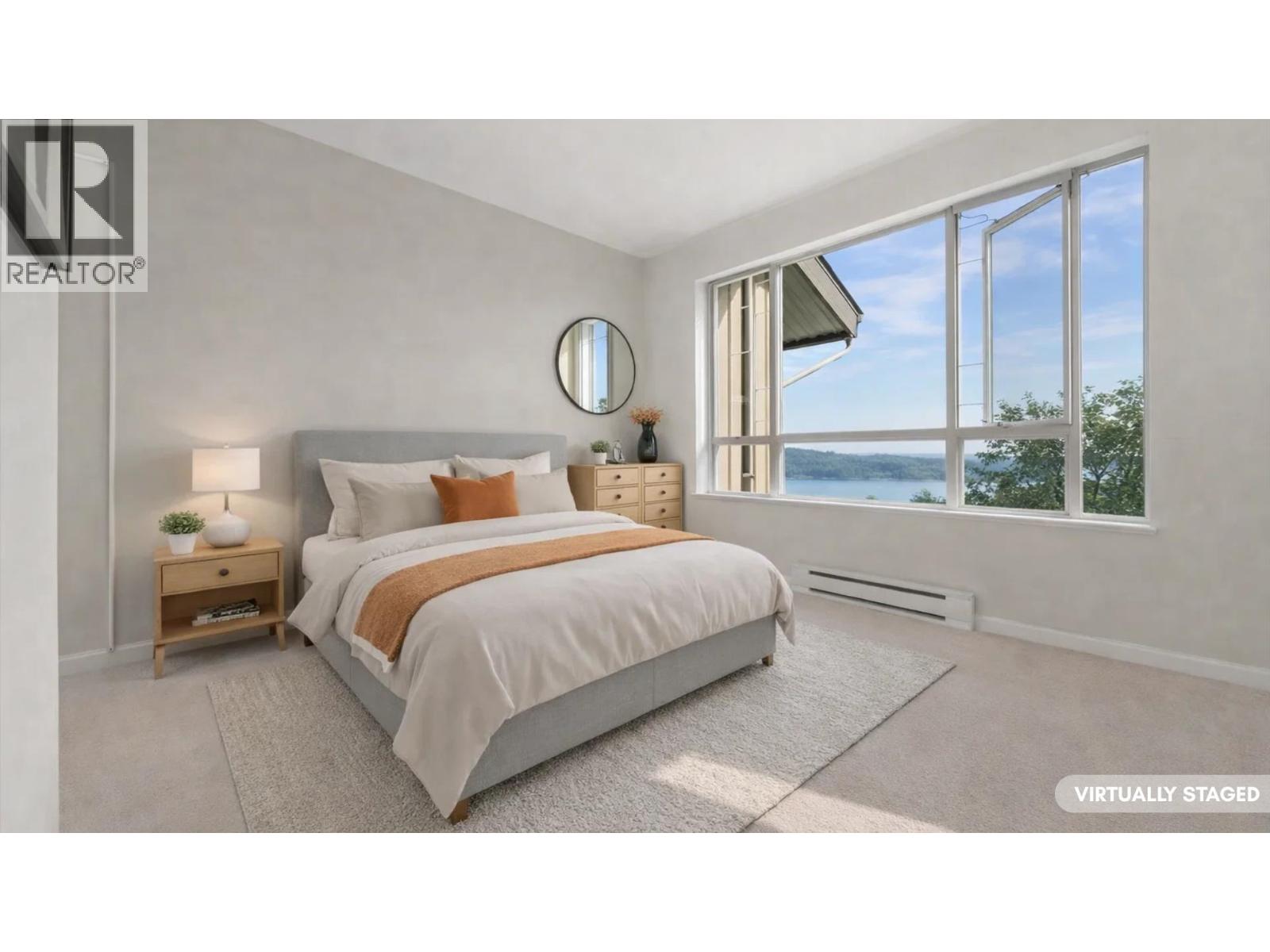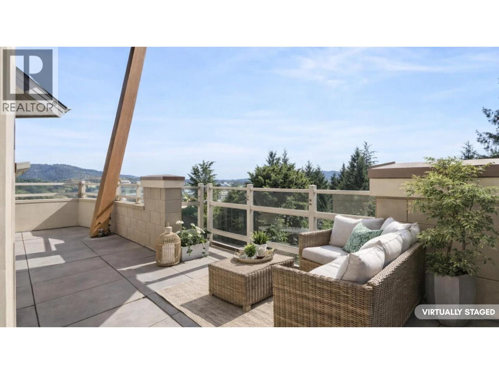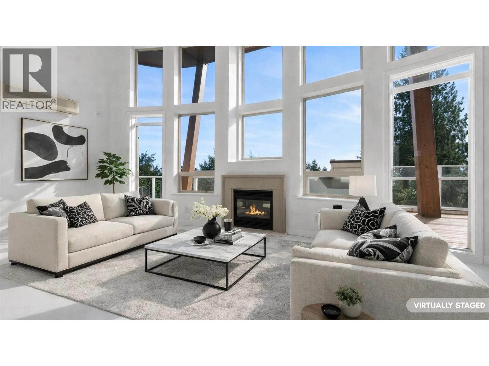STUNNING OCEAN, CITY & TREETOP FOREST VIEW SOUTHWEST EXPOSED PENTHOUSE! Soaring vaulted ceilings, 2 storey windows accented by "centered " heat producing gas fireplace. The moment you walk in the door of this home you are drawn to the wrap around balcony with easy access from all rooms! Enjoy the ocean views in the Primary bedroom while still in bed. The 2nd bedroom is huge & faces southwest with Magical Ocean, Vancouver Skyline & Treetop views! The floorplan is open concept with separate bedrooms, kitchen has been fully renovated & offers a center island with sink for easy entertaining & adorned with high end appliances, floating shelves & accent lighting. If your looking for complete privacy, top floor with loads of light, air-conditioning, then your search is over! See it soon! (32389660)