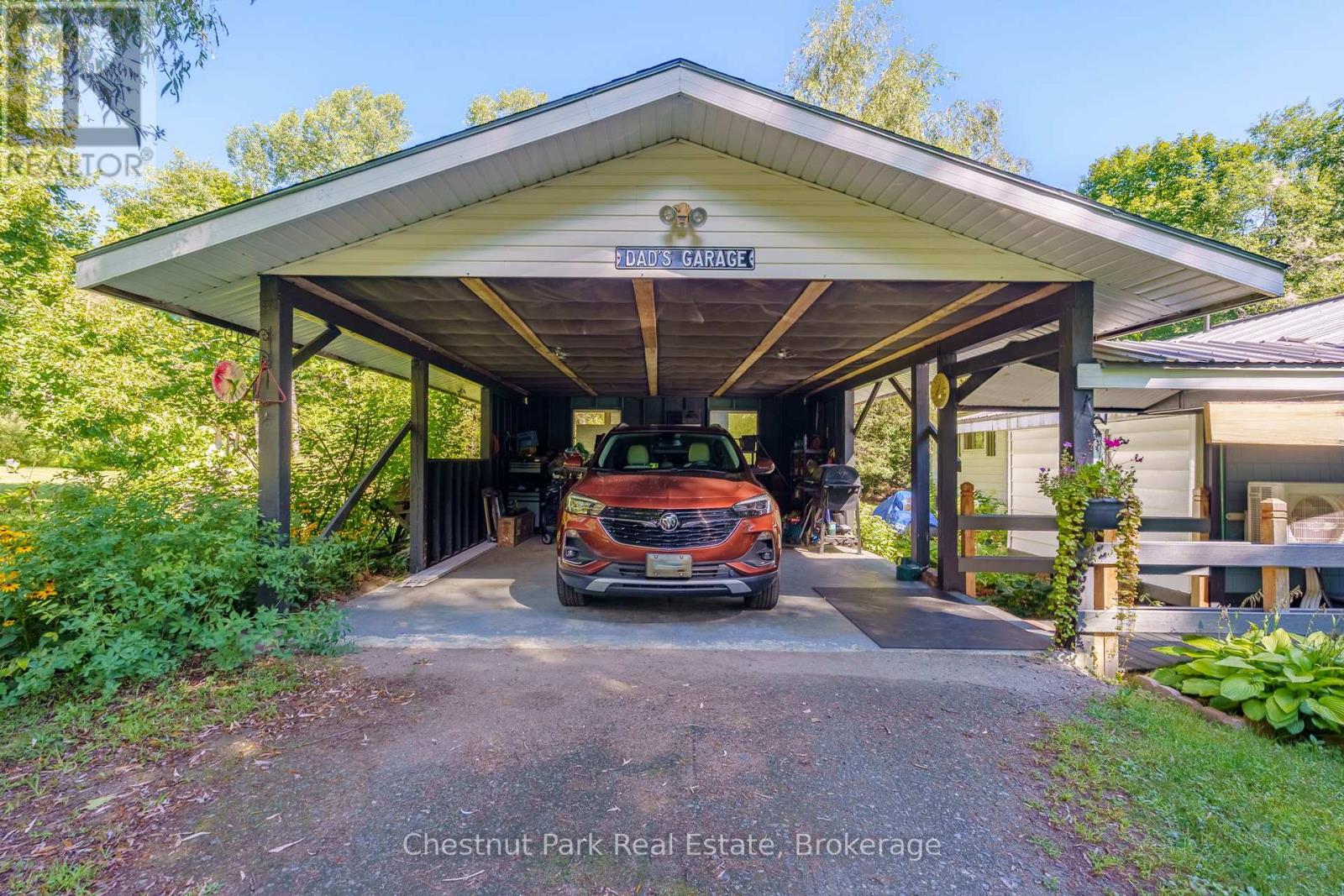 Welcome to this thoughtfully designed bungalow offering the ease and comfort of true one-floor living, set on just under an acre of flat, usable land. Tucked away on a quiet, low-traffic street, this property delivers peace and privacy while remaining only minutes from Highway 11 and the vibrant town centre of Bracebridge. Inside, you'll find a well-planned layout with everything conveniently at your fingertips. The main level features three generously sized bedrooms and a full bathroom with seamless entry, ideal for families, downsizers, or anyone seeking simplified living without sacrificing space. The kitchen is equipped with newer stainless steel appliances, blending modern functionality with a touch of country charm. Practicality shines with an oversized mudroom, seamlessly connected by a covered walkway to the 2008-built carport, offering two covered parking spaces and additional storage - a thoughtful Muskoka must-have for all seasons. The full basement adds exceptional versatility, complete with a second bathroom, living room, and a flexible layout that lends itself perfectly to guest accommodations, extended family living, a home office, or hobby space. Recent improvements include a metal roof (2019), updated electrical panel, two newer heat pump units providing efficient heating and cooling, and mostly new windows throughout - offering peace of mind for years to come.Outdoors, the property is surrounded by mature trees and landscaped gardens, with expansive level lawn space ideal for kids, pets, or relaxed outdoor entertaining. With direct access to OFSC snowmobile trails, year-round recreation truly begins at your doorstep.This home strikes the perfect balance of comfort, convenience, and charm - whether you're looking to downsize, start fresh, or enjoy a simpler lifestyle just outside of town. (42051135)