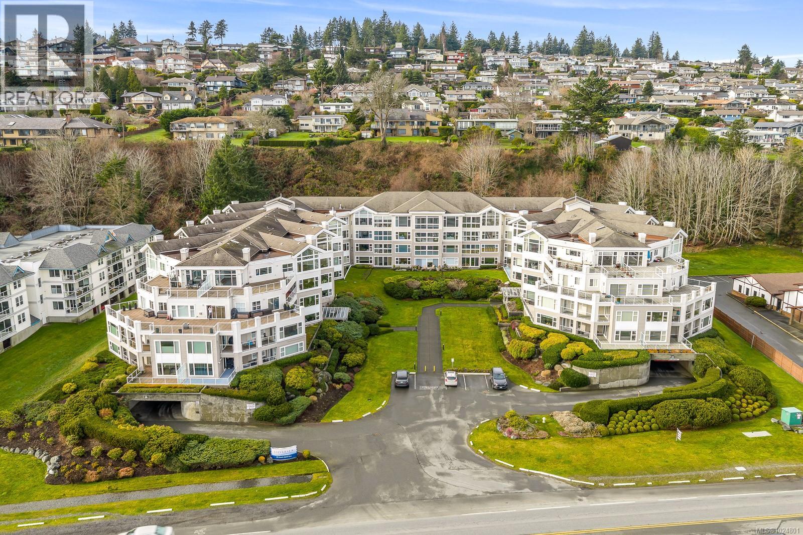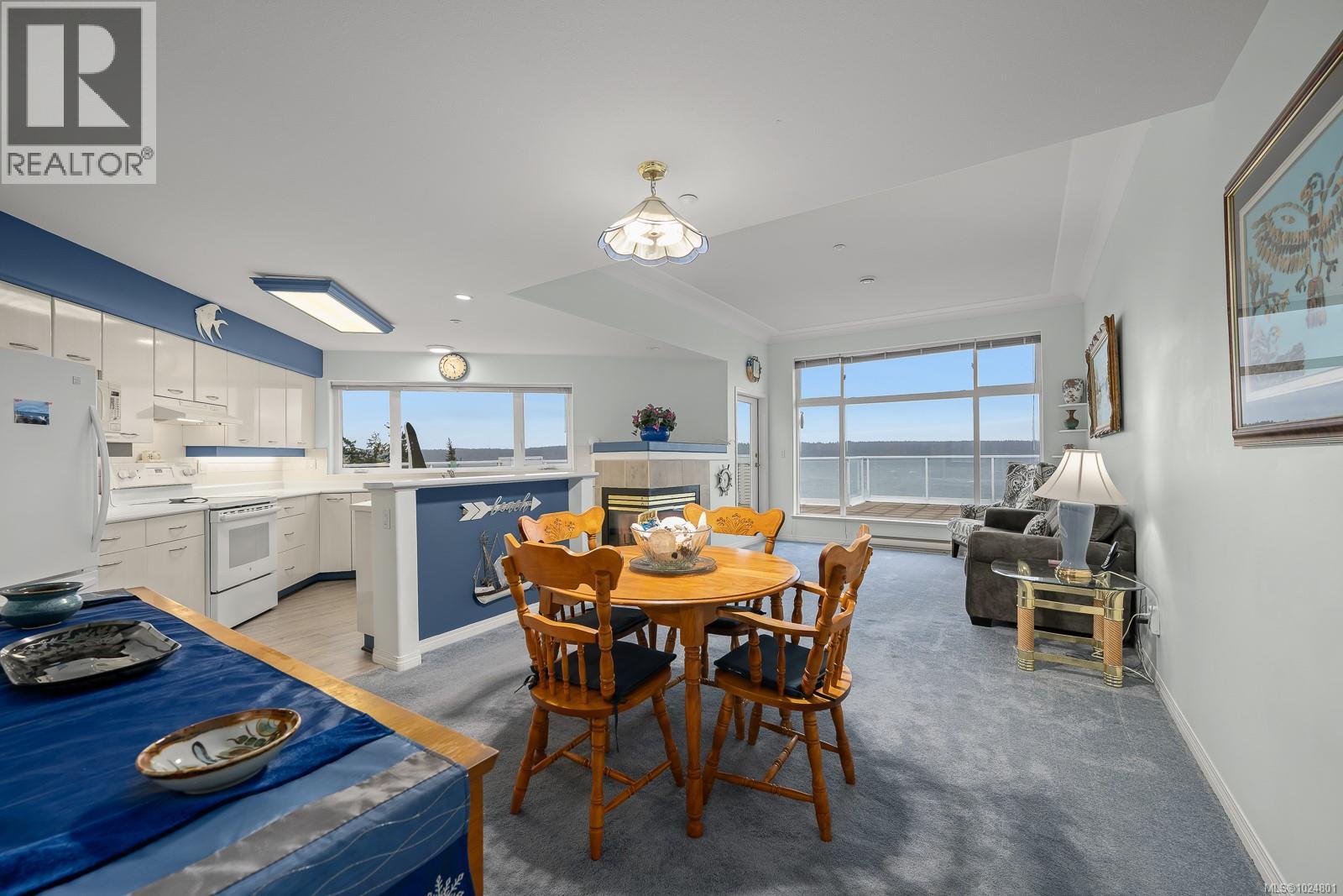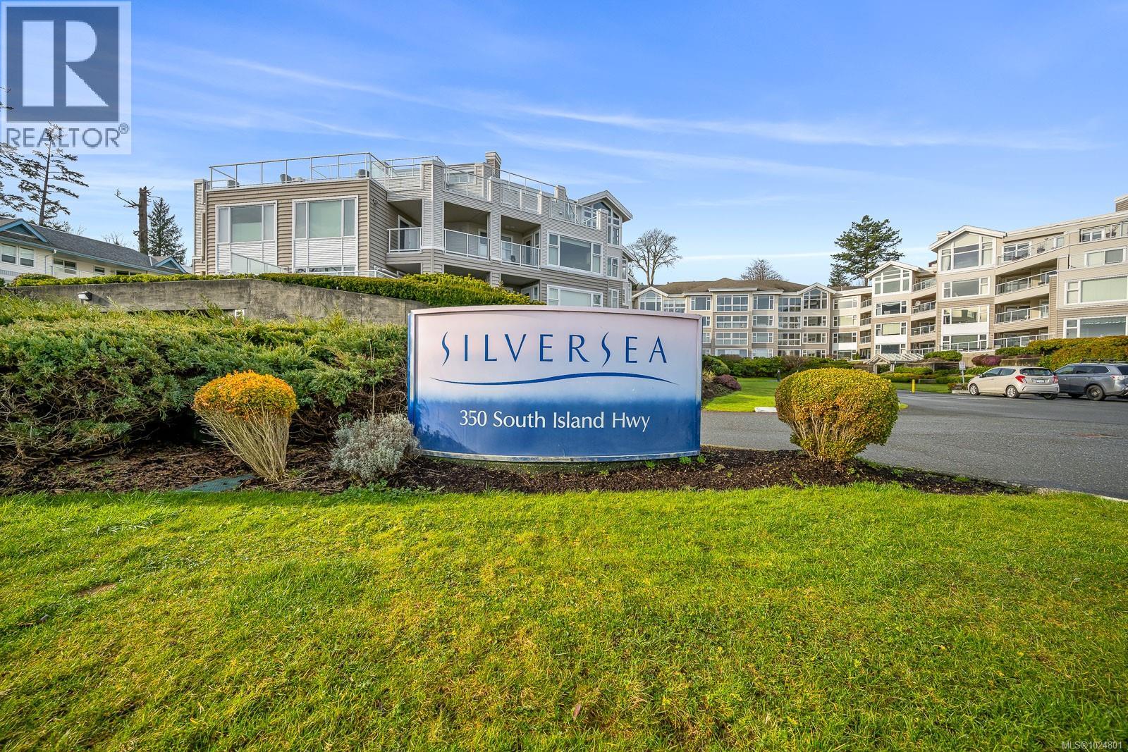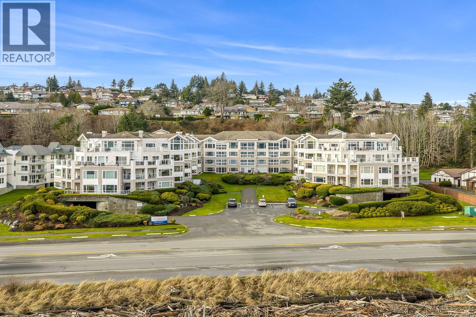 Welcome to Unit 404 at Silversea, a top-floor waterfront condo offering stunning ocean views and low-maintenance Island living. Take in the views across Discovery Passage toward Quadra Island and the Coast Mountains, with nature framed inside every window. This bright and thoughtfully designed home features three rooms: a primary bedroom, second bedroom, and a separate den/office, along with two full bathrooms. Vaulted ceilings in the primary bedroom create a bright, open feel, while the kitchen flows into the living area and view, complete with a gas fireplace. The defining feature of this home is the 700sqft wrap-around balcony, offering outdoor living space with room for entertaining and container gardening, plus an outdoor water faucet. Features include two underground parking stalls, a storage locker, no age restrictions, and a pet-friendly building. Amenities include a fitness room, guest suite, bike storage, three elevators, and convenient access via a dedicated turning lane. (30335261)