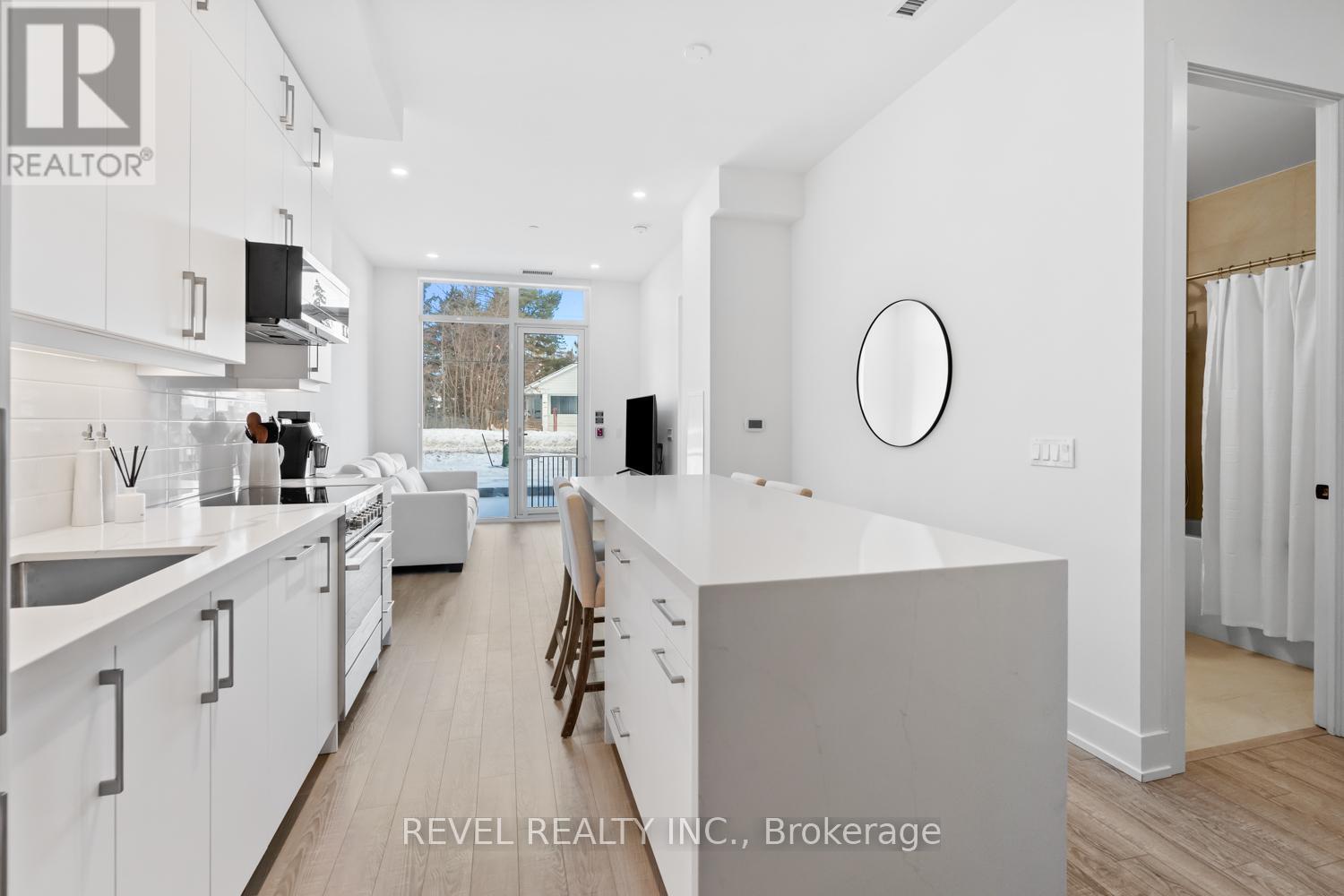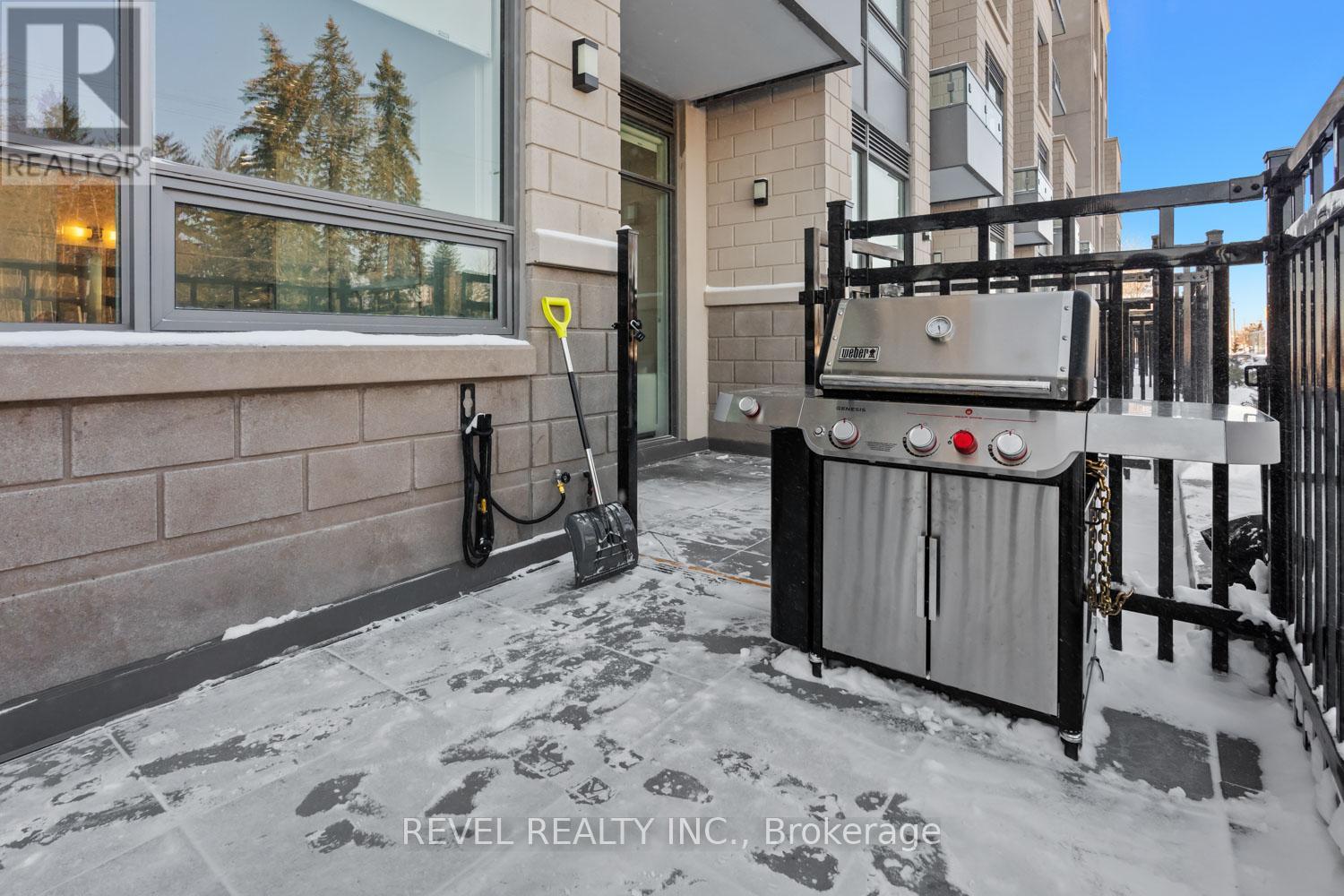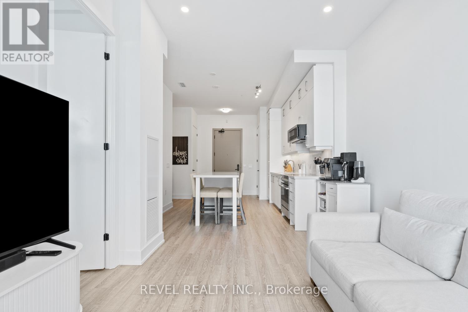 Welcome to Suite 123, a beautifully designed 667 sq. ft. unit + private outdoor patio. A residence that blends modern comfort with upscale, custom finishes. Featuring 10-foot ceilings and floor-to-ceiling windows in the living area, this home is filled with natural light and offers an airy, sophisticated atmosphere.The open-concept kitchen has been fully upgraded, showcasing custom cabinetry extended to the ceiling, integrated appliances with full size stove and microwave , and a stunning custom quartz countertop island with seating for up to 10-perfect for entertaining, hosting, or everyday living. Thoughtfully designed custom closets throughout elevate both function and style. A spacious den offers versatility as a home office or guest space, while two full bathrooms provide added convenience and privacy. Step outside from your private ground floor entrance to your walk-out terrace, complete with a dedicated gas line for bbq and water bib, creating an ideal setting for outdoor dining, entertaining, or relaxing evenings at home. Residents of King Terraces enjoy access to a curated collection of amenities, including a resort-style pool, sauna, steam room, rooftop terrace, fitness centre, elegant party lounge, and 24-hour concierge service. Suite 123 is where luxury design meets everyday ease-a rare ground-floor retreat with exceptional upgrades and seamless indoor-outdoor living. (42061921)