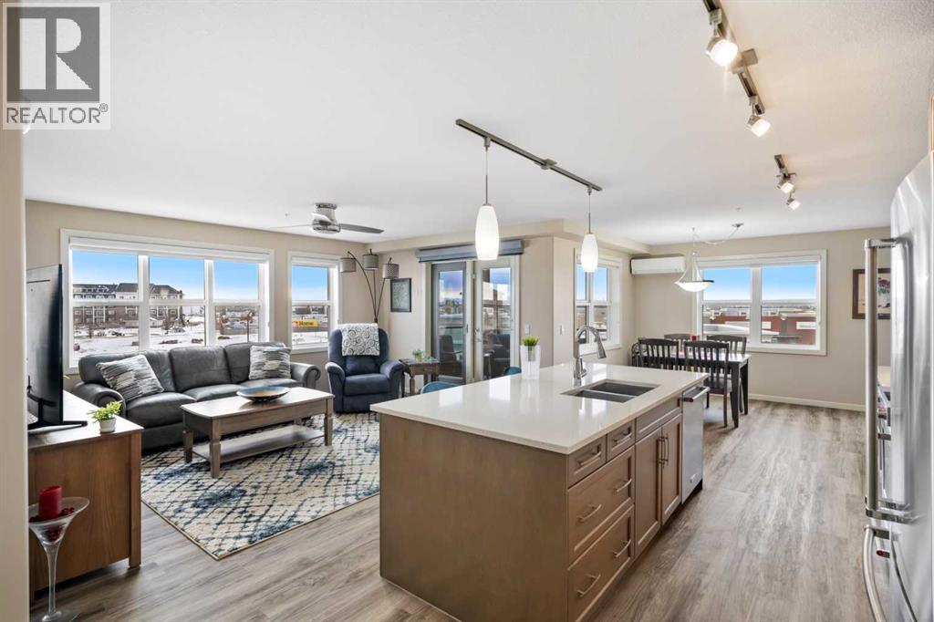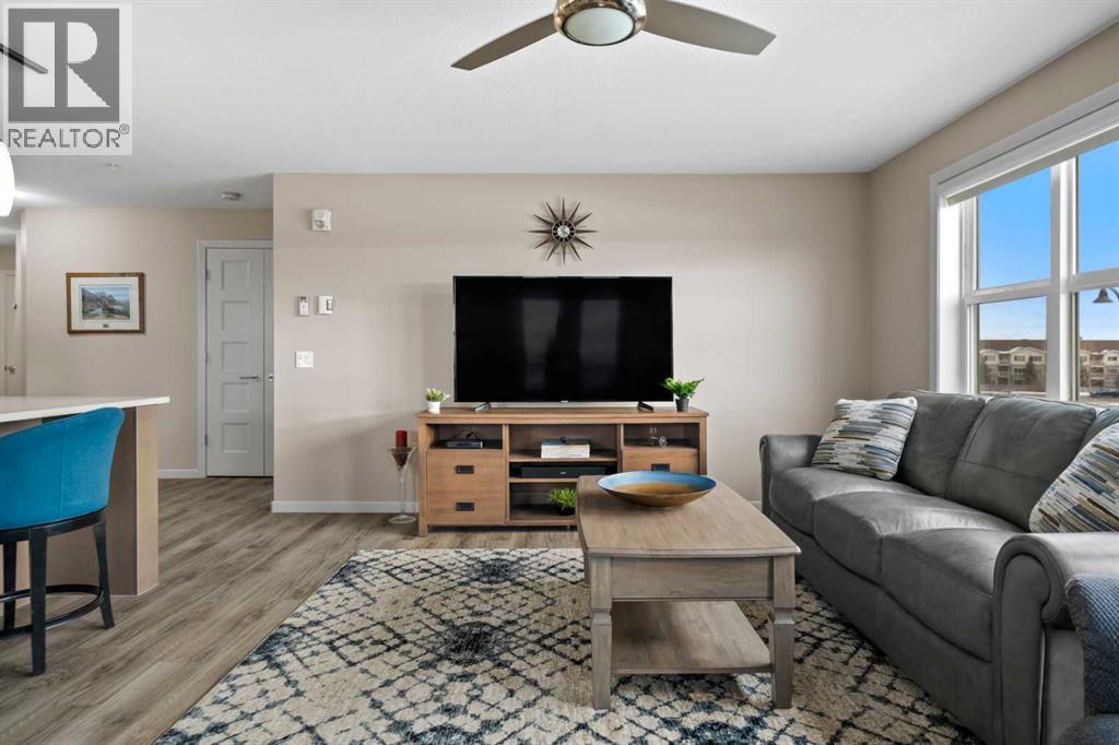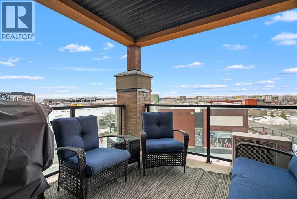 Welcome to #2310-10 Market Blvd! Airdrie's premier age restricted apartment complex, NEWLY age restricted to 55+. If you are looking to downsize in Airdrie, you will be hard pressed to find a building that compares to this one. This unit is a THIRD FLOOR, CORNER UNIT with SOUTHWEST exposure ensuring endless afternoon sun and INCREDIBLE NATURAL LIGHT throughout your home. Upon entering the unit, you are welcomed by a spacious foyer completed with a coat closet and an open, airy feel that immediately sets the tone for the home. Moving into the kitchen, it offers expansive, high-end cabinetry, granite countertops, a large island, beautiful light fixtures and stainless steel appliances. Designed for hosting, it opens seamlessly into the expansive living space with access to a spacious balcony, perfect for cozy evenings or morning coffee while enjoying the MOUNTAIN VIEWS. Just off your living space, you will appreciate a large, formal dining room that comfortably fits a six person table and is SURROUNDED by windows, a rare find in condo living. It is not every day that a unit like this hits the market, what is unique about it is that it offers TWO BEDS, 2 BATHROOMS + A LARGE DEN. The den is a versatile space ideal for a home office, exercise room, or additional storage. The PRIMARY bedroom is a true retreat, featuring a walk-through closet with built-in storage leading to a three-piece ensuite. This spa-like space includes a beautiful walk-in glass shower and a second vanity, ideal for getting ready in the morning. The second bedroom is equally spacious, offering two closets and direct access to the four-piece bathroom. You will also enjoy in suite laundry, beautiful vinyl flooring, remote controlled window coverings on the balcony doors, a garburator and many more upgrades. This unit offers TWO TITLED PARKING STALLS, one underground STEPS FROM THE ELEVATOR, the second one outdoors and a large assigned STORAGE LOCKER located down the hall on the same floor as your unit f or convenient access. Stay comfortable in the summer months with your A/C wall unit and ceiling fan(s). The Chateaux features a beautifully landscaped courtyard with a gas fireplace and an amenity room available for private bookings where residents gather to host regular happy hours, social hours or just getting together to visit. There's also a secure underground workshop for those who enjoy woodworking. Located in Kings Heights, you’re within walking distance to Save-On-Foods, Shoppers Drug Mart, banks, salons, restaurants and more - covering all your grocery, shopping, and healthcare needs. This building is truly designed for mature ownership, peaceful living and a vibrant social community. CALL FOR A PRIVATE VIEWING TODAY! (31595943)