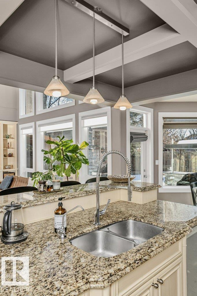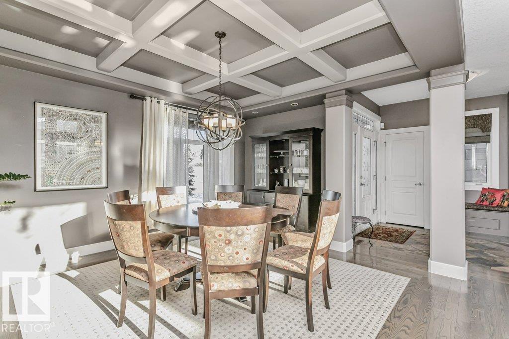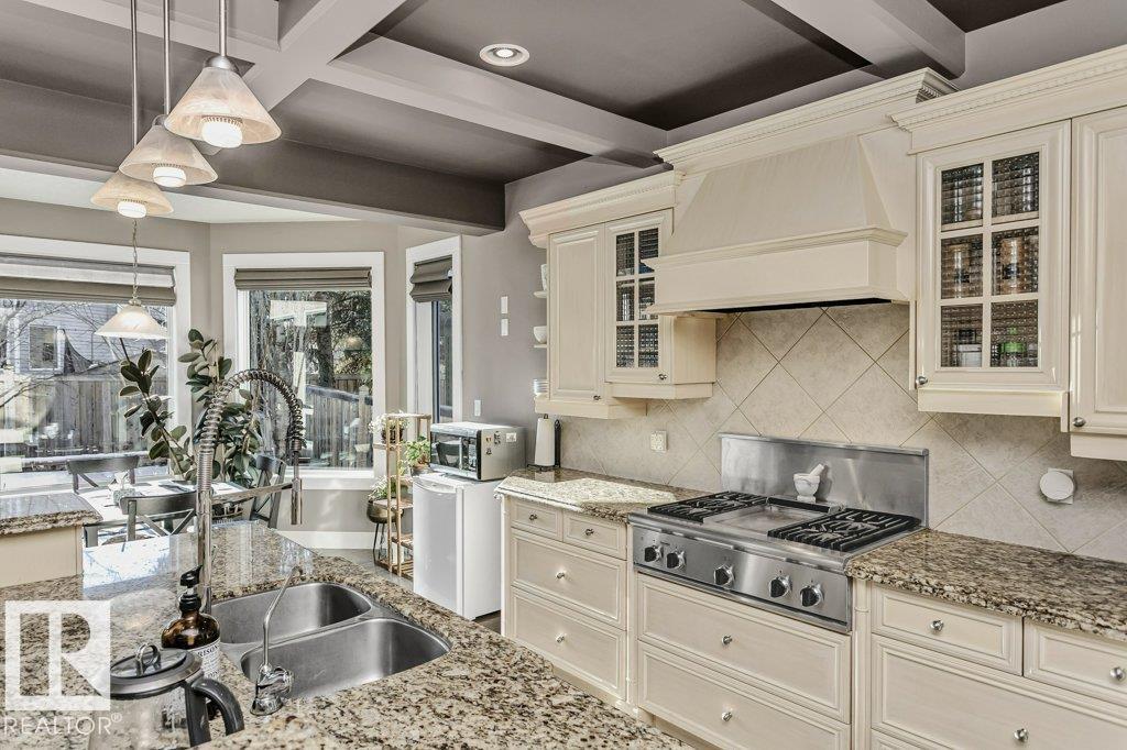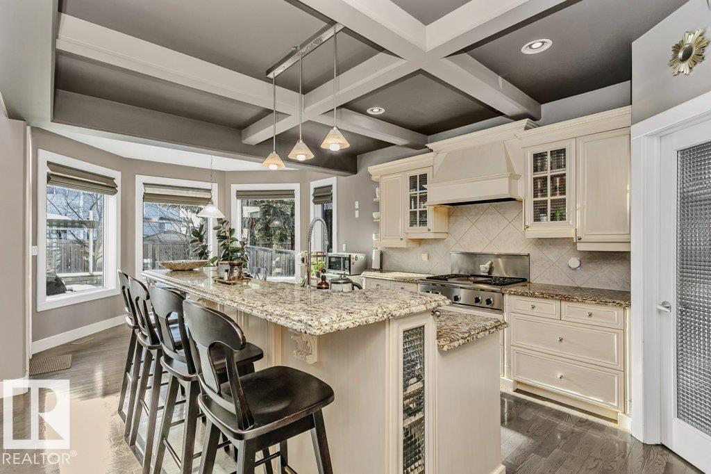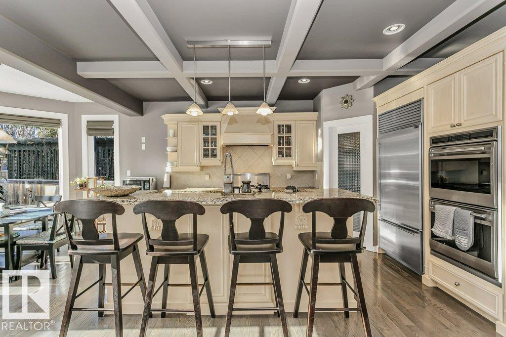 Outstanding Former Aacropolis showhome 2 storey 4198 total sq ft (incl basement)3+2 bedroom home in prestigious College Woods featuring an impressive great room design with formal dining area, soaring ceilings & natural light. Exceptional craftsmanship & quality throughout, including hardwood & ceramic tile, custom built-in wall units, & refined architectural details. The gourmet kitchen is equipped with glass-accent cabinetry, pot drawers, granite countertops, premium SS appliances, with a walk-through pantry to the laundry room & garage. The large primary suite has updated luxurious ensuite with jacuzzi tub & walk-in shower with glass-on-glass doors. Main floor den with double-sided fireplace, a unique upper level loft & a fully finished lower level ideal for family living & recreation. New A/C & Hot water tank. Aggregate driveway, $100,000 maintenance free backyard prof landscaped with flagstone patio, fireplace mature trees for privacy.Stylish curb appeal it’s the perfect choice. (33787197)