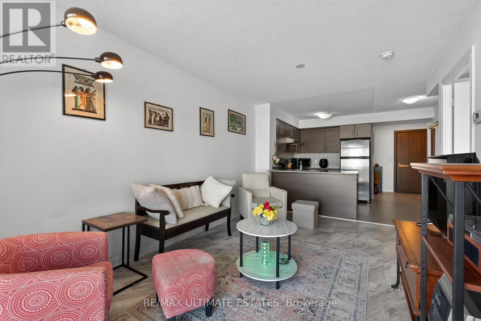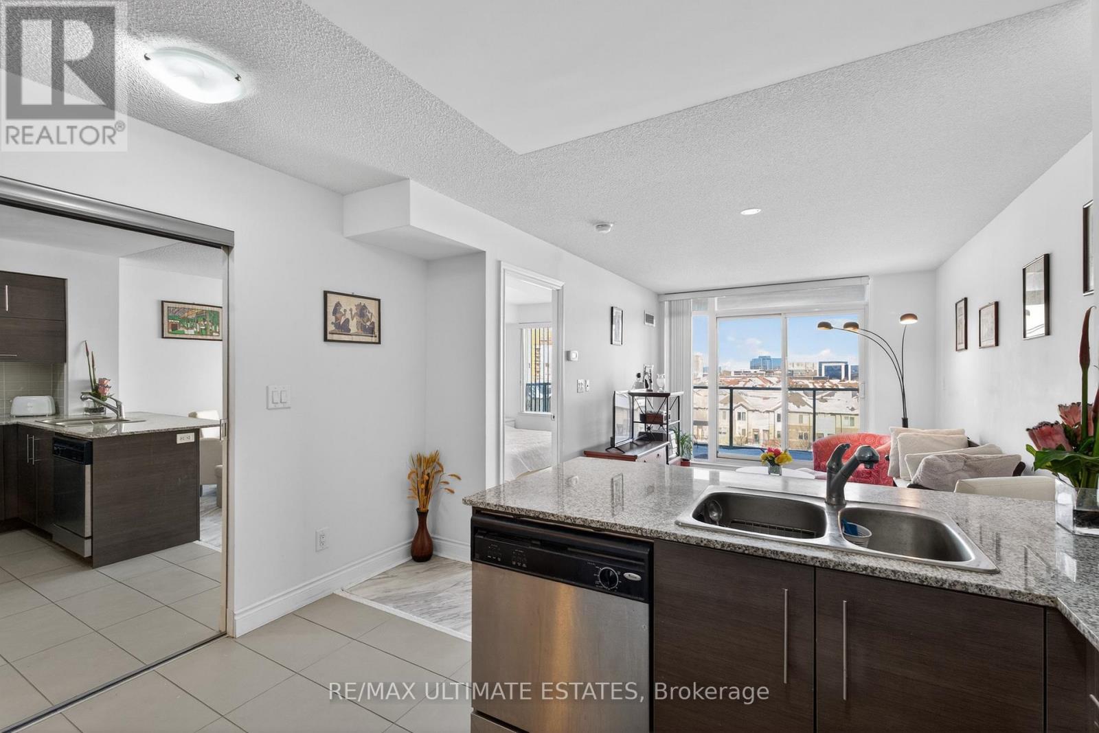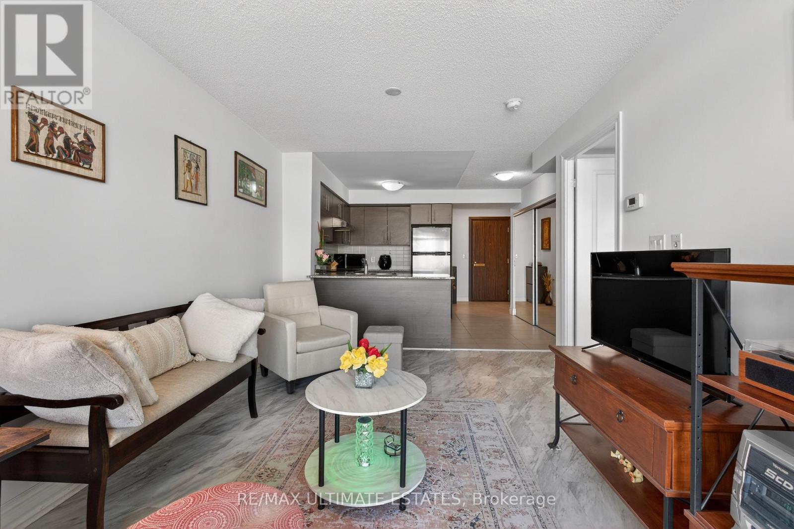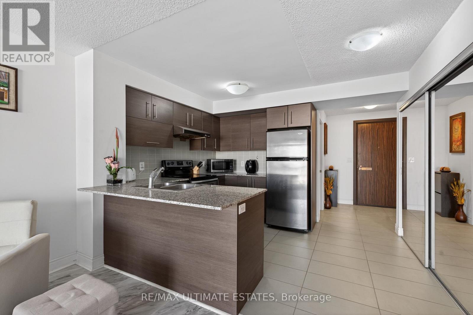 This exceptional residence offers unobstructed north and northeast views from a full-width balcony, with abundant natural light throughout the unit. The thoughtfully designed 1+1 layout features a spacious primary bedroom with a walk-in closet, along with a versatile den enclosed by French doors-ideal for a second bedroom or a home office. The open-concept kitchen is equipped with a breakfast bar, seamlessly connecting to the living space, while ensuite laundry adds everyday convenience. The unit includes one parking space and one storage locker. The building boasts an impressive array of amenities, including a swimming pool, fully equipped exercise centre, theatre room, card room, ping pong and billiards room, party room, guest suite, visitor parking, and 24/7 security with concierge service, as well as an on-site property management office. Beautifully landscaped grounds enhance the community, with a rear exit that opens directly into a park. Ideally located close to major highways, public transit, shopping, and dining, this property offers both comfort and outstanding accessibility. (42078189)