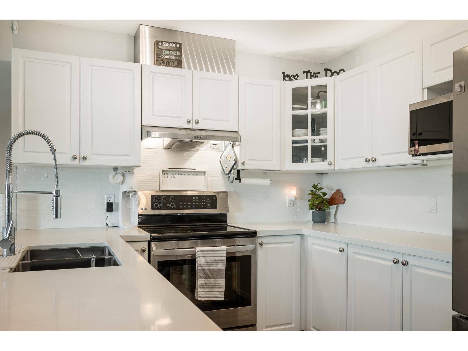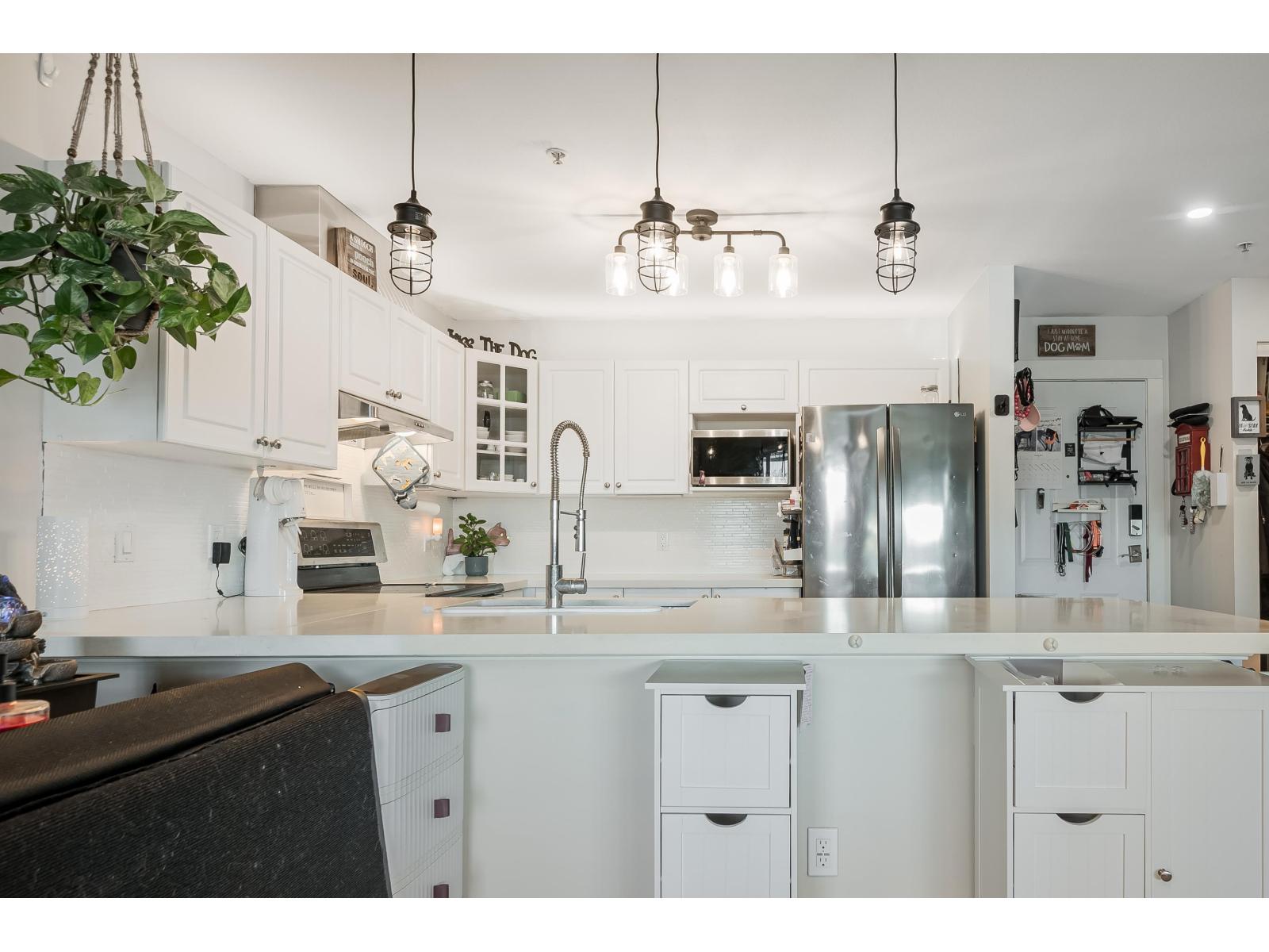 This stylish and spacious one-bedroom penthouse condo is the one you've been waiting for. Designed for entertaining, the kitchen features a generous quartz countertop, high-end lighting, and stainless steel appliances. The cheater ensuite boasts a stunning walk-in shower with matte black finishes, perfectly complemented by a brand-new vanity with quartz countertops.The primary bedroom is a dreamy, private retreat, while the sunny, covered patio offers a relaxing space and view of Mount Baker to enjoy year-round. An EV-ready 16AMP electric vehicle charger has recently been installed and is included in the sale. Book your private showing today-this exceptional home won't last long. OPEN HOUSE FEB 28, 12-2PM (32410885)