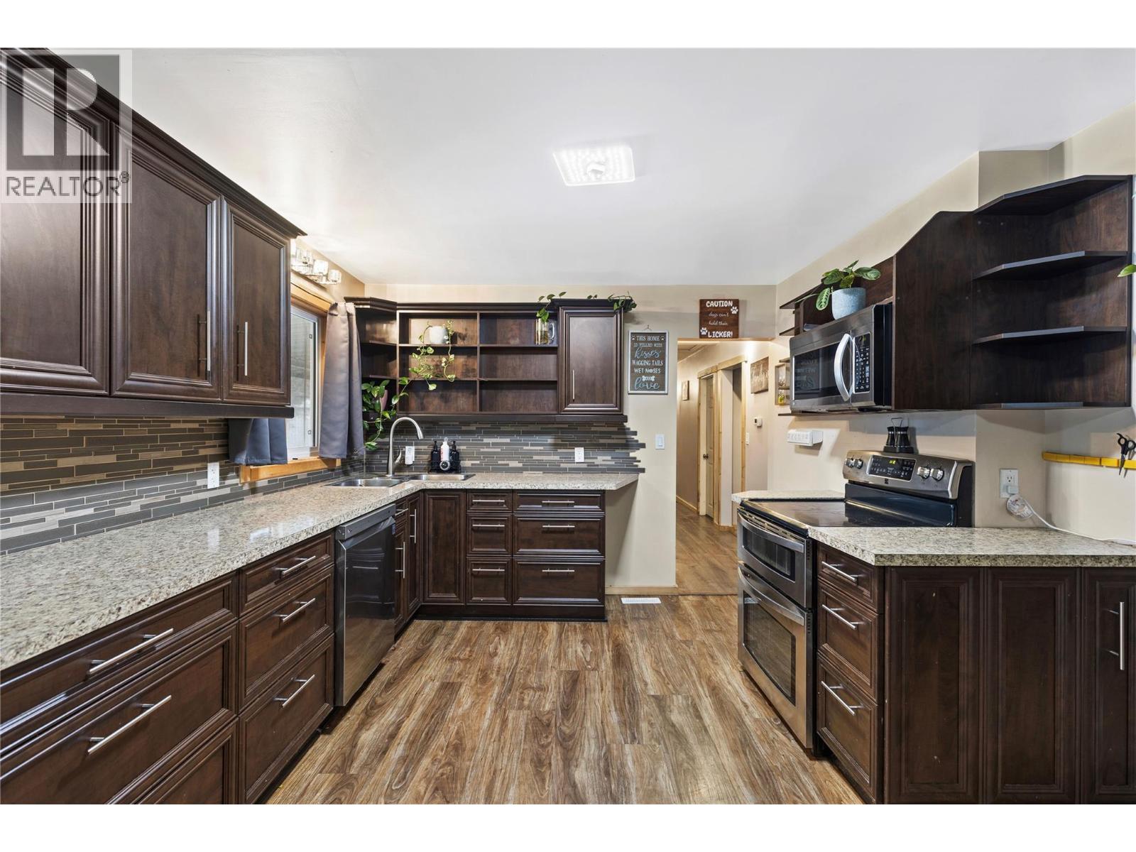 Spacious 0.64-acre property in central Barriere with mixed residential/commercial/light industrial zoning—ideal for a home-based business or future shop with ample parking for equipment & recreational toys. The updated home features 3 bedrooms on the main floor, including a primary suite with a 2-pc ensuite & private walkout to a covered deck & hot tub area. A bright living room with fireplace & updated laminate flooring flows into the custom 2016 kitchen, open to the dining area with direct access to the covered deck—ideal for year-round enjoyment. The partially finished basement offers excellent flexibility with separate outside entry, newer 3-piece bathroom, laundry, abundant storage, & space that could easily function as a rec room, playroom, or 4th bedroom. Significant upgrades provide peace of mind, including new windows and doors, updated gyprock, 200-amp electrical service, forced-air propane furnace and HVAC (2016), metal roof, and PEX plumbing (with some copper). Situated within walking distance to all Barriere amenities and just 45 minutes to Kamloops (39701023)