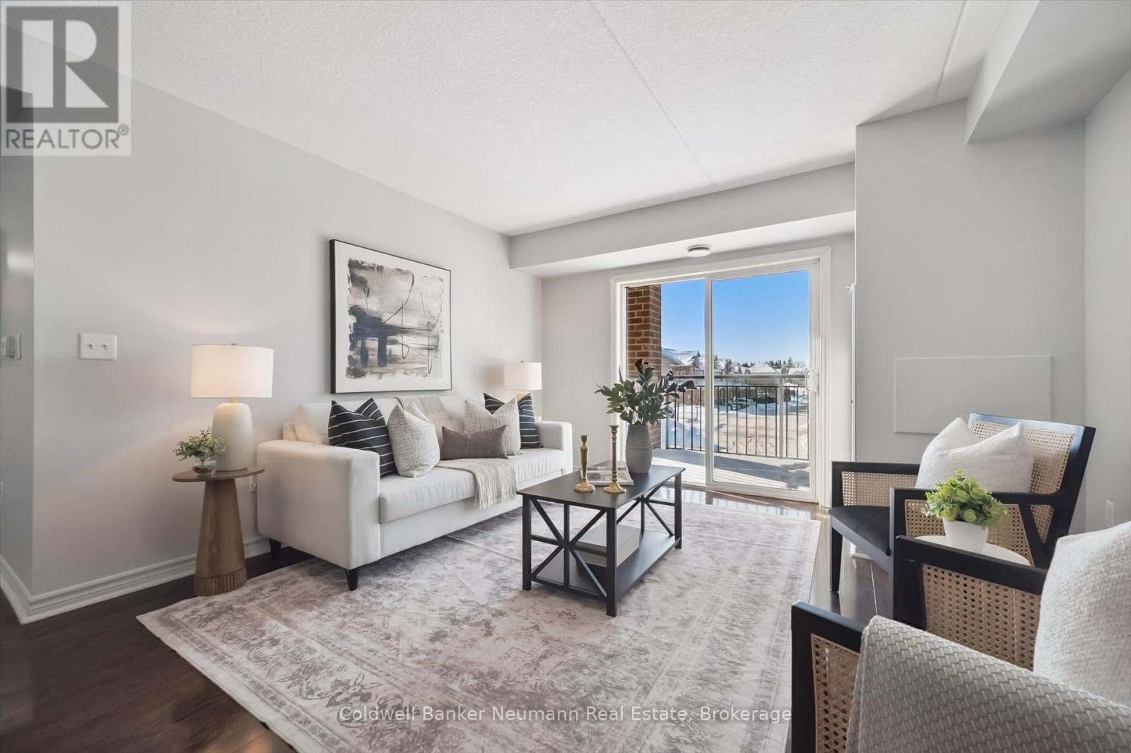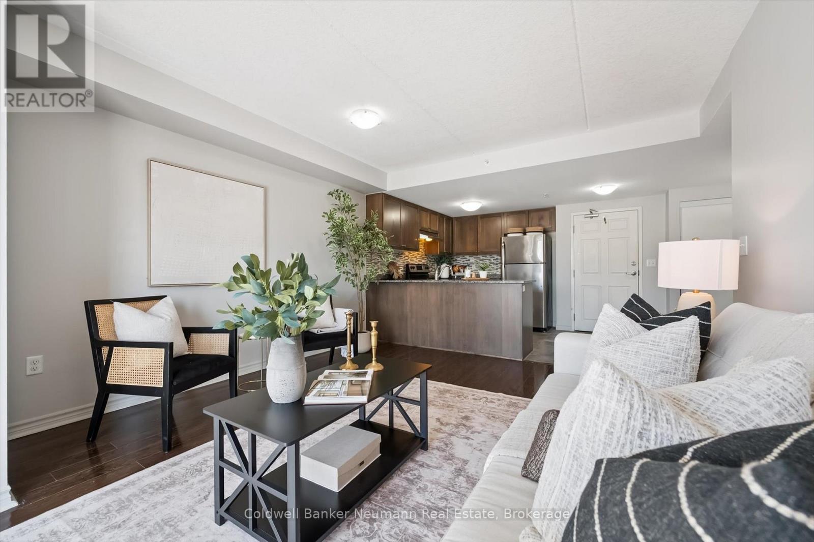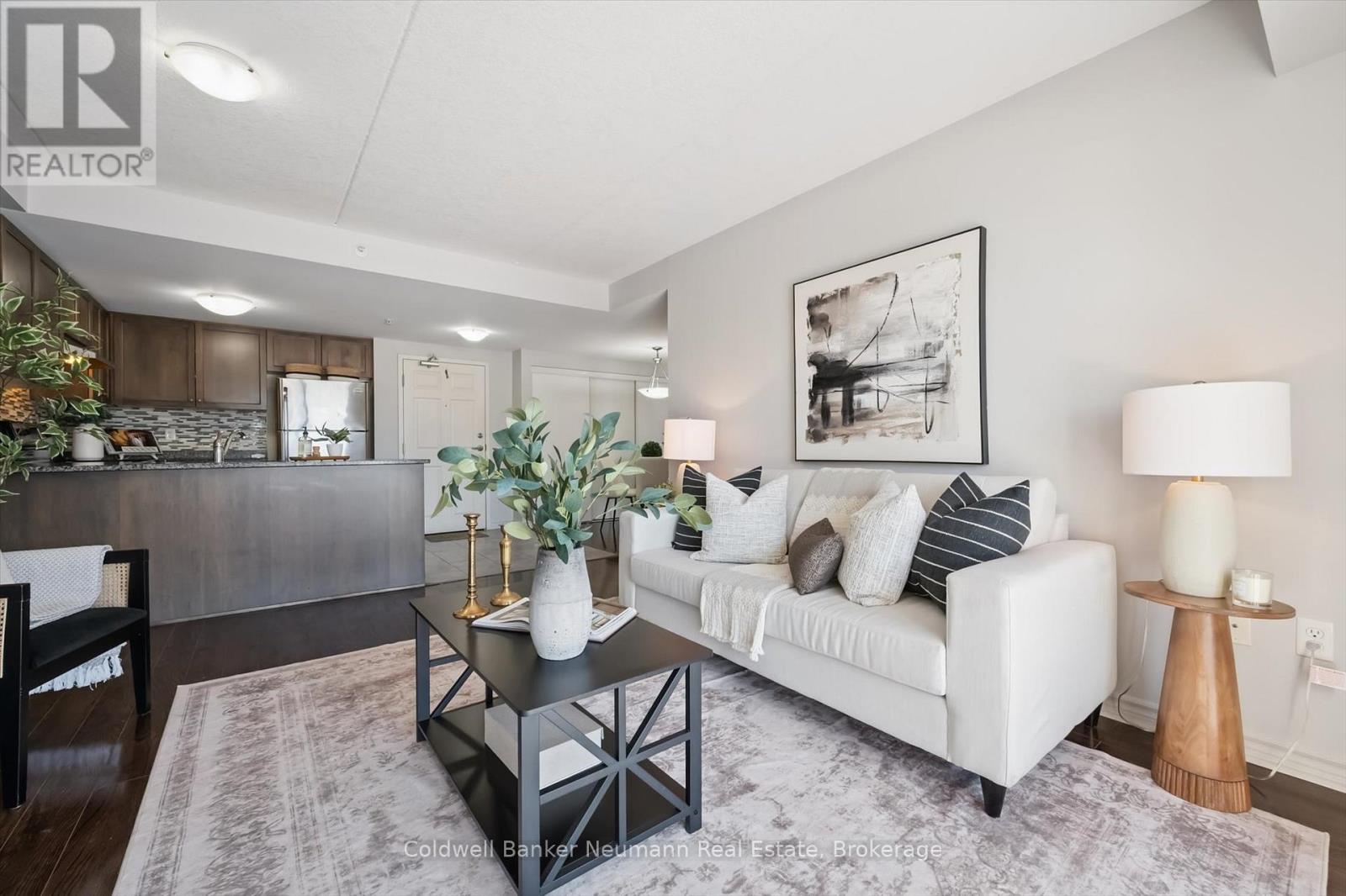 Welcome to 209-45 Kingsbury Sq! This bright and well-maintained 2 bedroom + den condo offers a smart, functional layout in the heart of South Guelph. The den has been thoughtfully converted into a dedicated dining space, opening up the living area and improving flow for everyday living and entertaining. The kitchen features granite countertops, modern cabinetry, a mosaic backsplash, and stainless steel appliances. Both bedrooms are generously sized, and the unit includes convenient in-suite laundry. Hard surface flooring runs throughout the entire home-completely carpet-free-with tasteful dark finishes, complemented by fresh paint throughout. Ideally located with quick access to the 401 and the major amenities along Clair Road and Gordon Street, and within walking distance to trails, schools, shopping, and parks-this is a move-in-ready opportunity in one of Guelph's most convenient neighbourhoods. (42087979)
