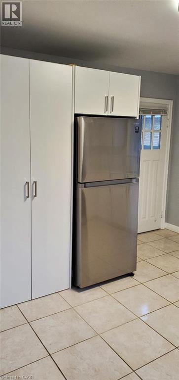 Kitchen featuring freestanding refrigerator, light tile patterned flooring, and white cabinetry