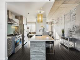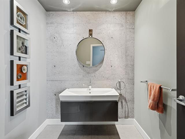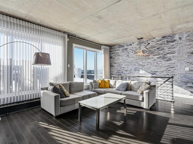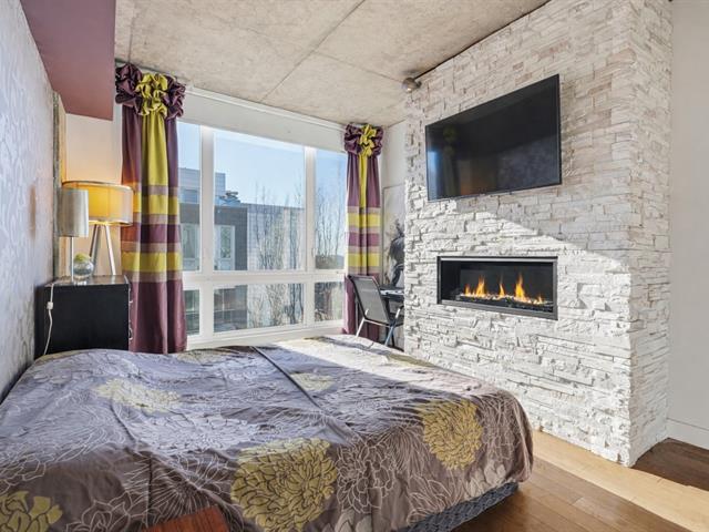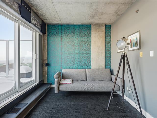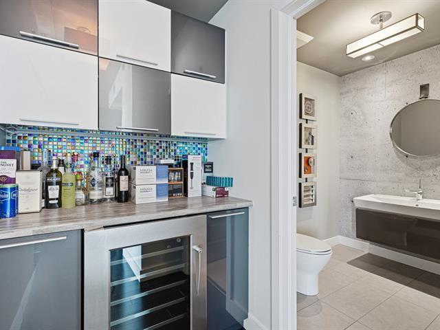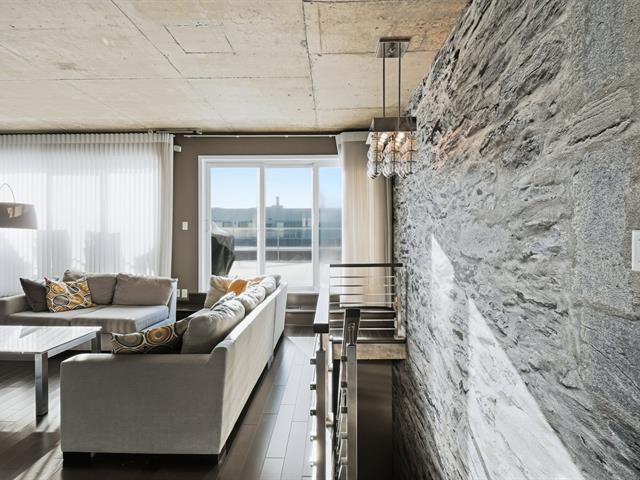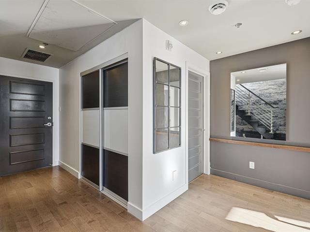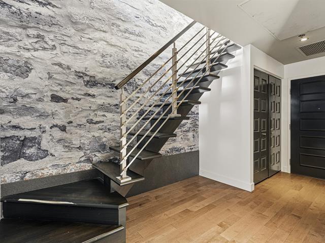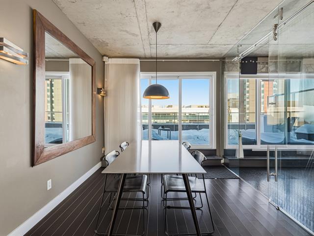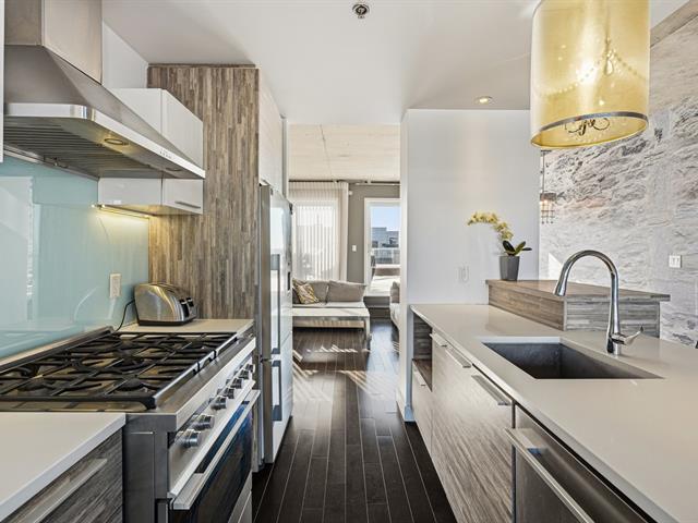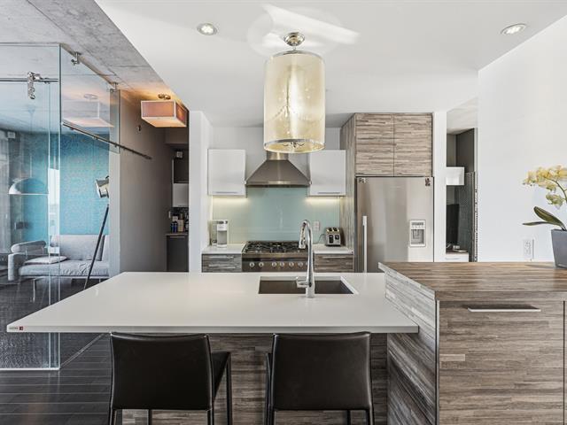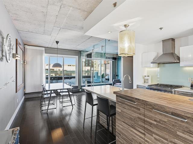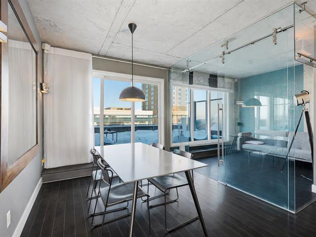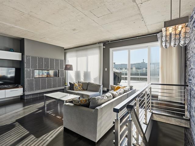 Two-level penthouse of 1,368 sq.ft., sold fully furnished, offering a bright and refined living environment. Nine-foot ceilings with exposed concrete finishes, hardwood floors, a modern central kitchen with quartz countertops and high-end Fisher & Paykel appliances. Open-concept living area with a gas fireplace and windows on two sides. Two expansive private terraces on either side of the unit provide optimal sun exposure and spectacular views of Montréal, the downtown skyline and sunsets, ideal for entertaining and enjoying the outdoors in complete privacy. A must-see! (43027663)