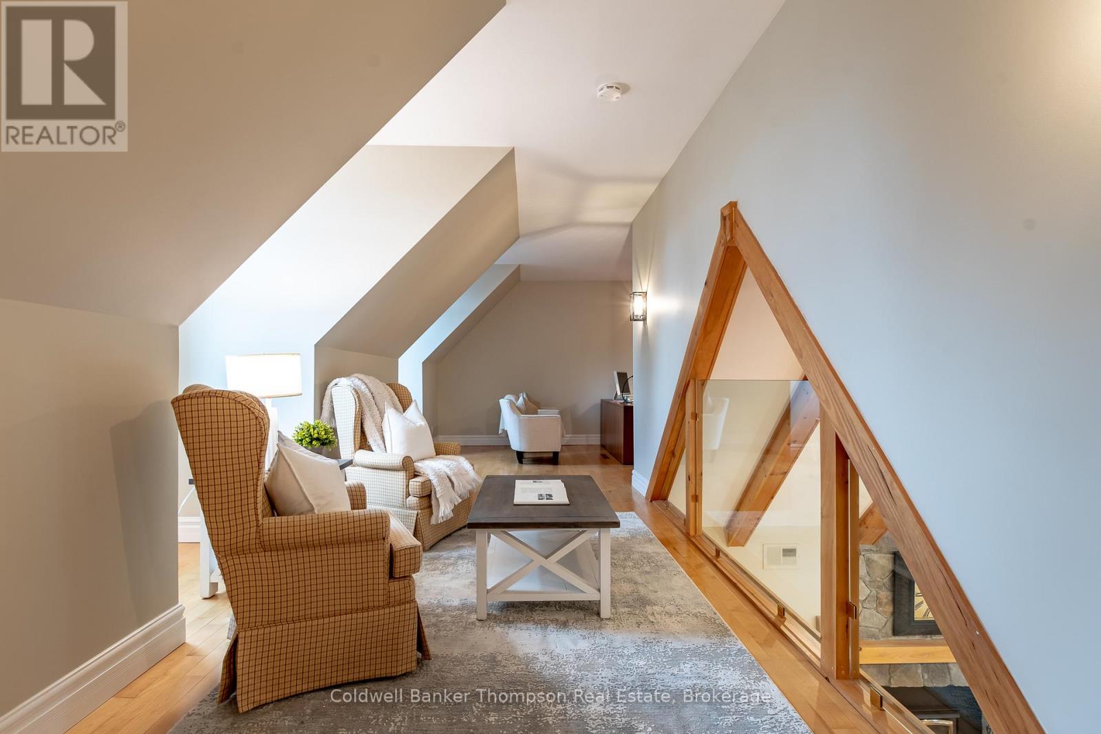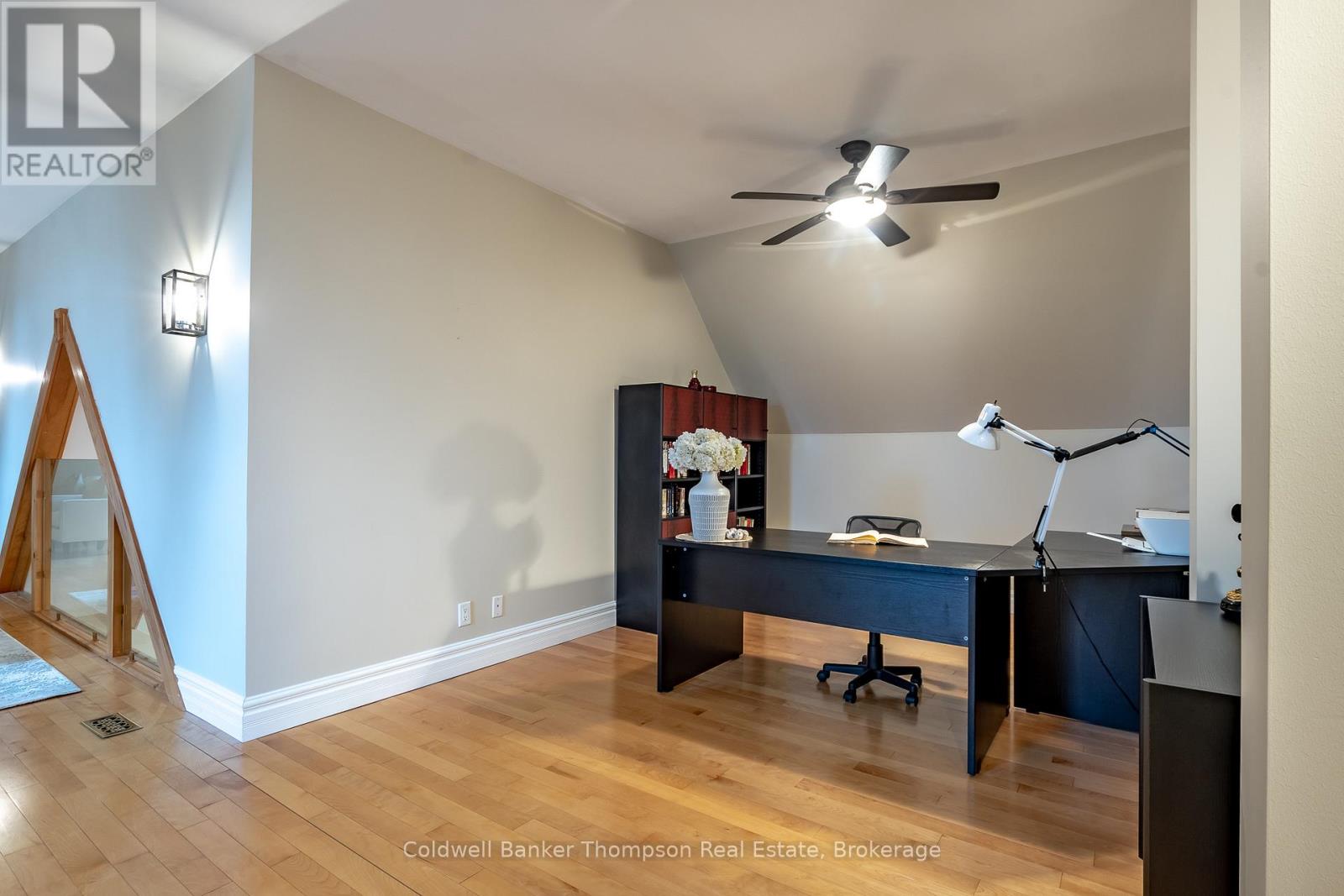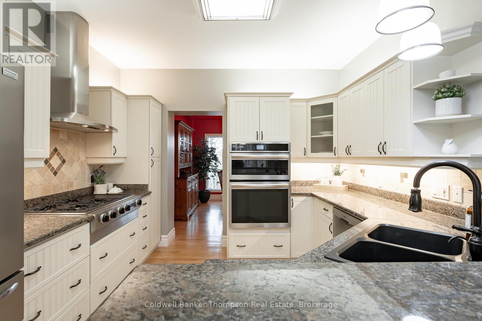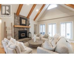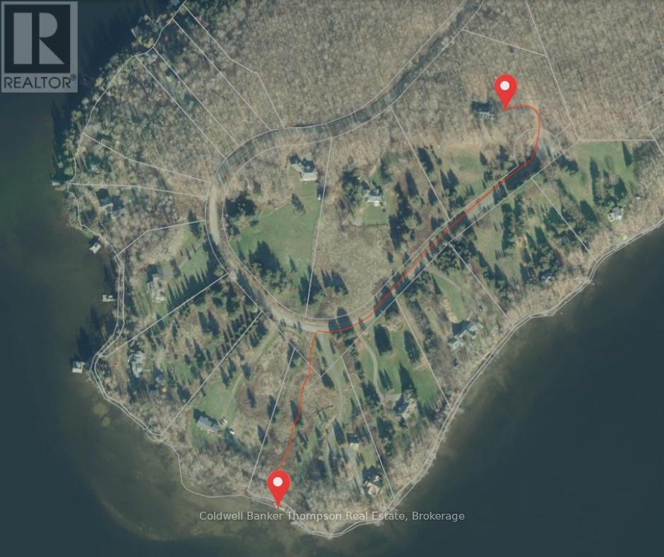 At the end of a quiet cul-de-sac, a meandering driveway leads through the trees to a stately home, accented by a covered front porch & classic dormer windows. Inside the spacious foyer, the formal dining room sits to the right, while the living room opens ahead, featuring a stone-accented wood-burning fireplace & a vaulted ceiling with faux wood beams. The kitchen offers granite counters, a propane cooktop, a built-in raised oven & microwave, & ample cabinetry, perfect for everyday cooking & entertaining. From the living room, two separate hallways extend to the guest bedrooms, creating excellent privacy. One hallway leads to a guest suite with a walk-in closet & 4pc ensuite. The other hallway connects to a second bedroom with an adjacent 3pc bathroom & a nearby den, ideal for quiet work or reading. On the opposite side of the main floor, the large primary suite feels like its own retreat, complete with a walk-in closet, faux-beam-accented vaulted ceilings, & a 5pc ensuite featuring a jetted soaker tub, shower stall, water closet, & double-sink vanity. Upstairs, the family room, with its propane fireplace, offers a comfortable gathering space, complemented by a convenient 2pc powder room. Beyond this, a generous open area is currently arranged as two separate office spaces, perfect for work-from-home flexibility or creative pursuits. Bell Fibre is installed at the property, providing excellent connectivity. Outdoors, the property enjoys private, deeded access to Peninsula Lake, shared with only two neighbouring properties, via a private, cleared hiking trail. The trail leads to a hard-packed sand entry & a private dock, offering a simple, convenient spot to launch a canoe or kayak, or even to dock your boat. The northeast boundary of this property adjoins the protected Pen Lake Farms Nature Reserve, creating a peaceful natural buffer & enhancing the quiet surroundings. This home offers thoughtful design, privacy, & a rare opportunity for private waterfront access. (42092751)