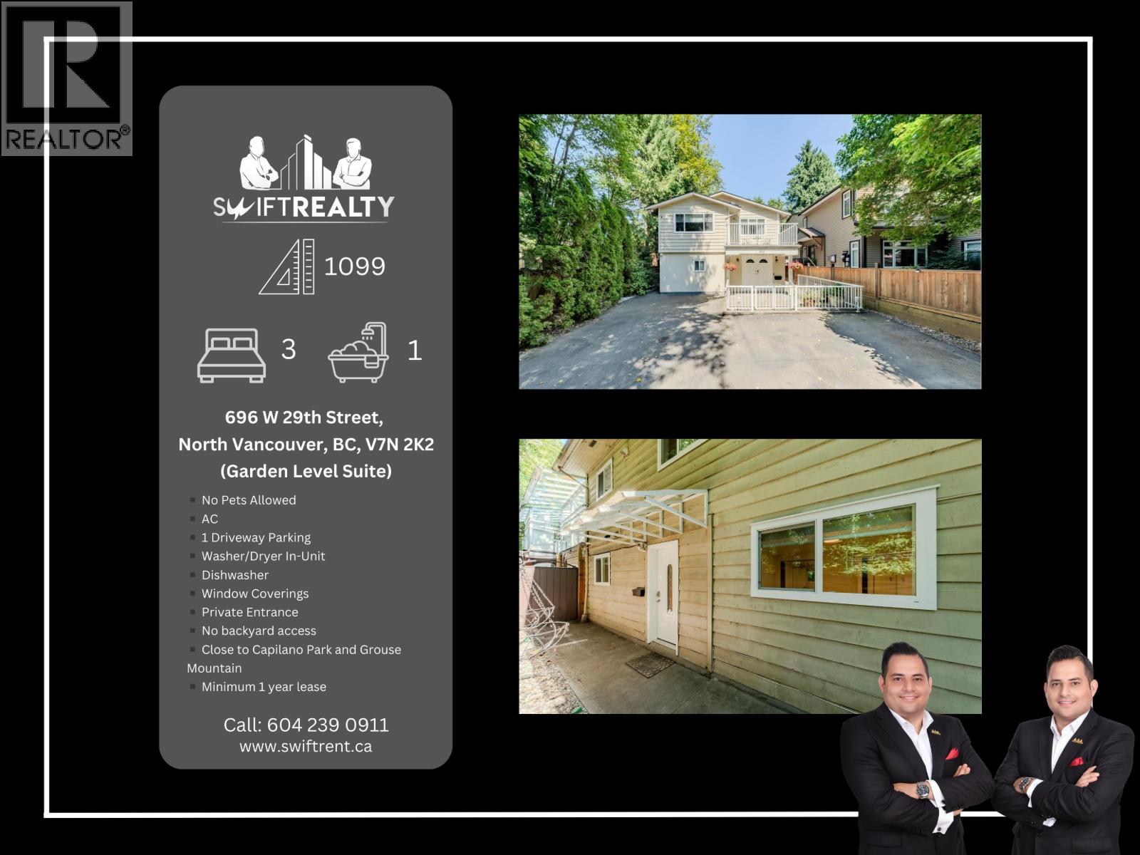 Welcome to Upper Lonsdale! This well-maintained 3Bed, 1Bath garden-level suite features large windows with window coverings, A/C, a dishwasher, and in-unit full-sized washer/dryer. Enjoy the comfort and convenience of a private entrance and one dedicated driveway parking spot. This suite features a functional kitchen with s/s appliances and a modern bathroom with white cabinetry and a glass shower. LOCATION: Conveniently located near Delbrook and Westview, this home provides easy access to Lonsdale, Downtown Vancouver, and the rest of the North Shore. Capilano Park, Grouse Mountain, and nearby walking trails are close by, with a bus stop just a one-minute walk away. Families will appreciate the proximity to Larson French Immersion Elementary School and quick access to HWY 1 for commuting. (32416944)