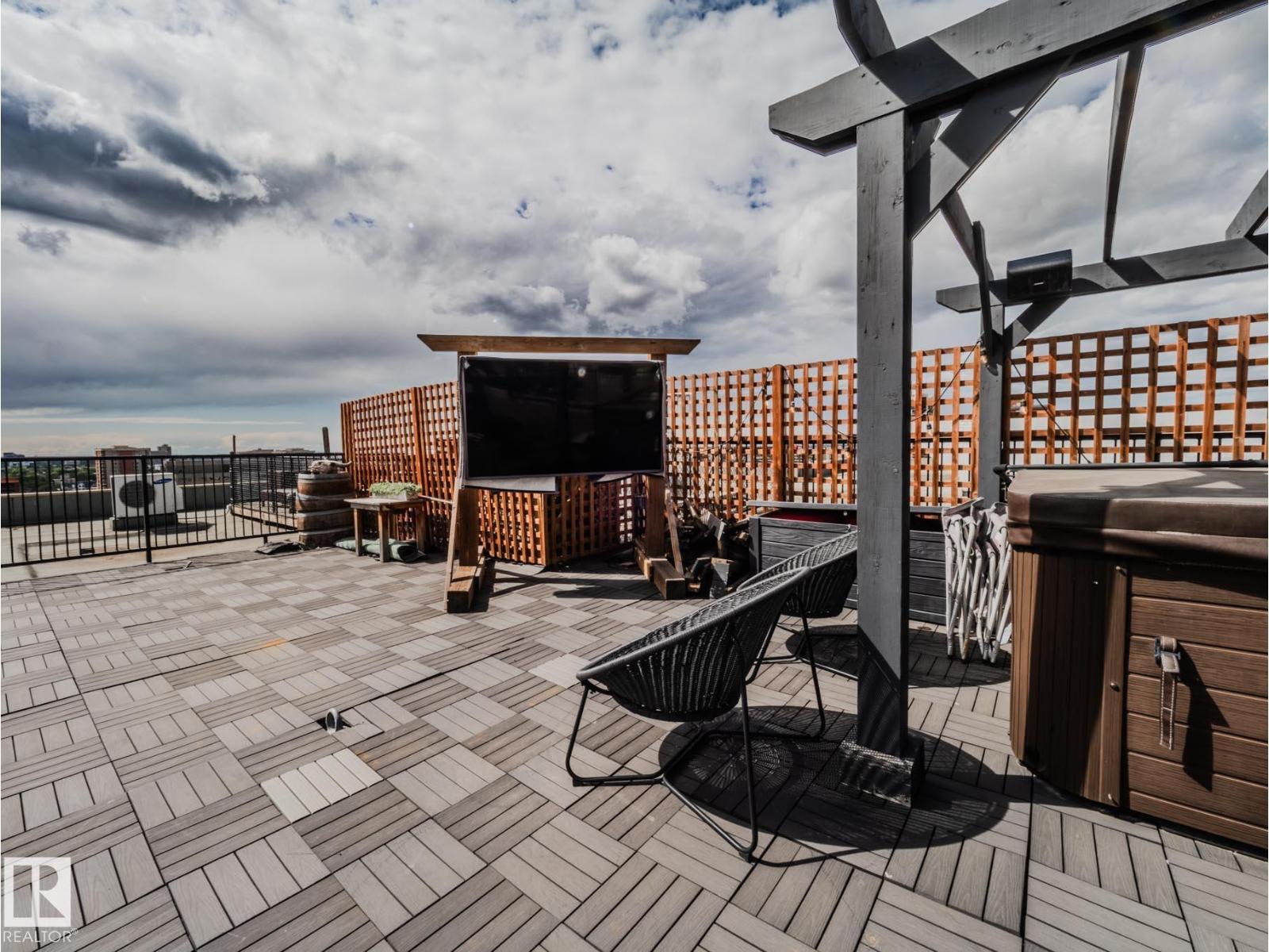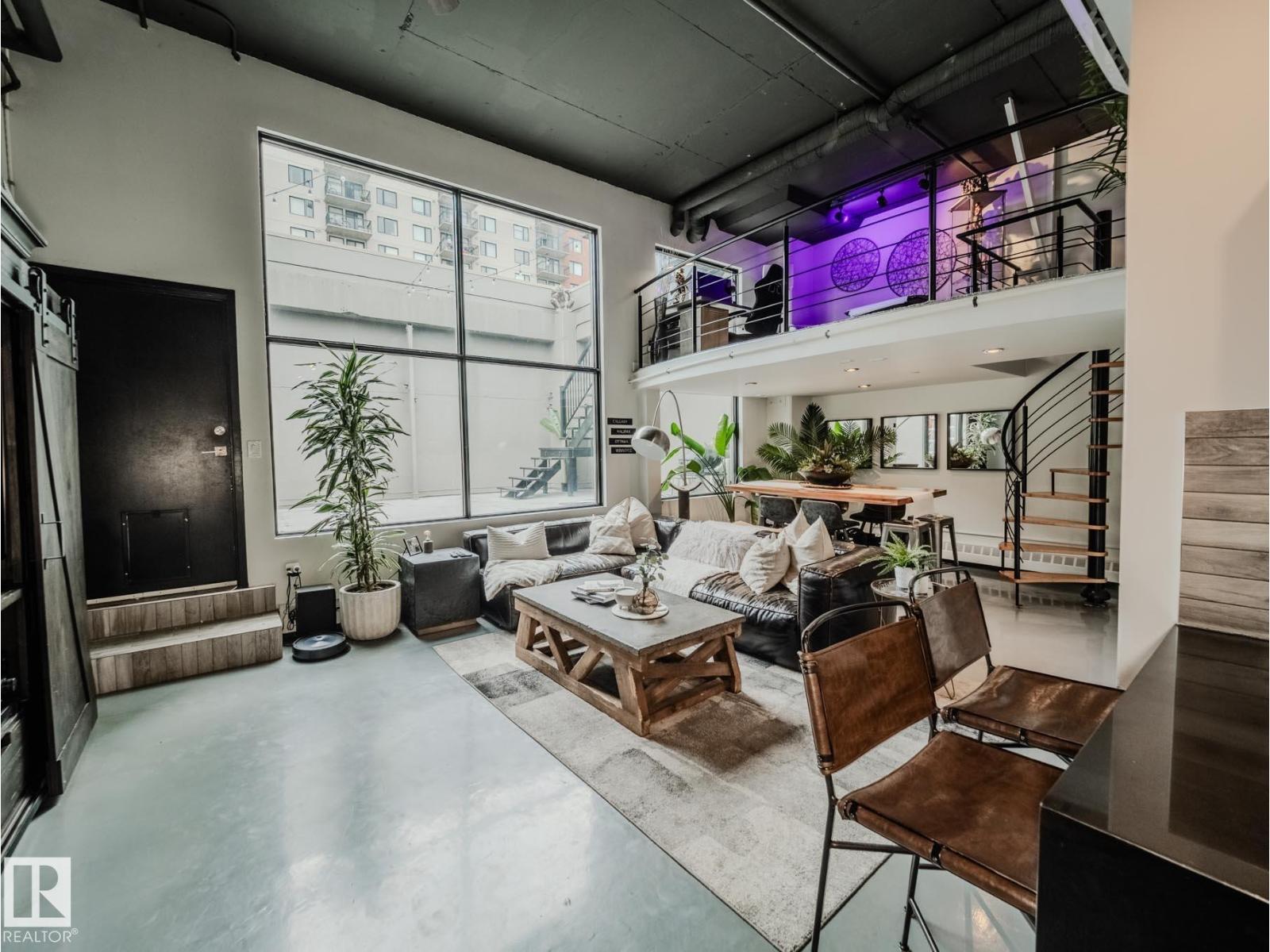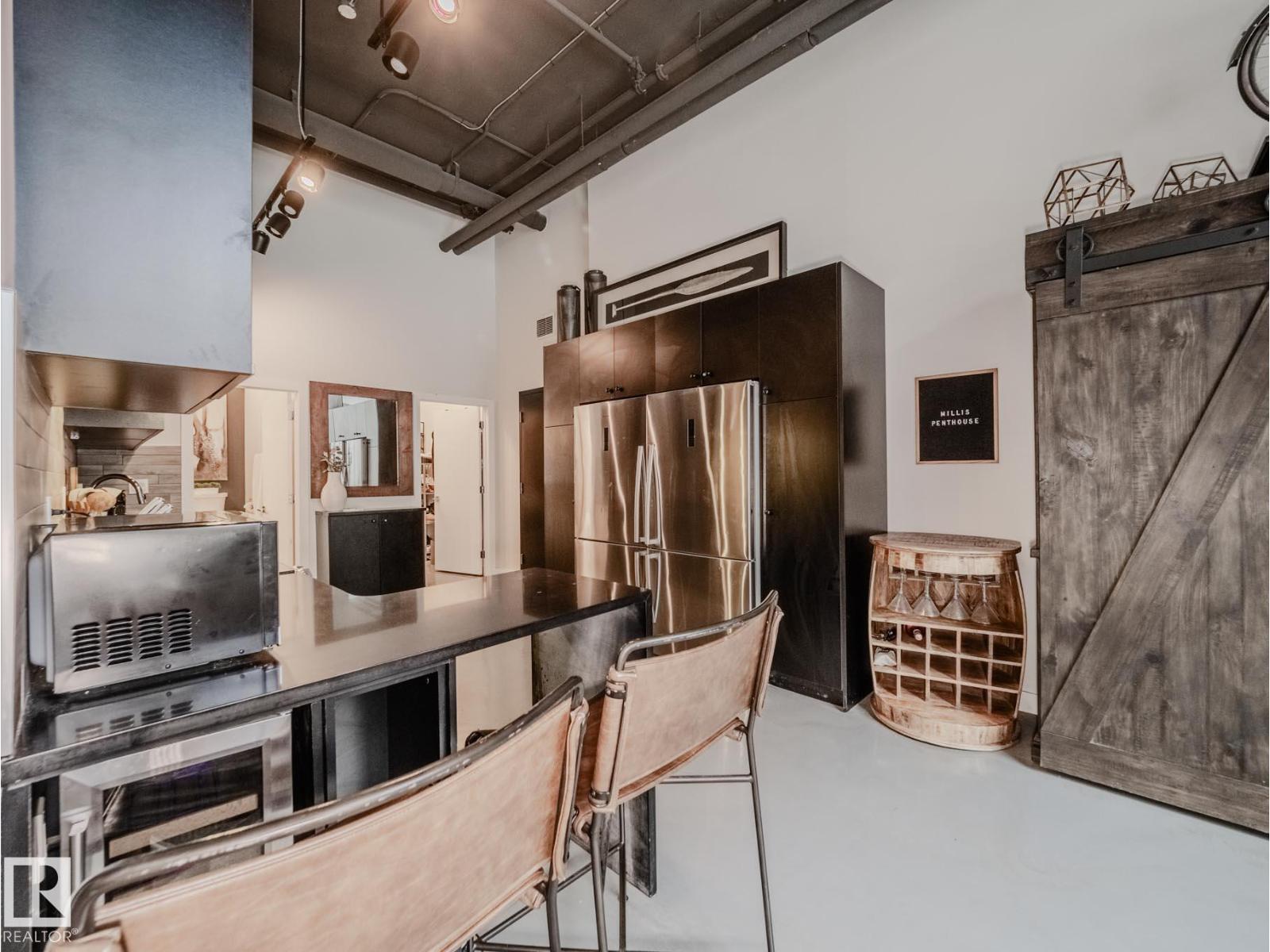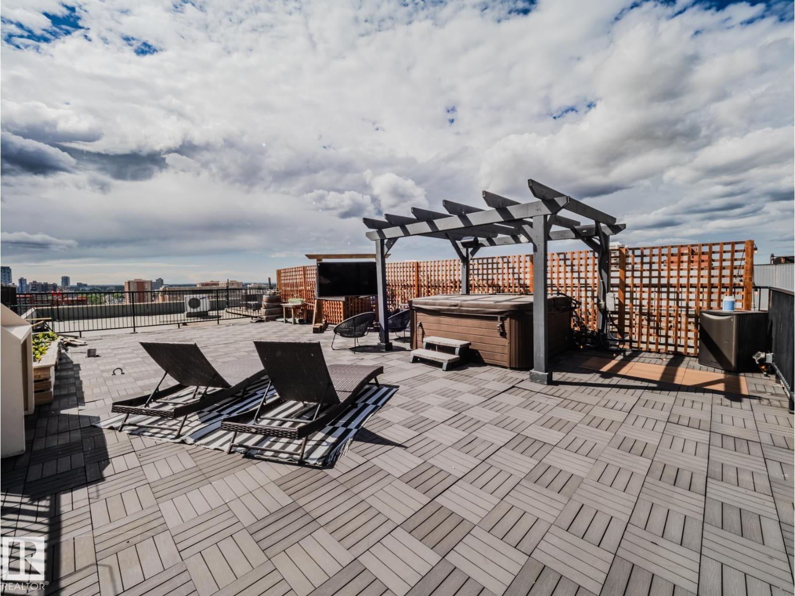 Discover this stunning downtown Edmonton PENTHOUSE LOFT featuring soaring 14-foot ceilings and an impressive open concept design. The spacious kitchen offers ample counter space, abundant storage, DUAL FRIDGES, and STAINLESS STEEL APPLIANCES—perfect for entertaining. The bright living room boasts large windows that flood the space with natural light and connect seamlessly to the open-to-below loft, ideal for an office or den. The large primary bedroom includes custom built-in closets and a SPA-LIKE ENSUITE with walk-in shower. A 4-piece bathroom, generous storage room, and IN-SUITE LAUNDRY add convenience. Enjoy outdoor living with a BRAND NEW 500sqft courtyard patio with a basketball hoop, plus a private 1,000 sqft ROOF TOP PATIO with outdoor TV and HOT TUB. Walk to Rogers Place and the vibrant Ice District. Titled UNDERGROUND PARKING, LARGE TITLED STORAGE LOCKER, SURROUND SOUND, AIR CONDITIONING and a pet-friendly building complete this one-of-a-kind urban retreat. (33802741)