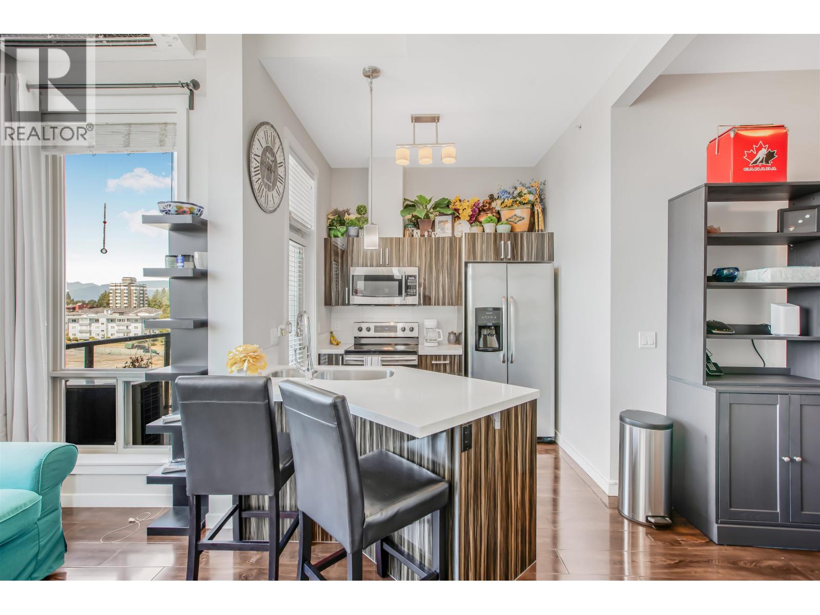 Welcome to 223rd North! Come checkout this unique, lovely 1 Bed Studio Penthouse in Downtown Maple Ridge with up to 14ft vaulted ceilings! Built in 2013, this unit come with White Quartz Countertops, Stainless Appliances, luxury thick dark mahogany coloured laminate flooring, built-in Electric fireplace & a Strata Approved professionally installed Air-Conditioning/heat-pump unit to keep you cool in the summer and warm in the winter. Unobstructed South, South-West, North-West views. In-suite Laundry and tons of closet space for all your belongings. Absolutely in perfect condition. An ultimate walk-score of 96 with Walmart, Haney Place Mall, Acts Centre, Leisure Centre, Club 16 Fitness, Banks and Restaurants with Beckett/Dog Park 100m away. (32417707)